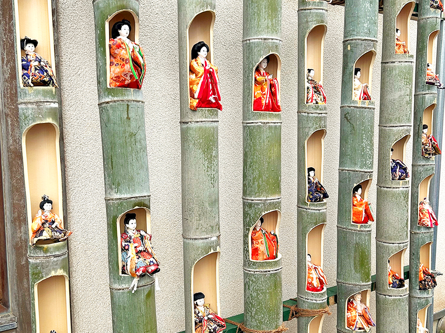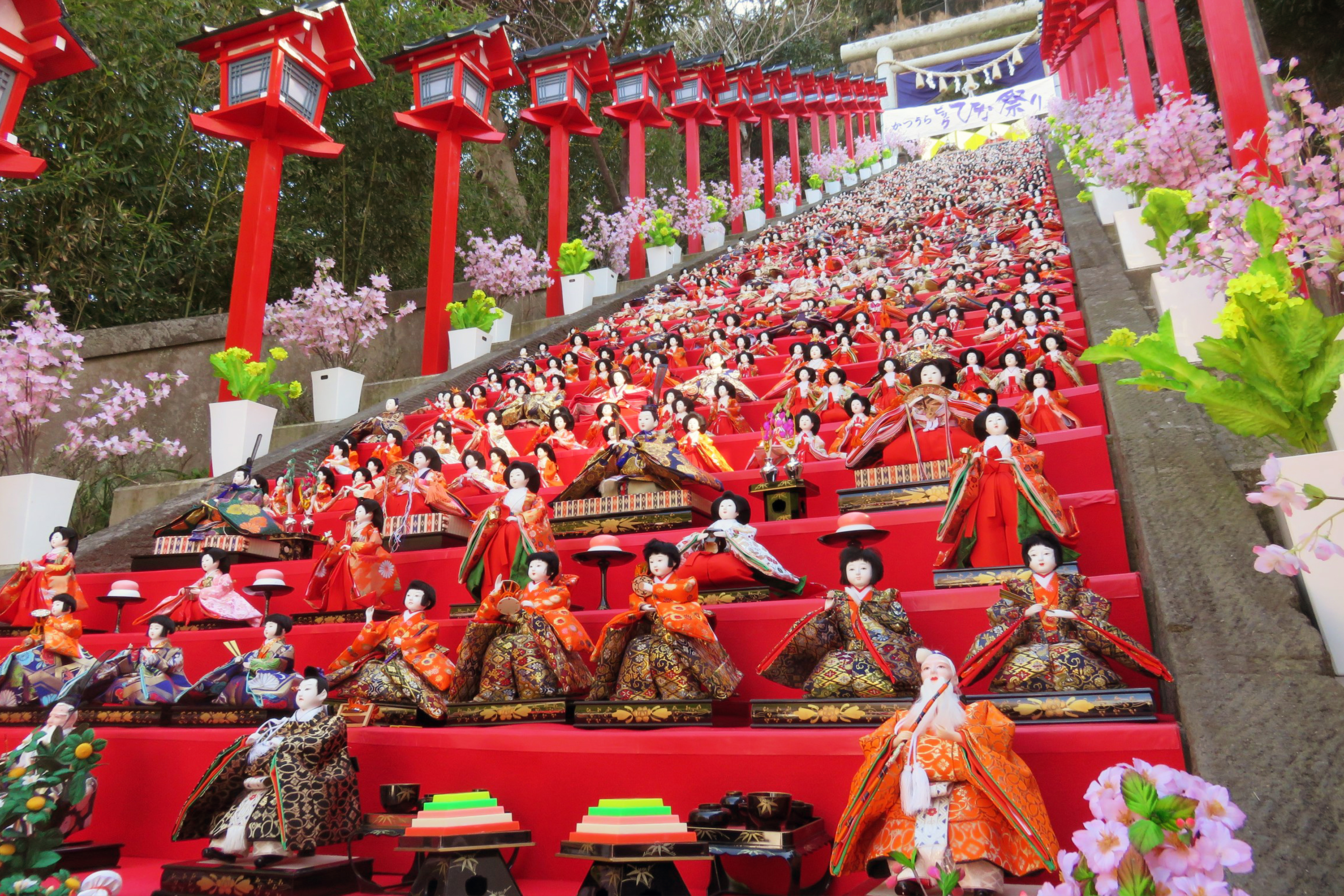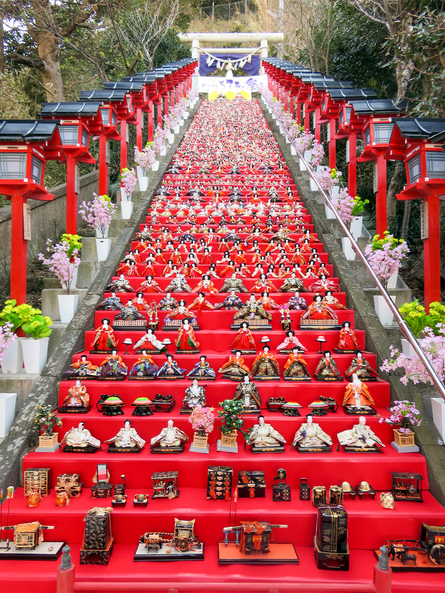 全国から寄贈されたひな形が勝浦市内各所に飾られ、町全体がひな人形一色となります。遠見岬(とみさき)神社の石段60段に飾られた約1800体のひな人形は圧巻の一言です。(雨天時はパネル展示)