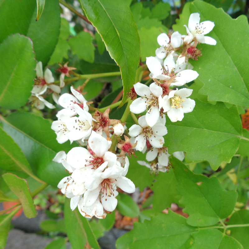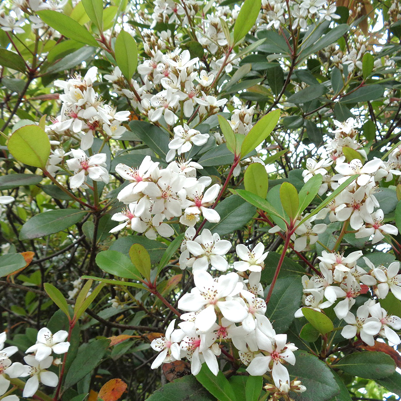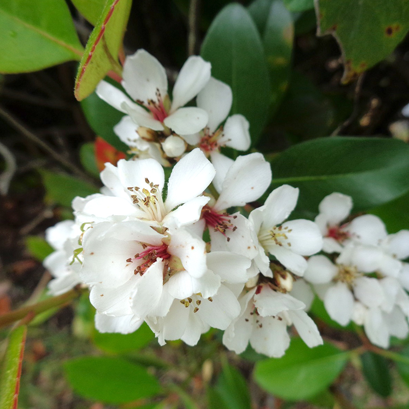 ④車輪梅(シャリンバイ)が咲き始めました。葉が車輪状につき梅に似た花なのでこの名になりました。
