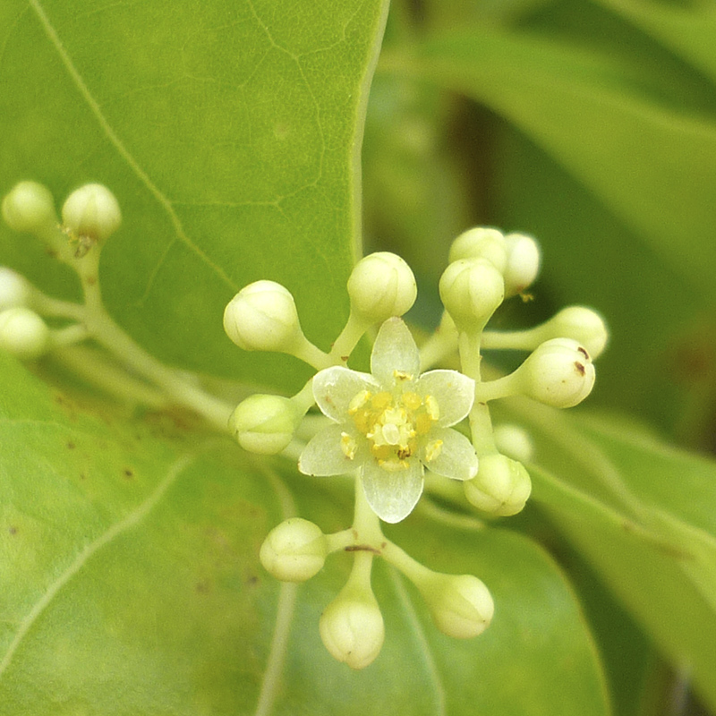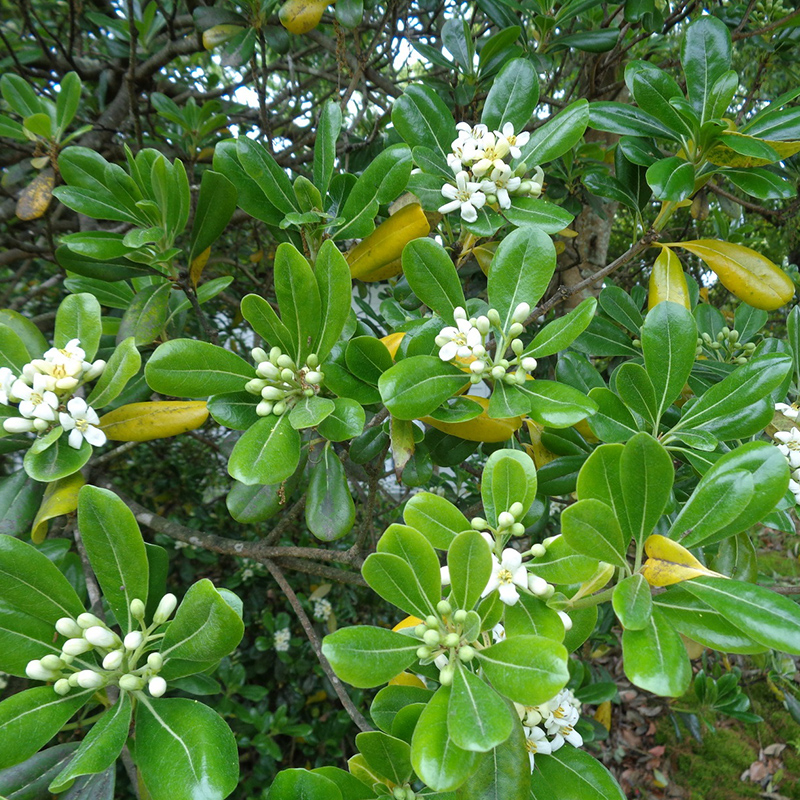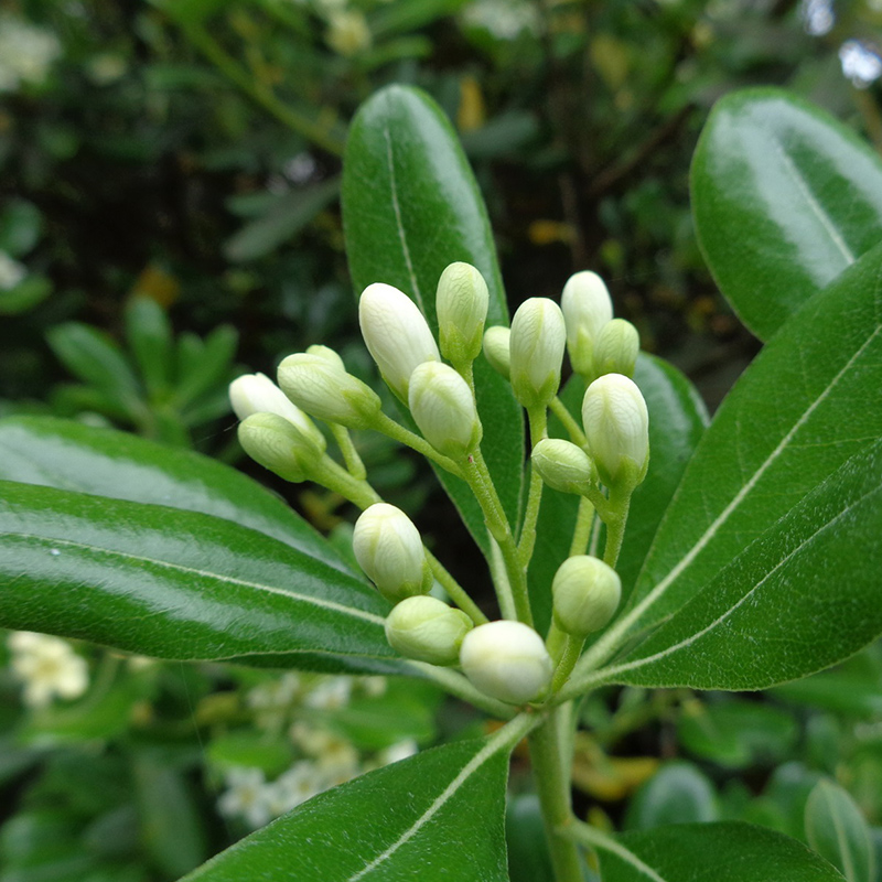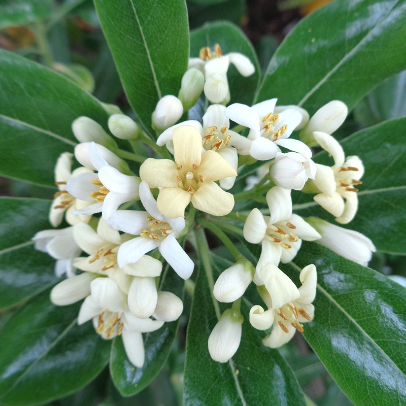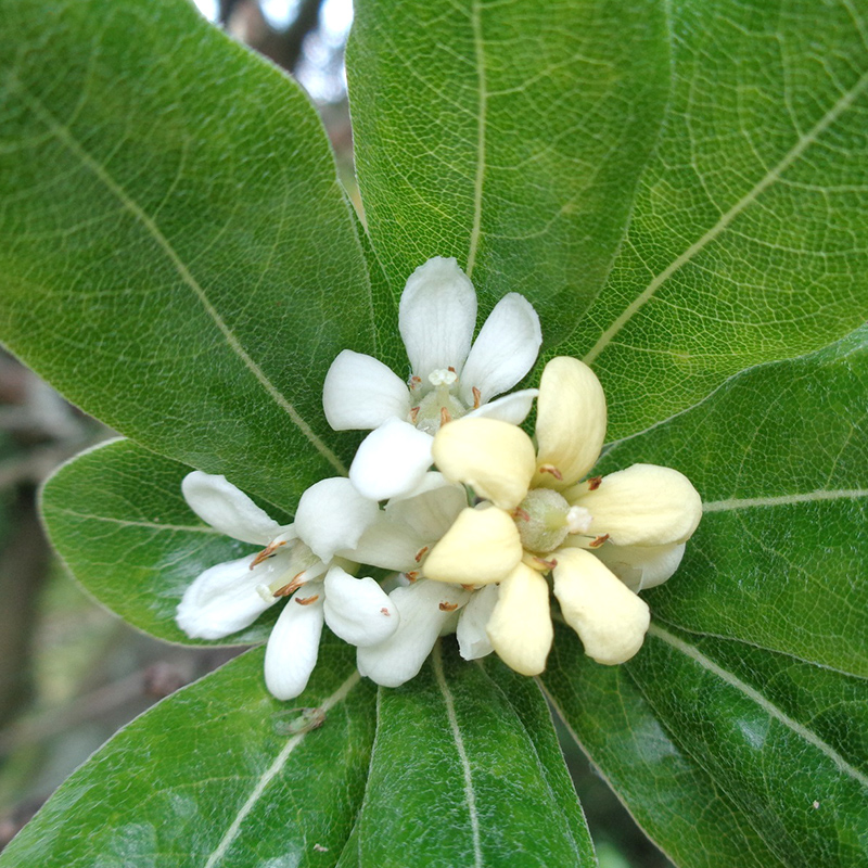 ⑤扉(トベラ)が咲き始めました。秋に付いた実は割れて赤いベトベトした面白い種が姿をあらわします。