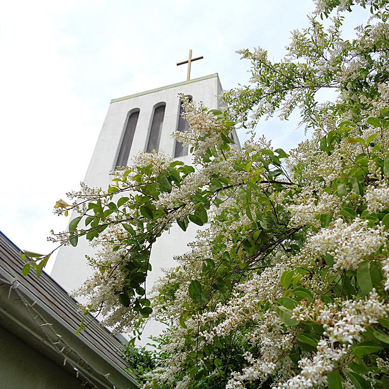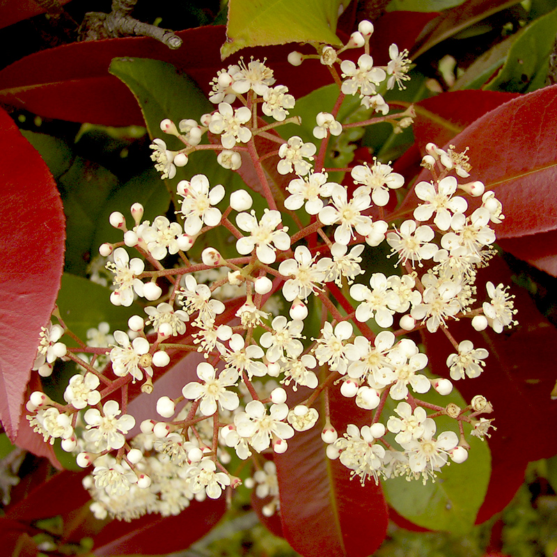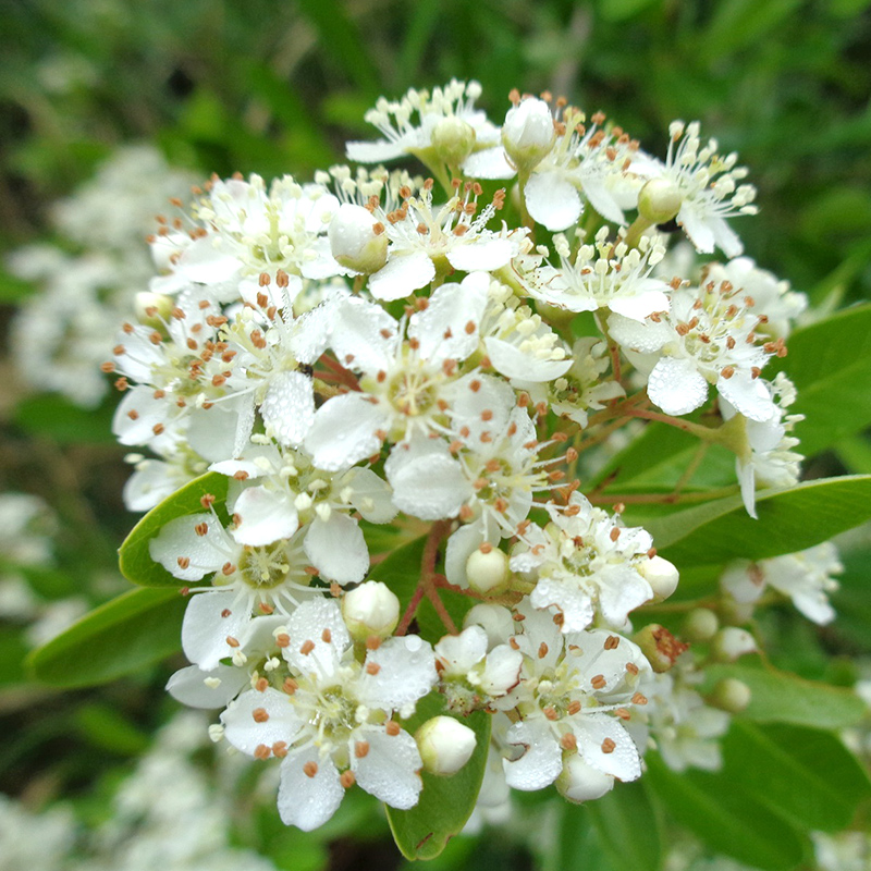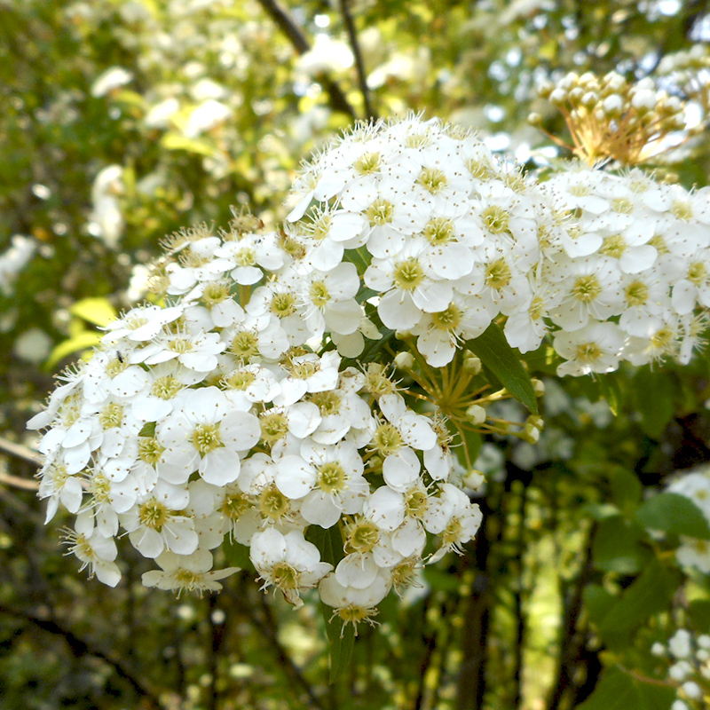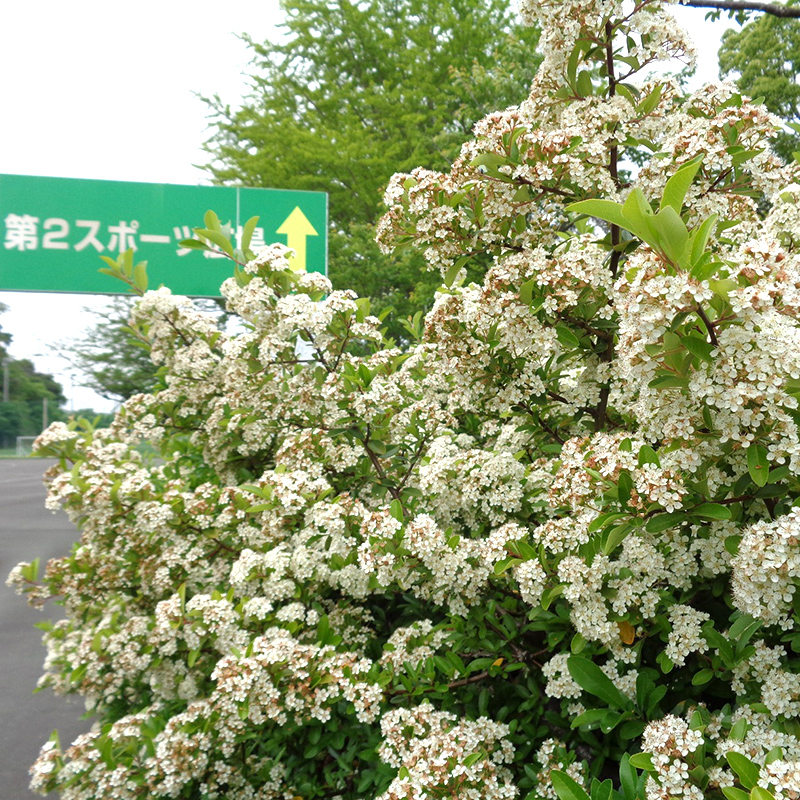 ⑥常盤山樝子(トキワサンザシ)が咲いています。白い小さな花が沢山咲き秋には赤い実をつけます。