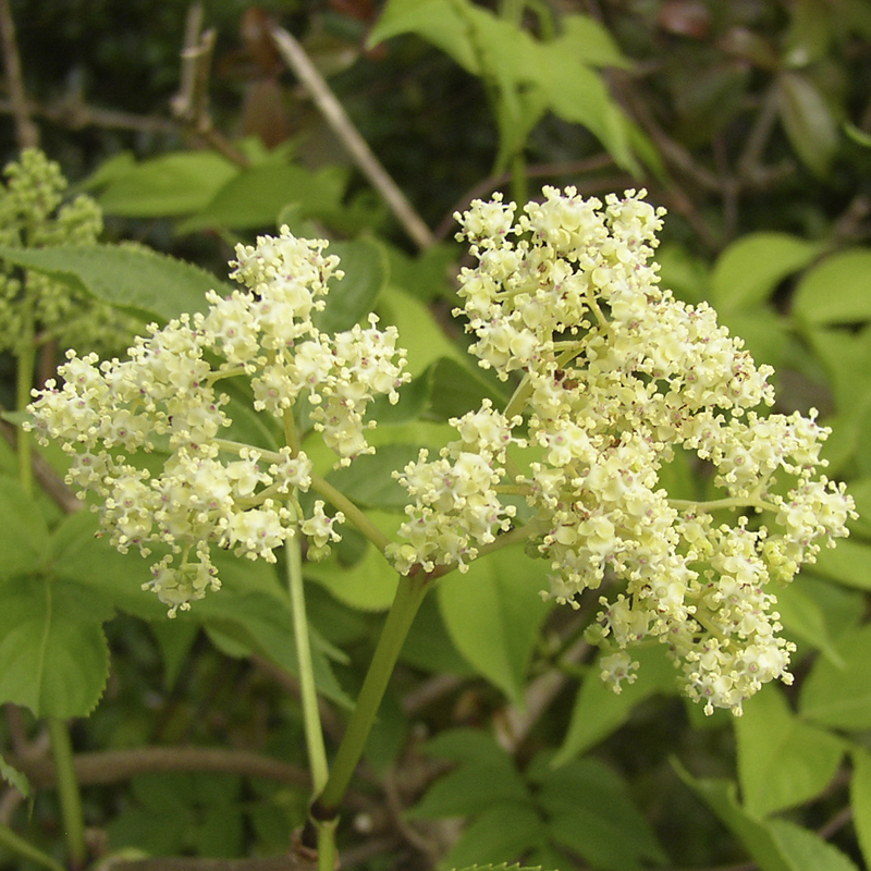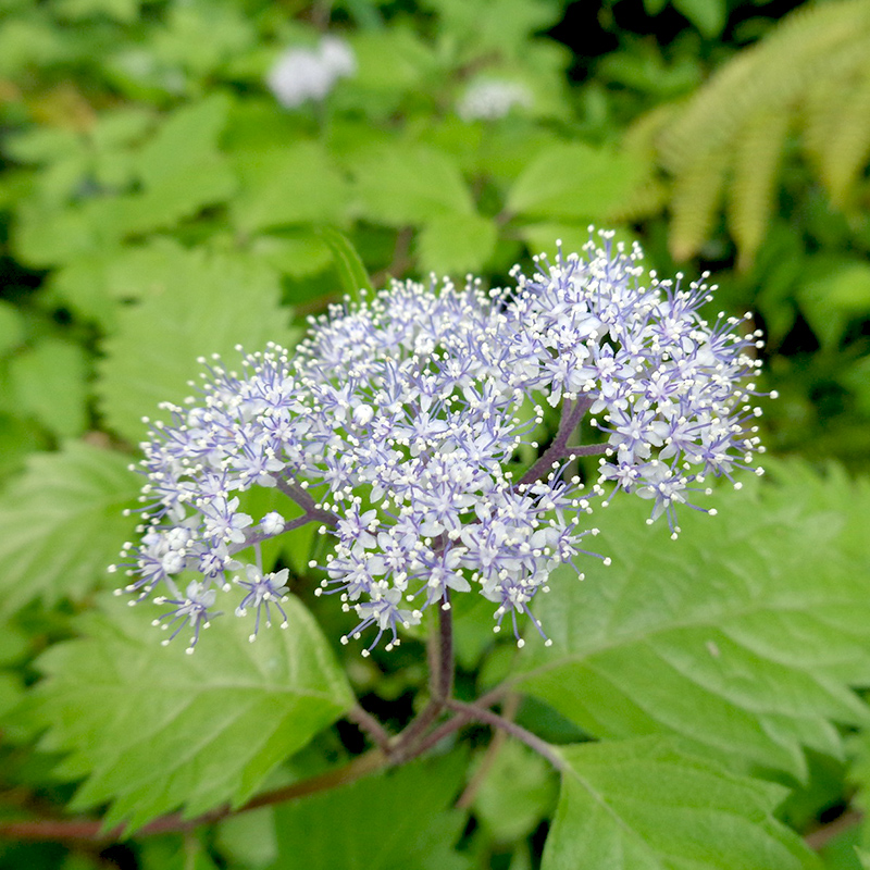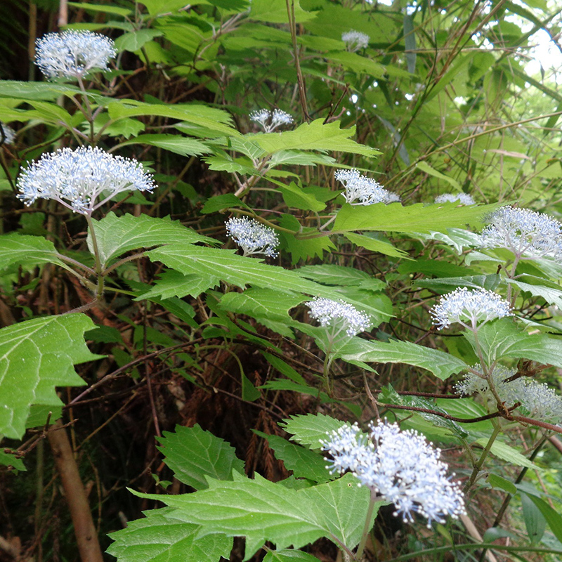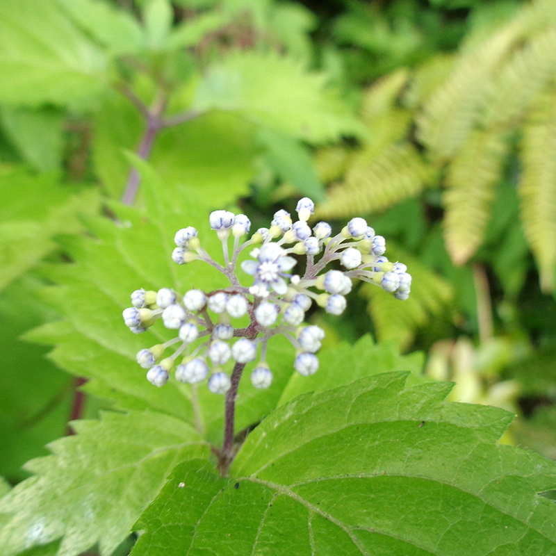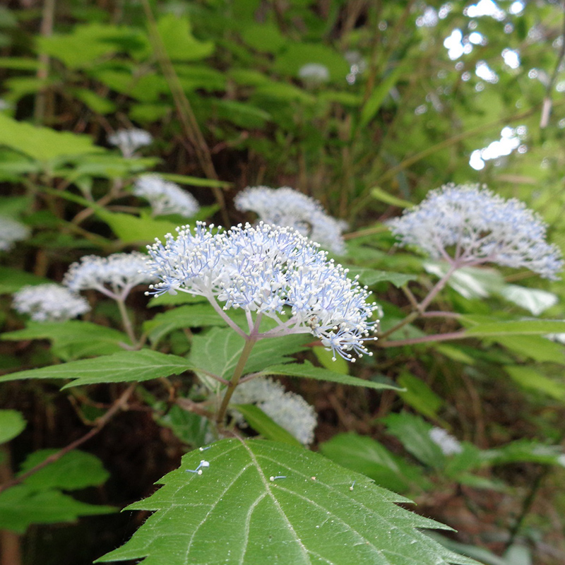 ④小紫陽花(コアジサイ)が咲き始めました。青紫色の小さなつぶつぶの花の集まりで装飾花はつきません。