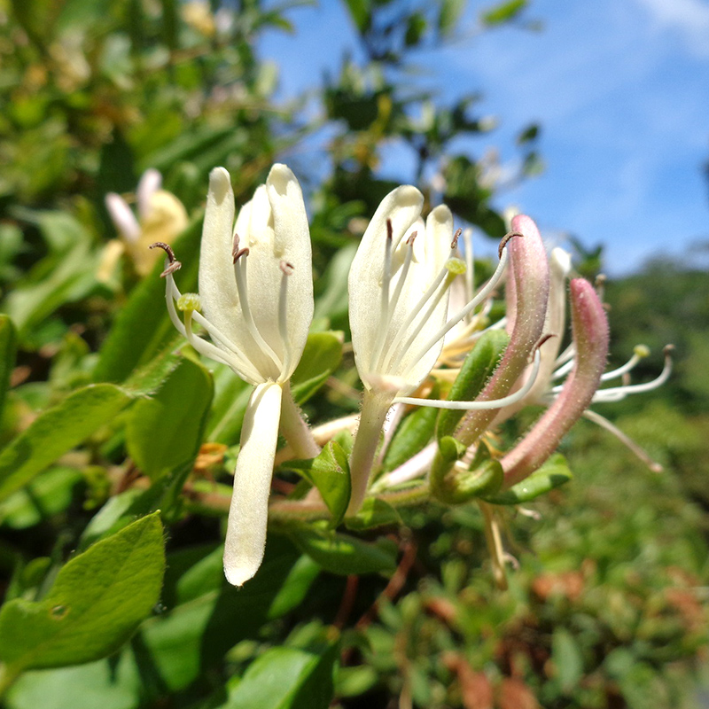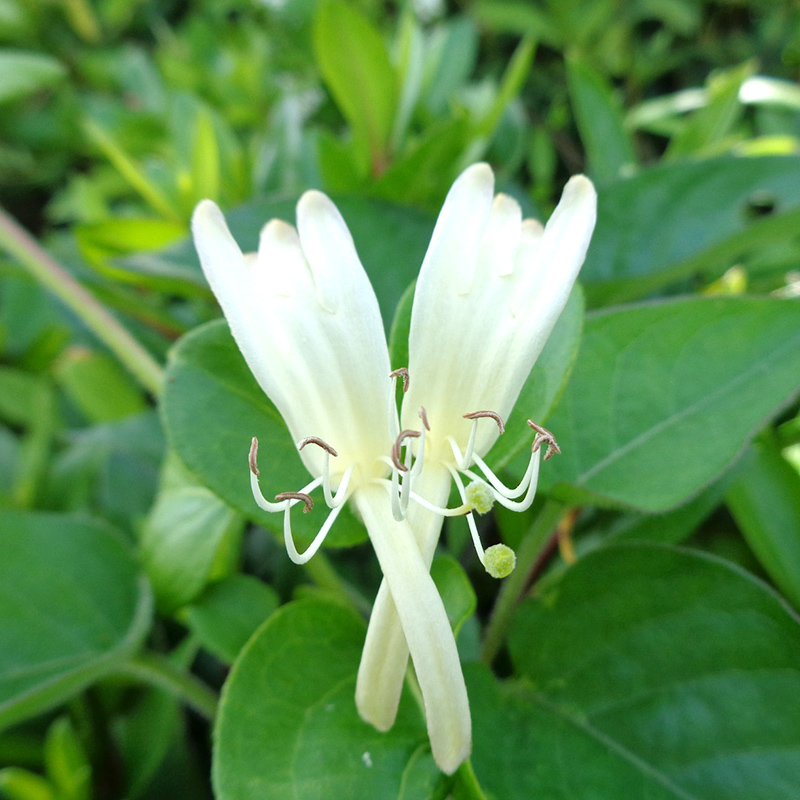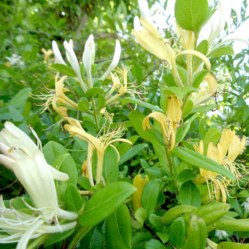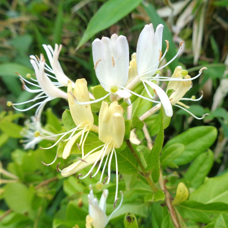 ⑤吸葛(スイカズラ)が咲いています。花の色が白から黄に変化していくことから「金銀花」とも呼ばれます。