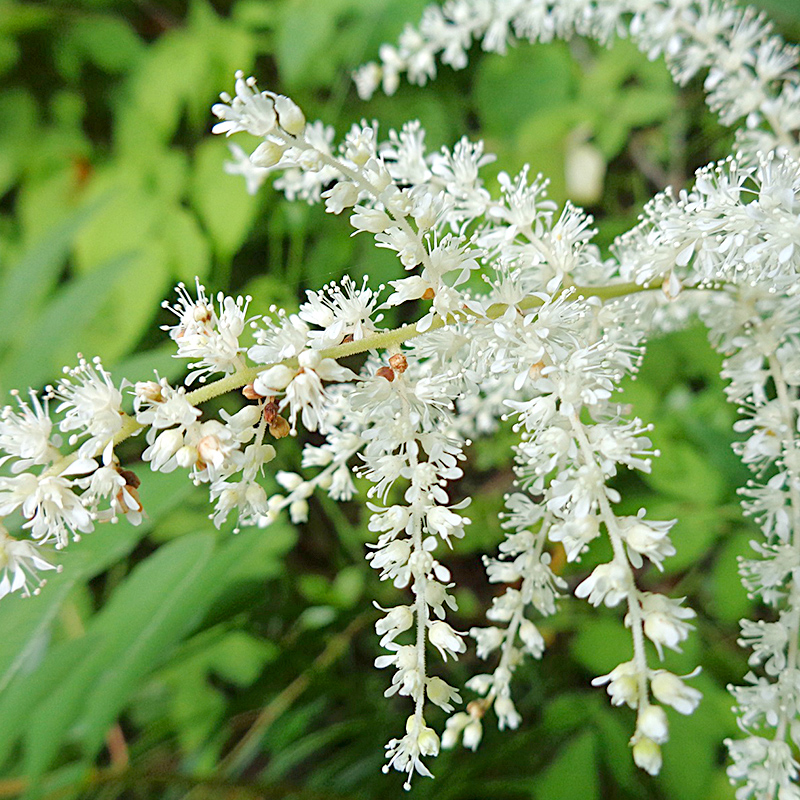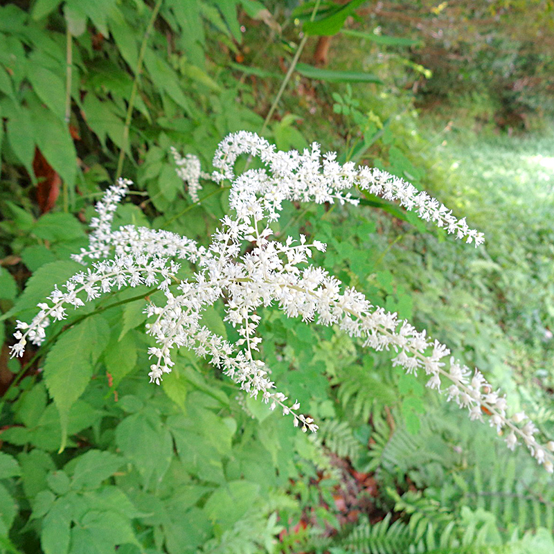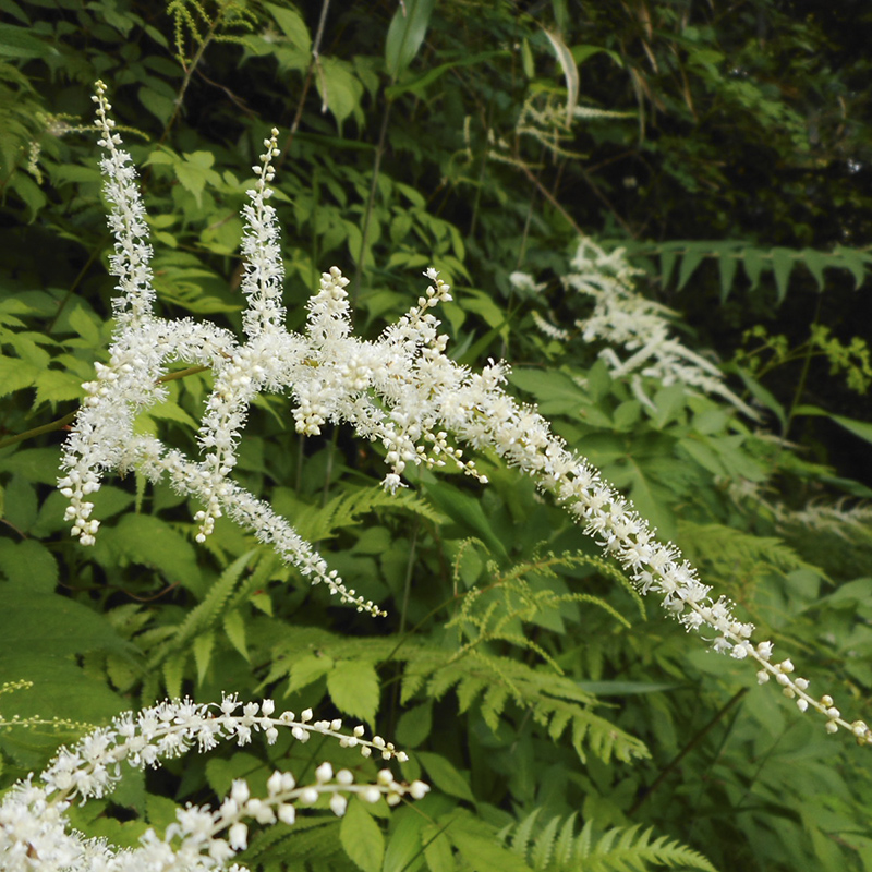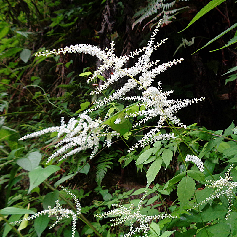 ②鳥足升麻(トリアシショウマ)が園内の日陰の山斜面に咲いています。白い小さな花が沢山ついています。