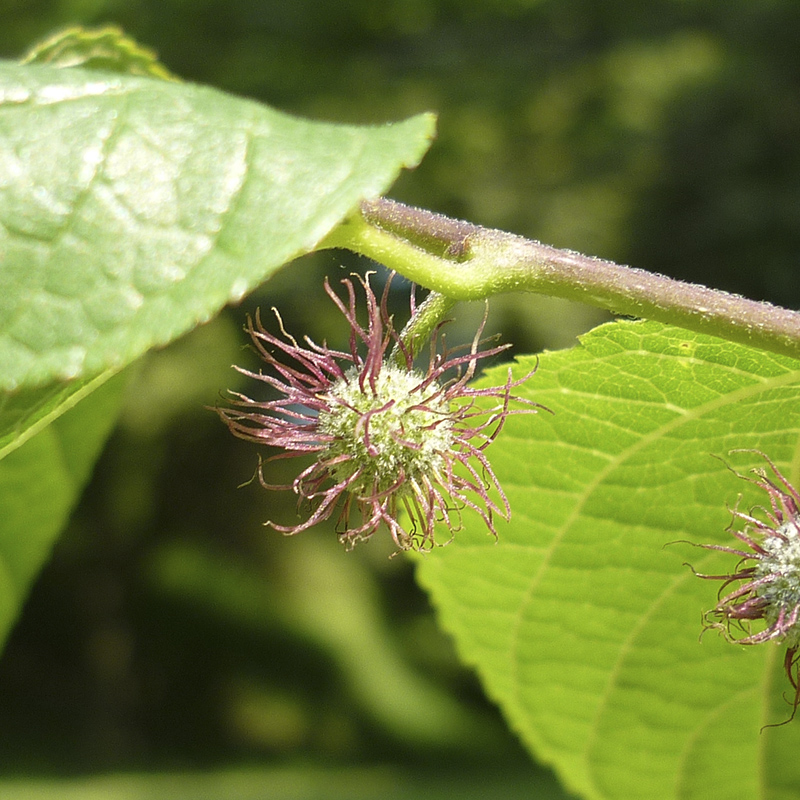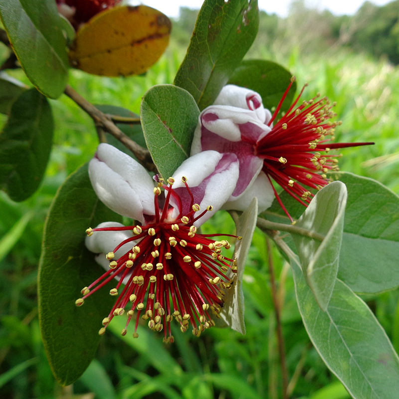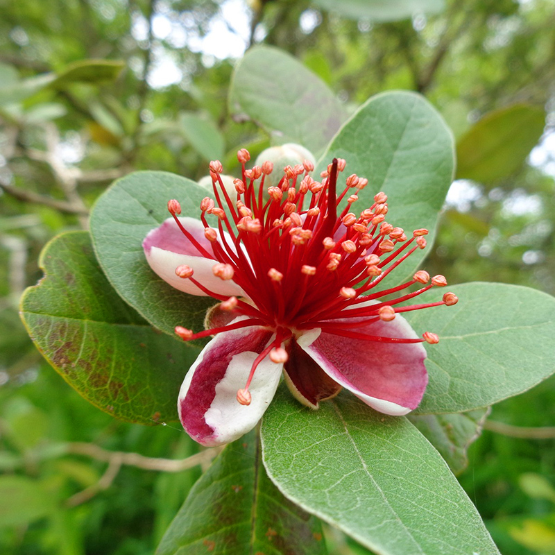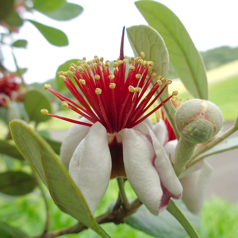 ②フェイジョアが咲き始めました。赤いハケのような花で秋にはパイナップルの香りをした緑色の実をつけます。