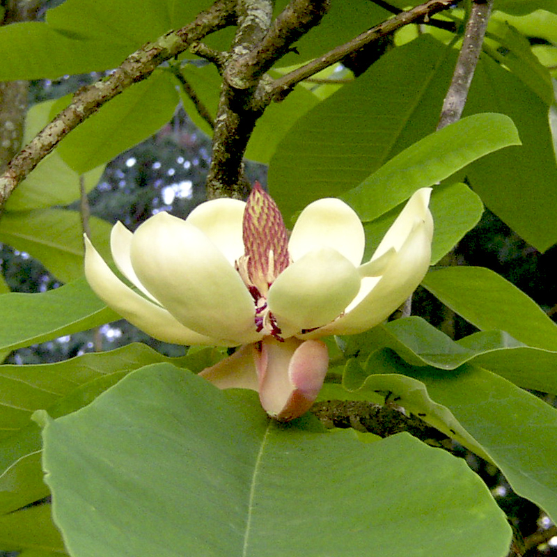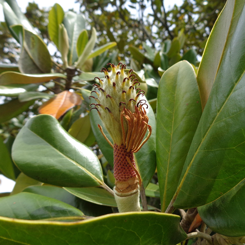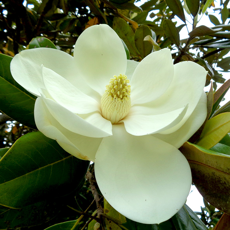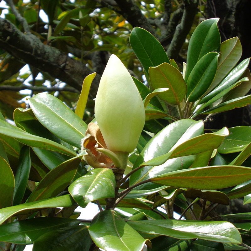 ③泰山木(タイサンボク)が咲き始めました。朴の木の花に似た大きい白いお椀形の花で上向きに咲きます。