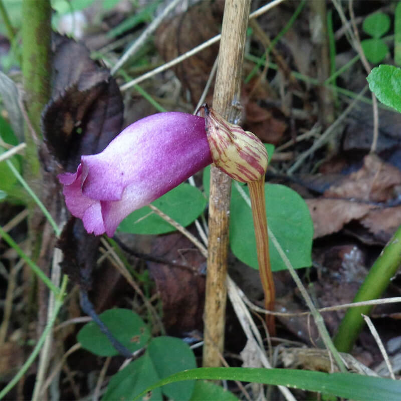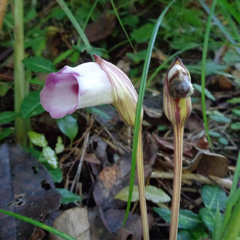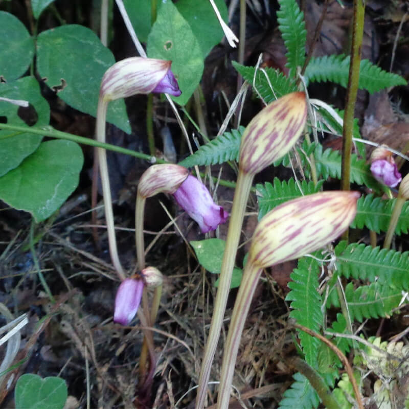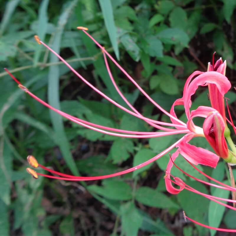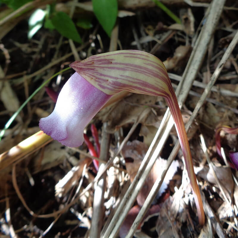 - 面白い形をした南蛮煙管(ナンバンギセル)が薄紫色の花を咲かせています。花の形がタバコを吸うのに使った「キセル」に似ていることからこの名になりました。葉緑体をもたないため自活できずススキなどの根に寄生します。また、南蛮煙管は日本最古の歌集「万葉集」に出てくる万葉植物で、「万葉集」では「おもいぐさ」という名で出ています。