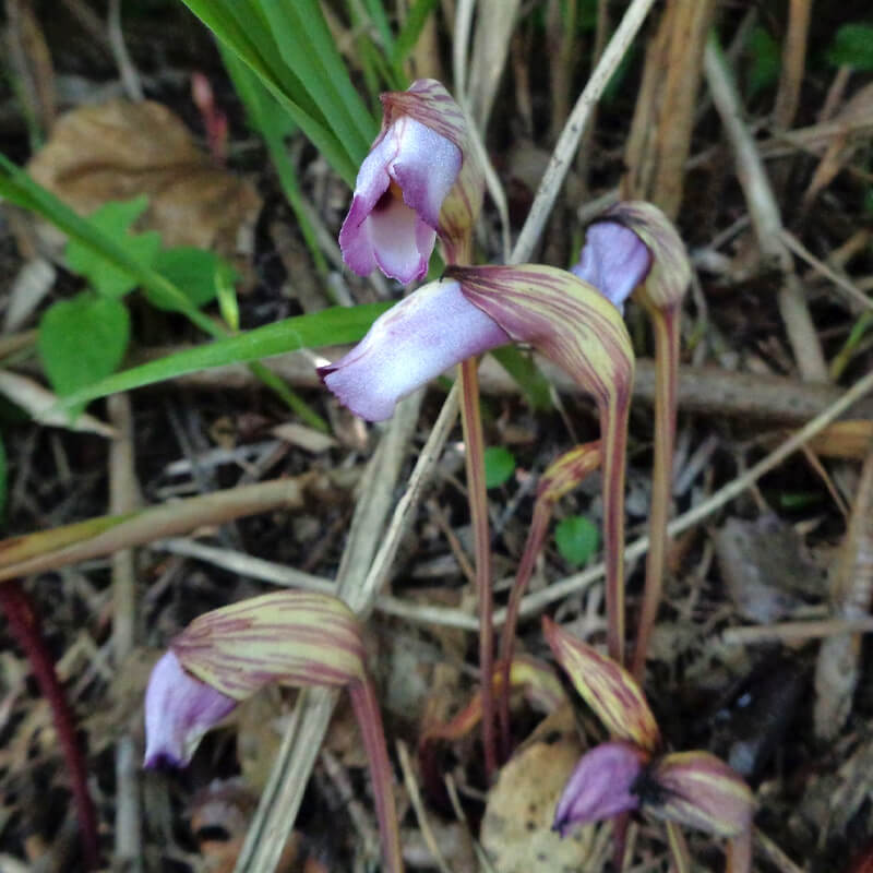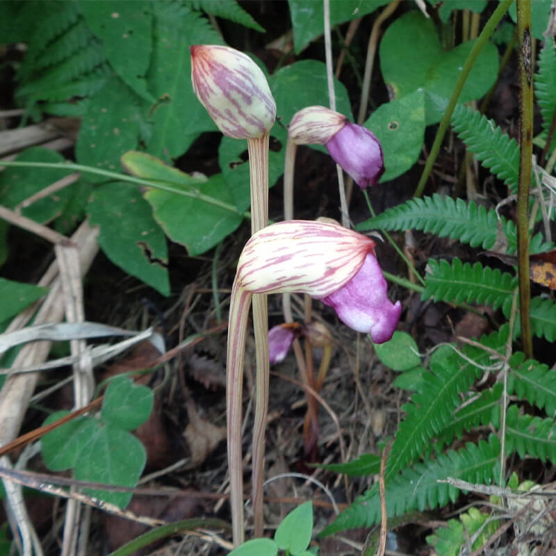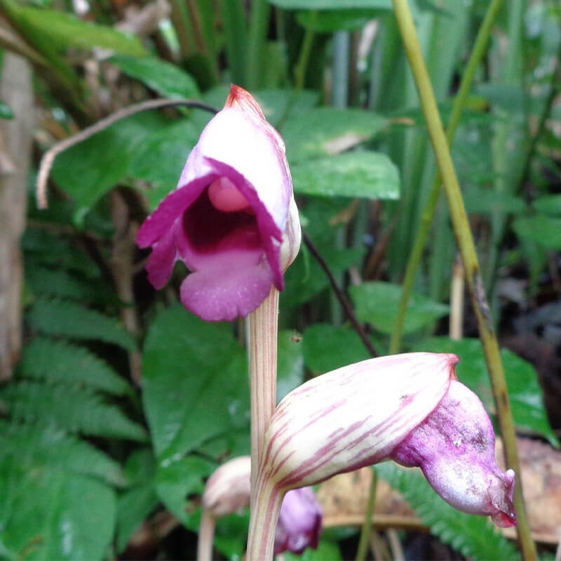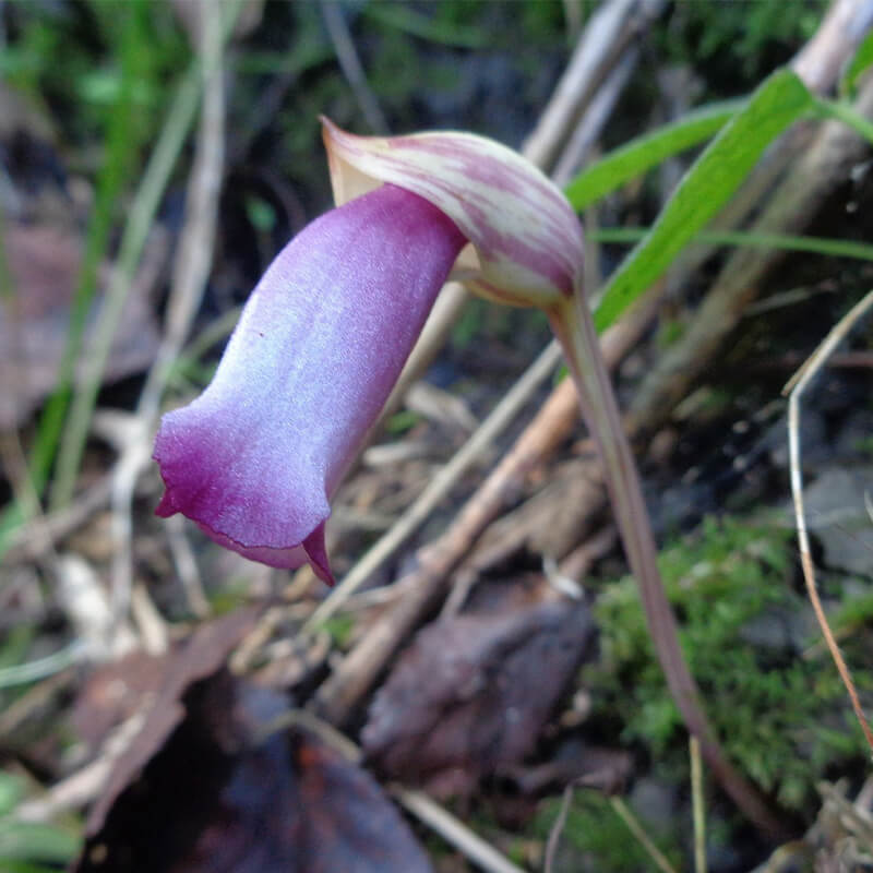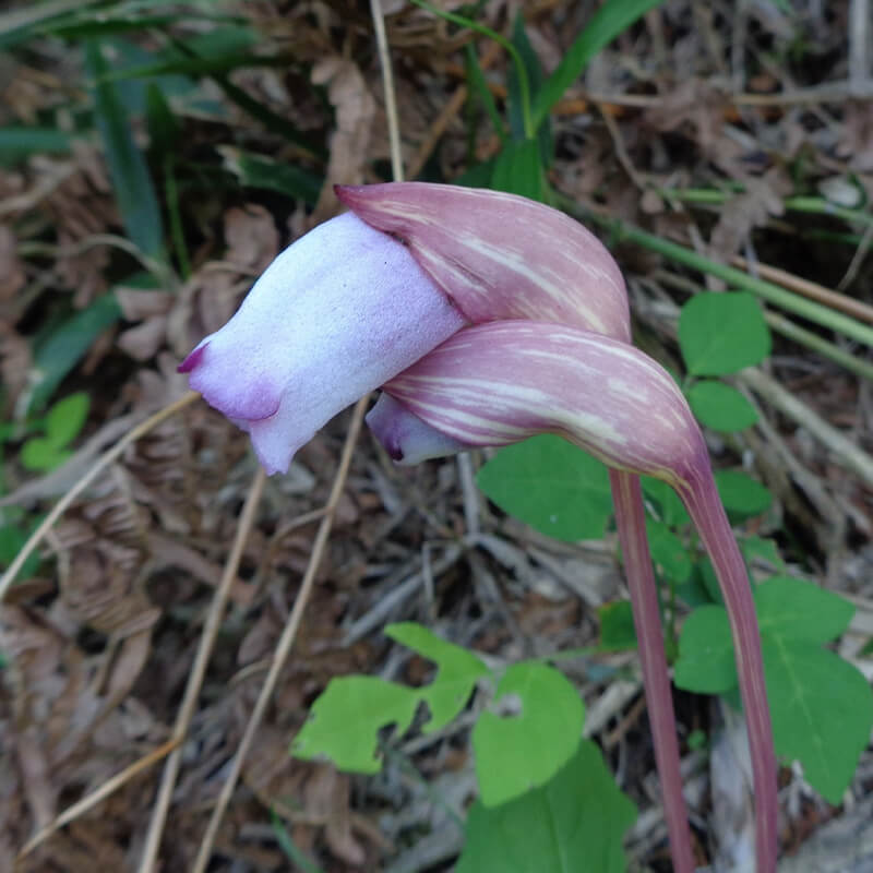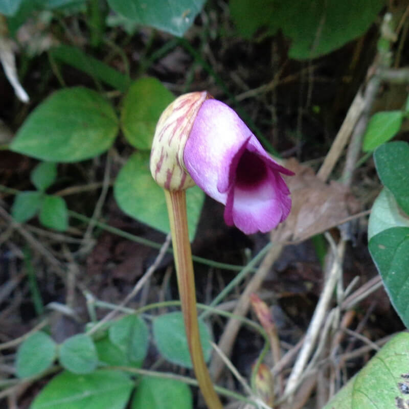 - 面白い形をした南蛮煙管(ナンバンギセル)が薄紫色の花を咲かせています。花の形がタバコを吸うのに使った「キセル」に似ていることからこの名になりました。葉緑体をもたないため自活できずススキなどの根に寄生します。また、南蛮煙管は日本最古の歌集「万葉集」に出てくる万葉植物で、「万葉集」では「おもいぐさ」という名で出ています。