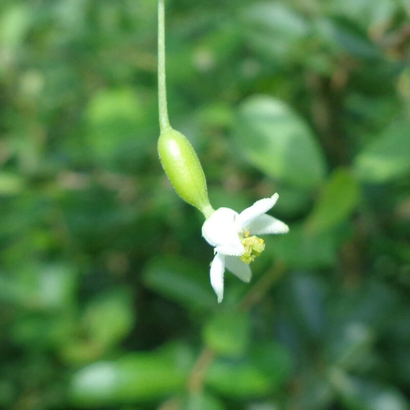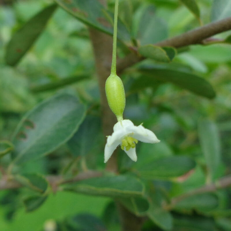 ②枝先に橘擬(タチバナモドキ)の秋の花が咲き始めました。5月に咲いた花はオレンジ色の実が生りますが、秋に咲いた花は実が生りません。見つけてみてください。