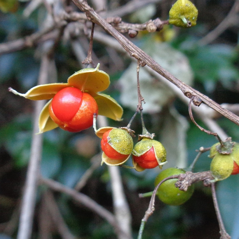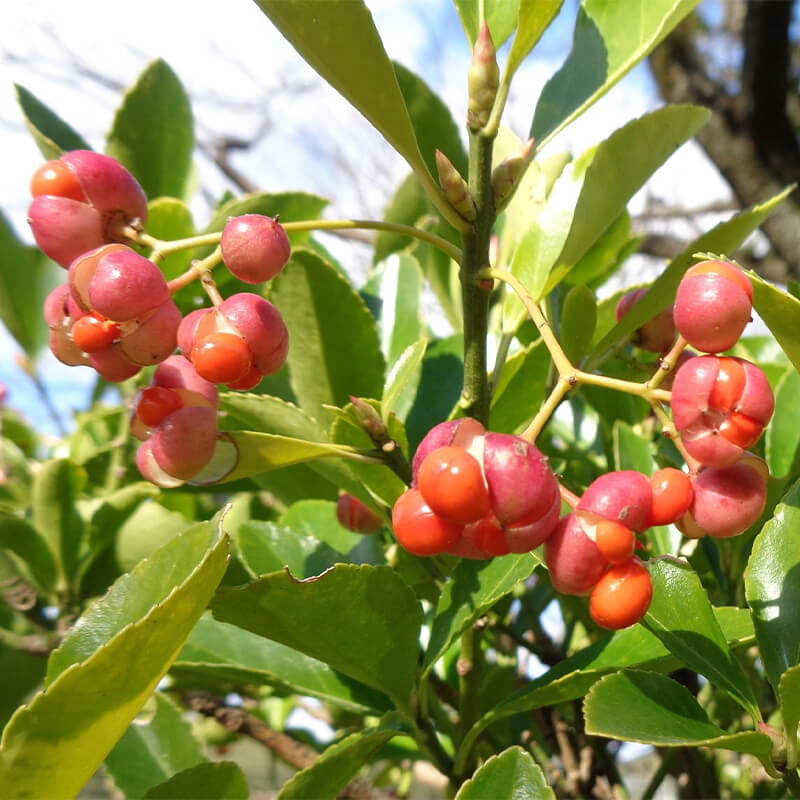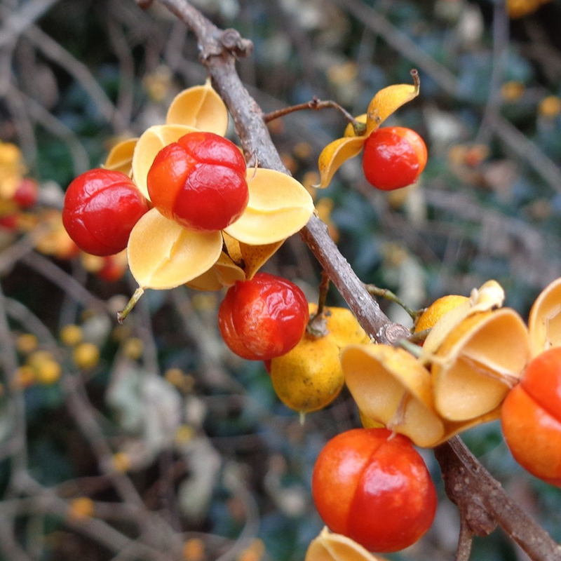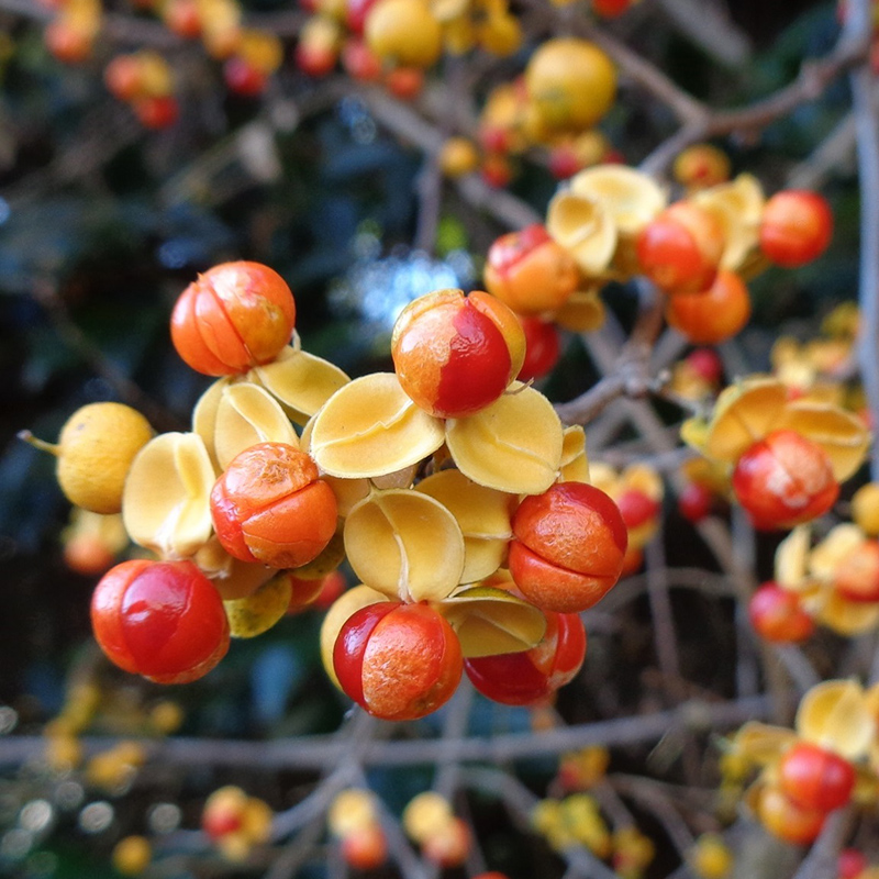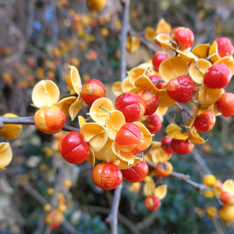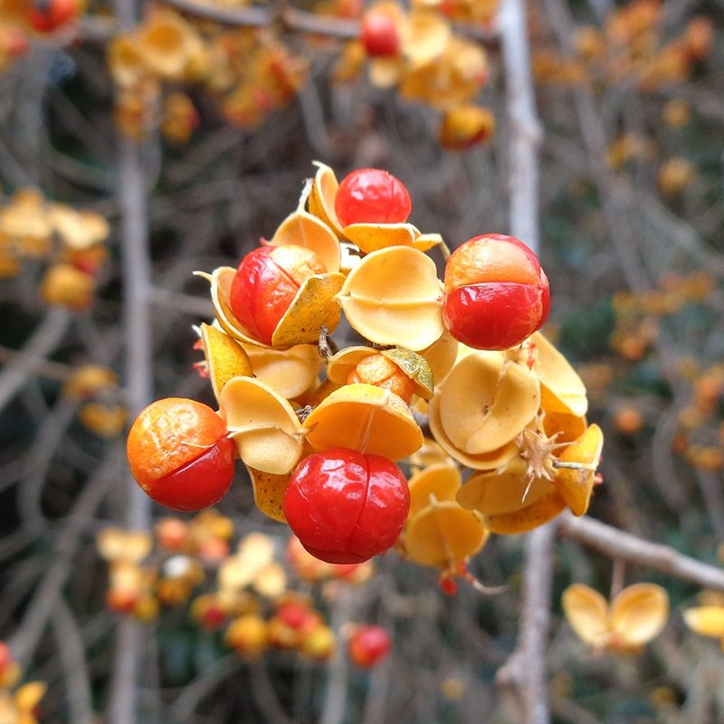 - 黄色く熟した蔓梅擬(ツルウメモドキ)の実が3つに裂けて真っ赤な種子が顔を出しています。鮮やかな色合いで生け花やリースなどによく使われます。葉がウメモドキに似ていて、ツル性であることからこの名になりました。