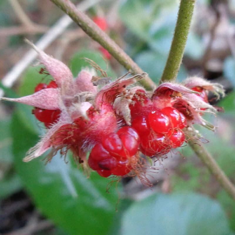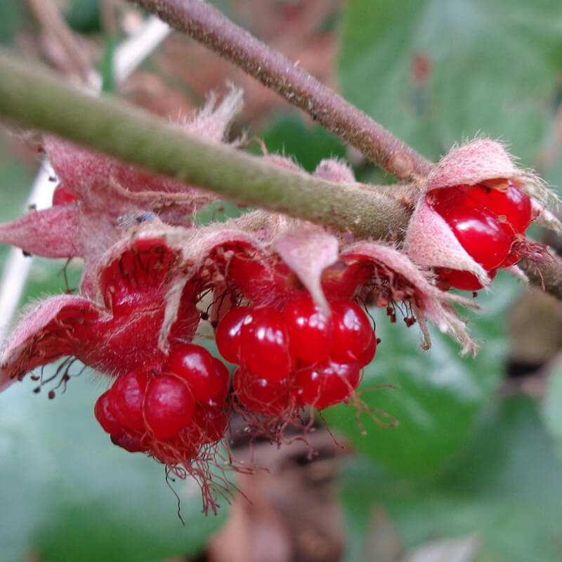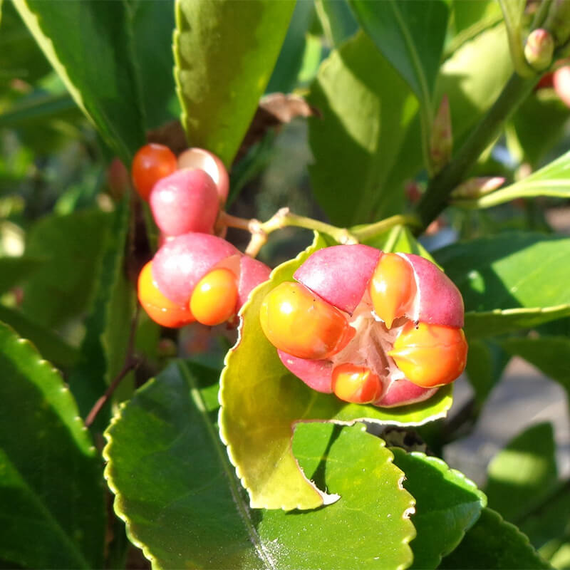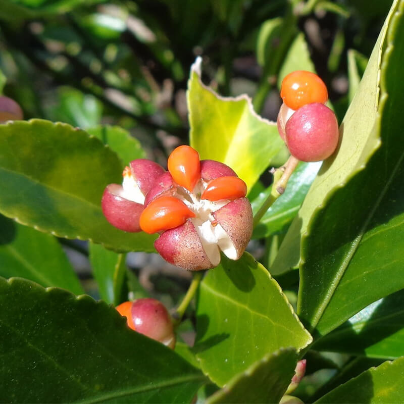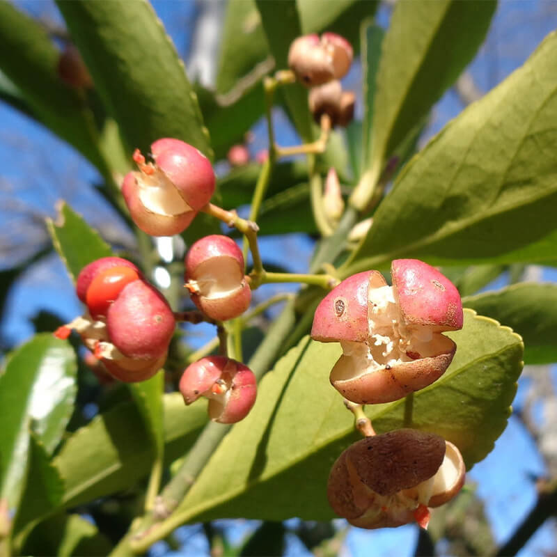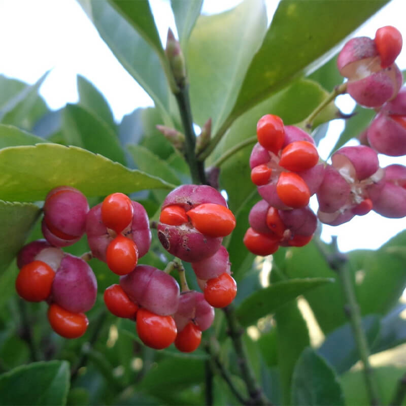 - 黄色く熟した蔓梅擬(ツルウメモドキ)の実が3つに裂けて真っ赤な種子が顔を出しています。鮮やかな色合いで生け花やリースなどによく使われます。葉がウメモドキに似ていて、ツル性であることからこの名になりました。