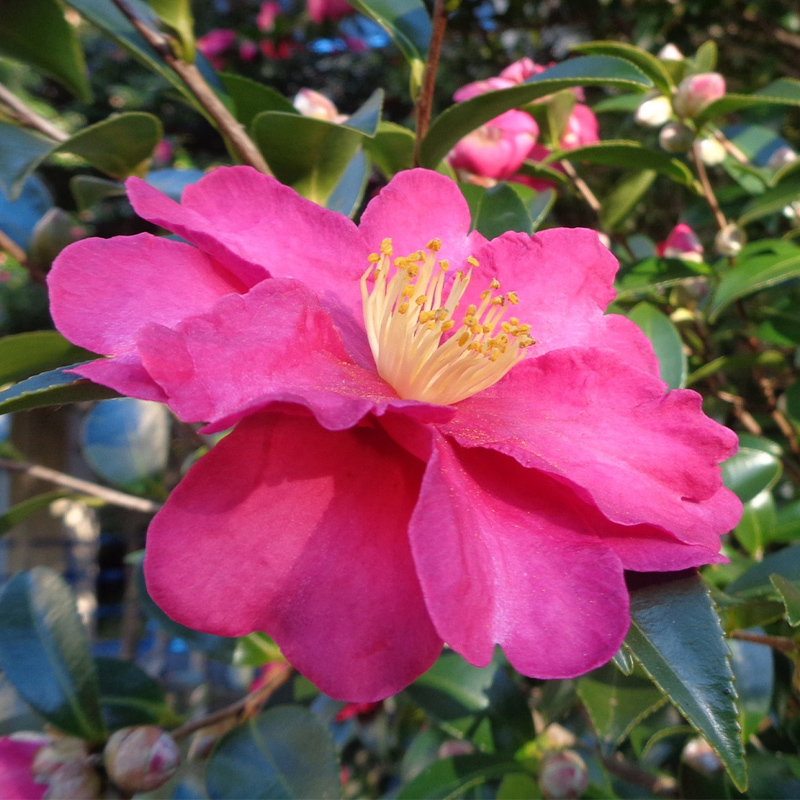 - 山茶花(サザンカ)が園内各所で見頃です。椿(ツバキ)にそっくりな花ですが、椿が花ごと散るのに対して山茶花は花びらが1枚ずつ散るのが特徴です。「さざんか、さざんか咲いた道〜♪」と童謡「たきび」にも登場しています。