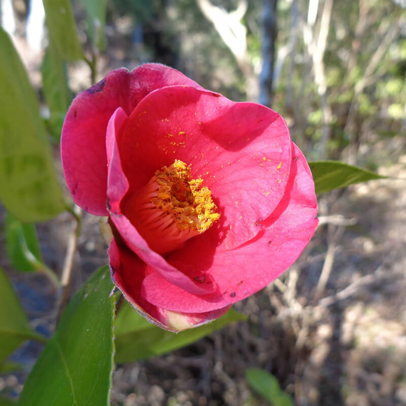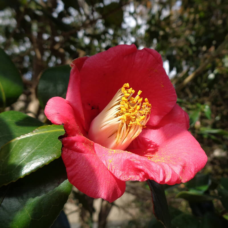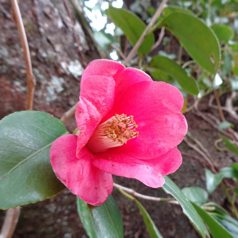 - ①薮椿(ヤブツバキ)が咲いています。薮に生える椿ということでこの名がつきました。日本固有種で日本最古の観賞用花木、代表的な茶花として知られています。花は終わると首ごと落下するので武士は忌み嫌ったといいます。
