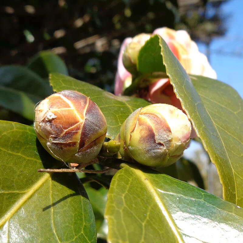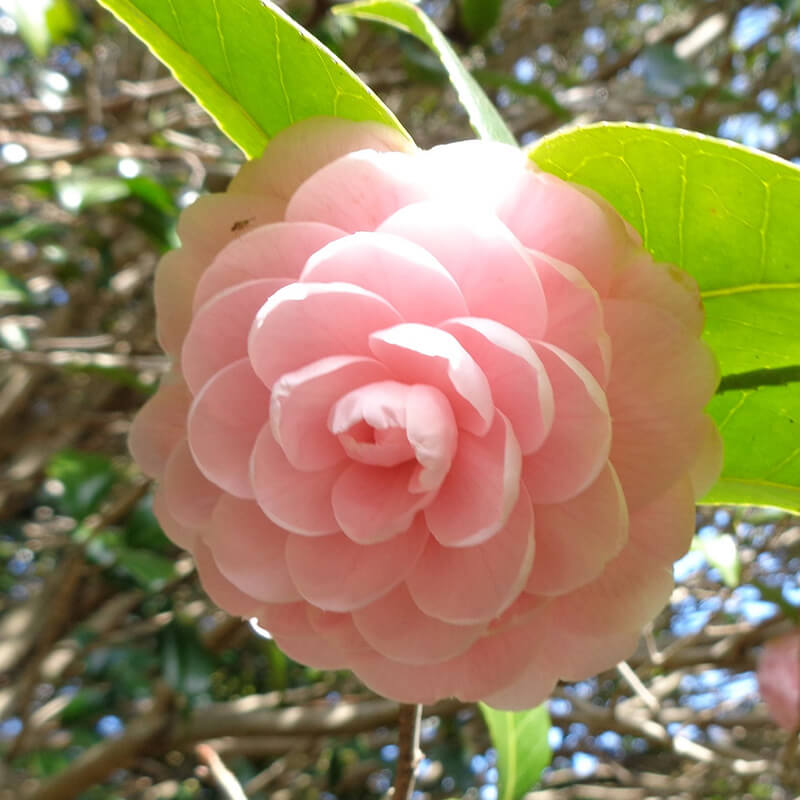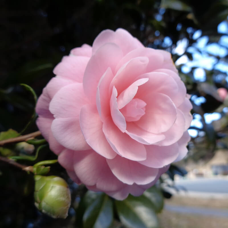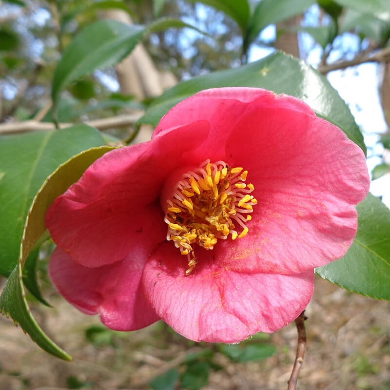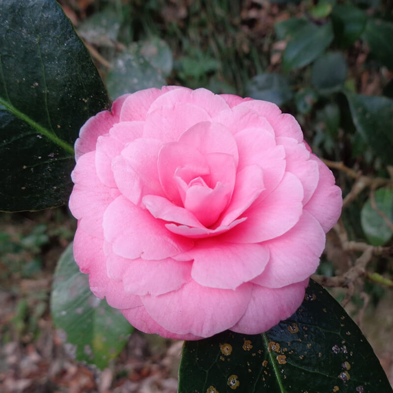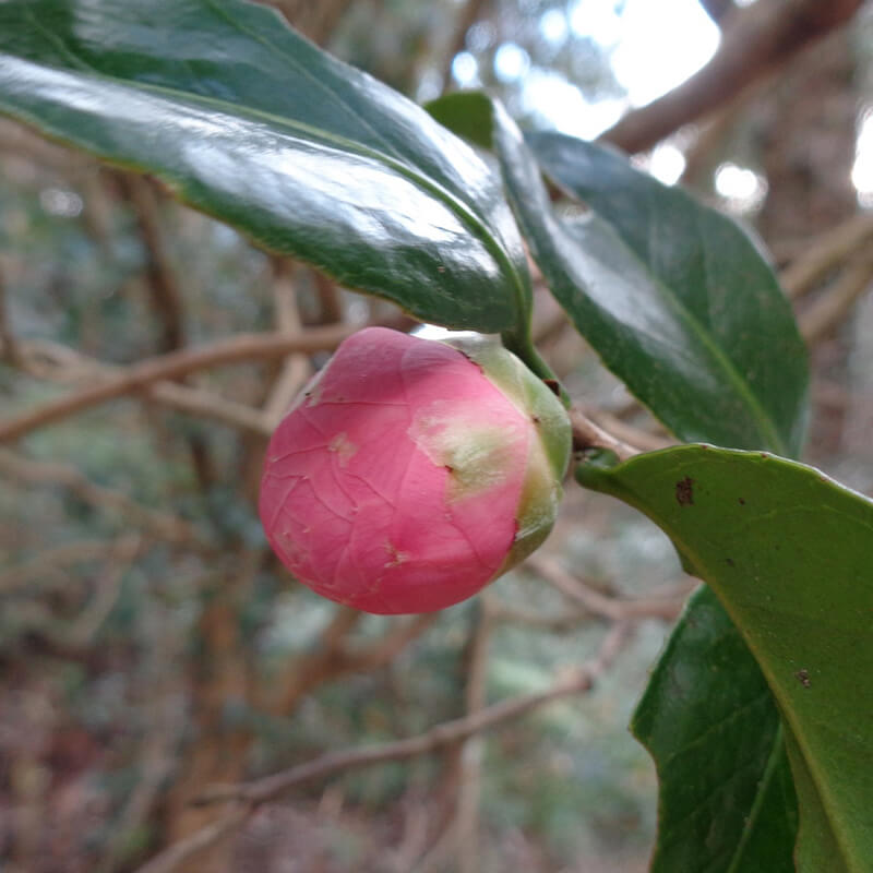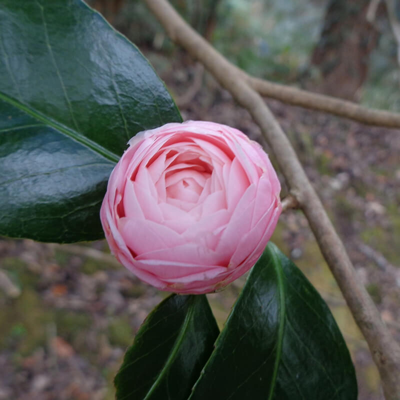 ②乙女椿(オトメツバキ)が咲いています。ピンクの八重咲き椿で花びらがたくさんあるのが特徴です。日本原産の花として江戸時代には海外へと持ち出され人気を博し「冬の女王」と呼ばれています。