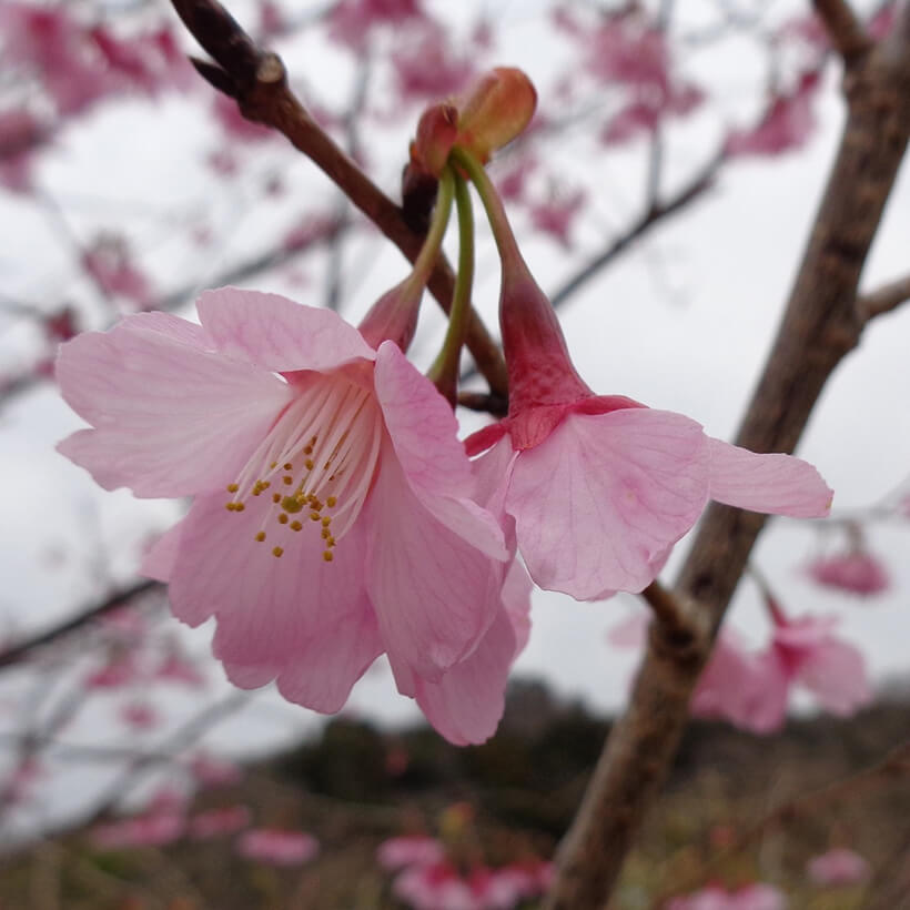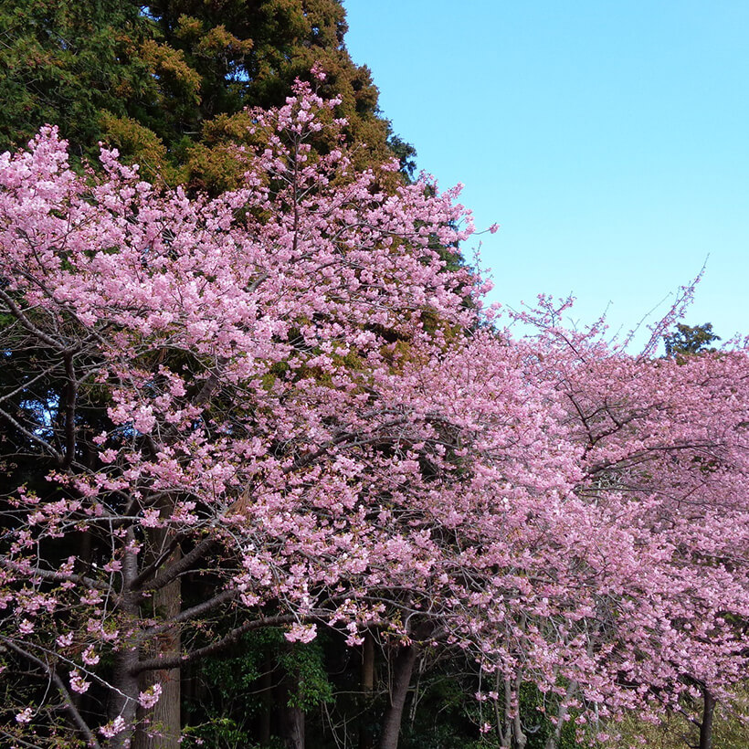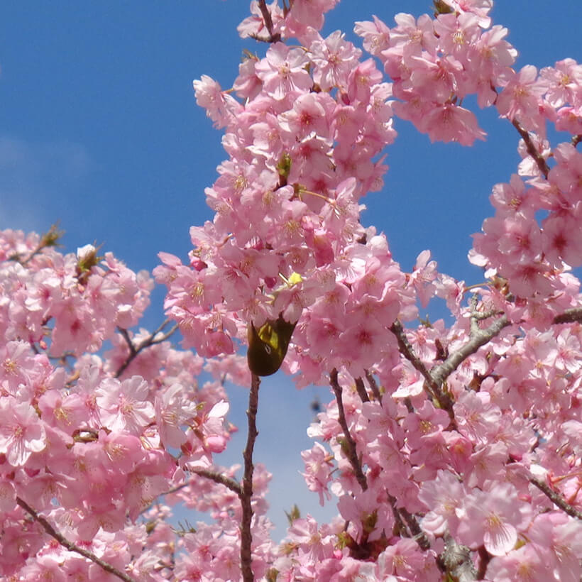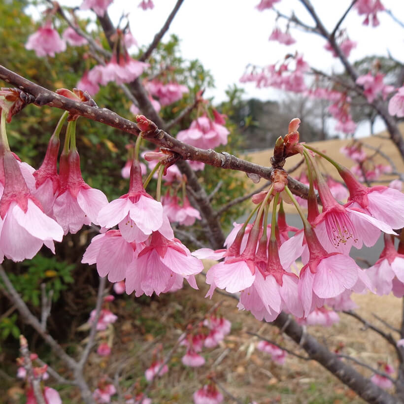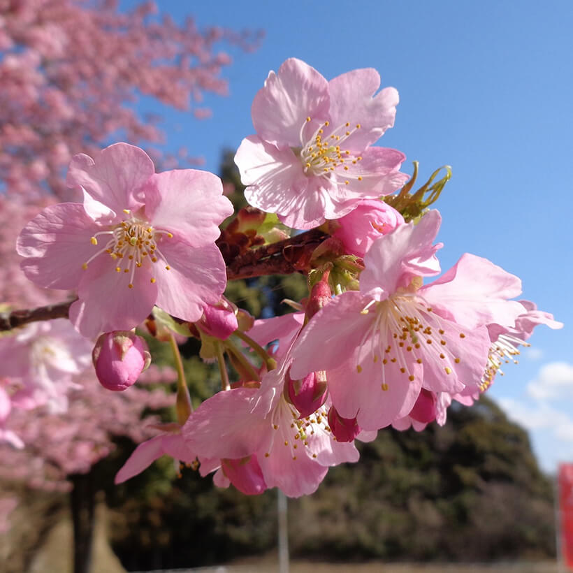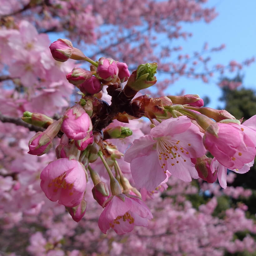 - 今年は、寒波の影響で河津桜の開花が大幅に遅れました。上旬に咲き進みすぐに満開になるのではないかと思われます。北正面ゲート回り周遊道路沿いの270本の河津桜を是非ご覧ください。周遊バスに乗ってのお花見が時間がかからず楽ちんですよ。(バス1周約15分)乗馬倶楽部馬場の寒桜、ウォーターパーク通りの掛川桜が咲き、染井吉野は下旬〜4月上旬が見頃と思われます。花いっぱいの春の園内散策をぜひお楽しみください。
