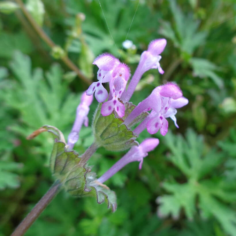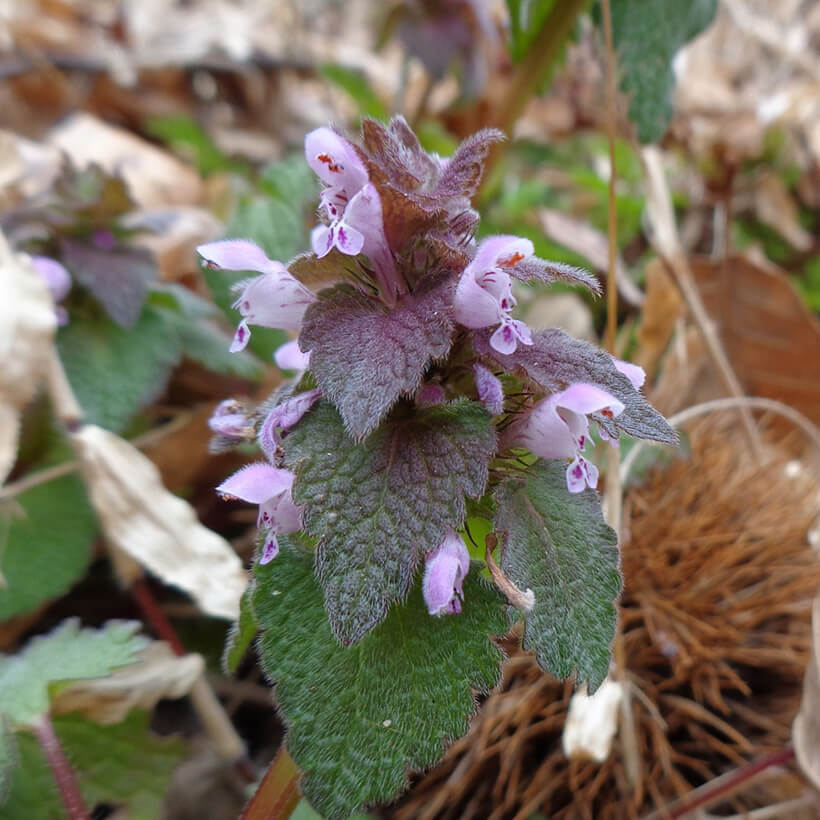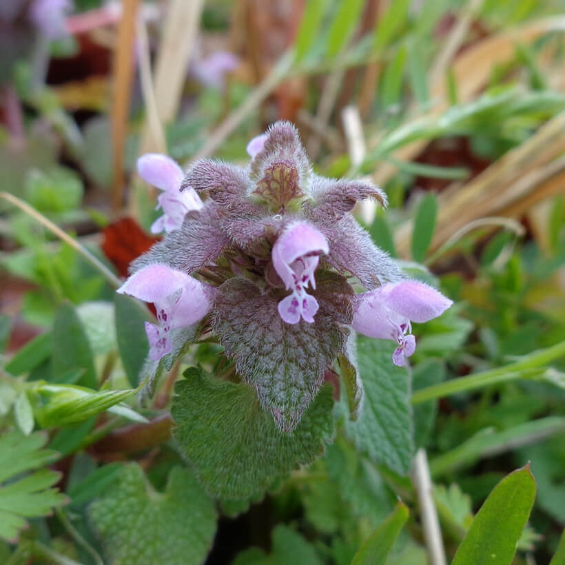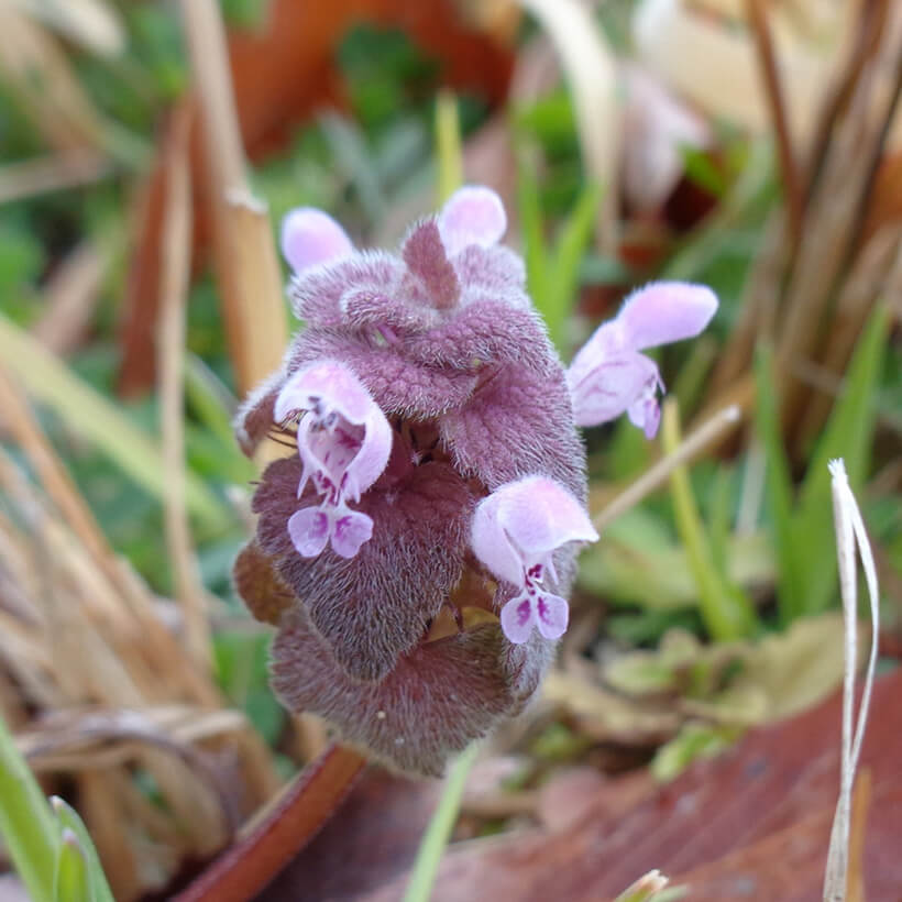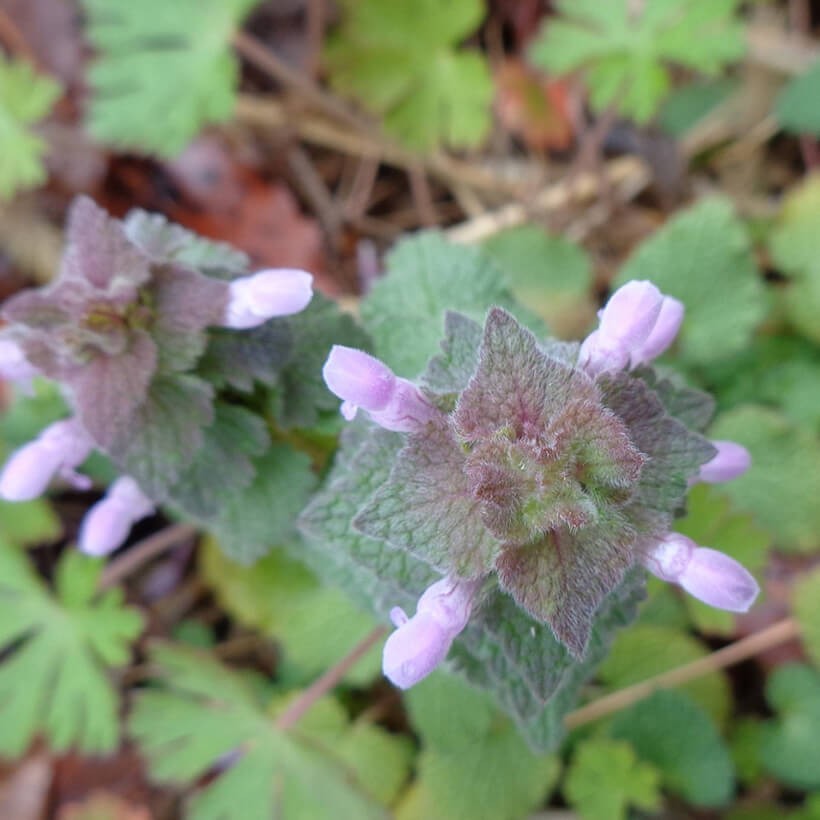 ③姫踊子草(ヒメオドリコソウ)が咲いています。花の形が仏の座に似ていますが違いがわかりますか?