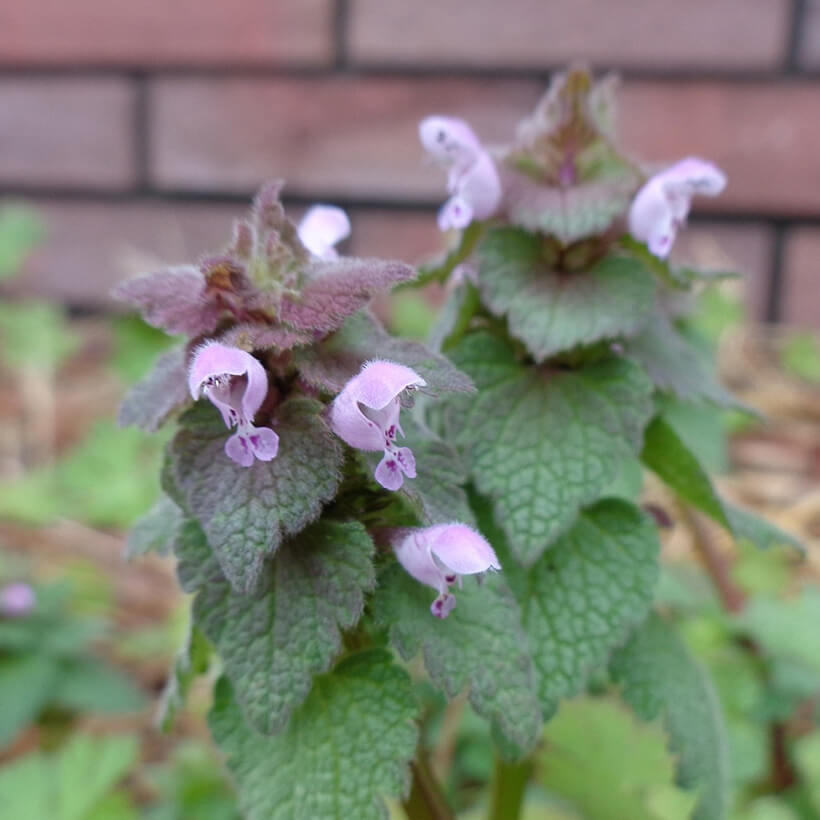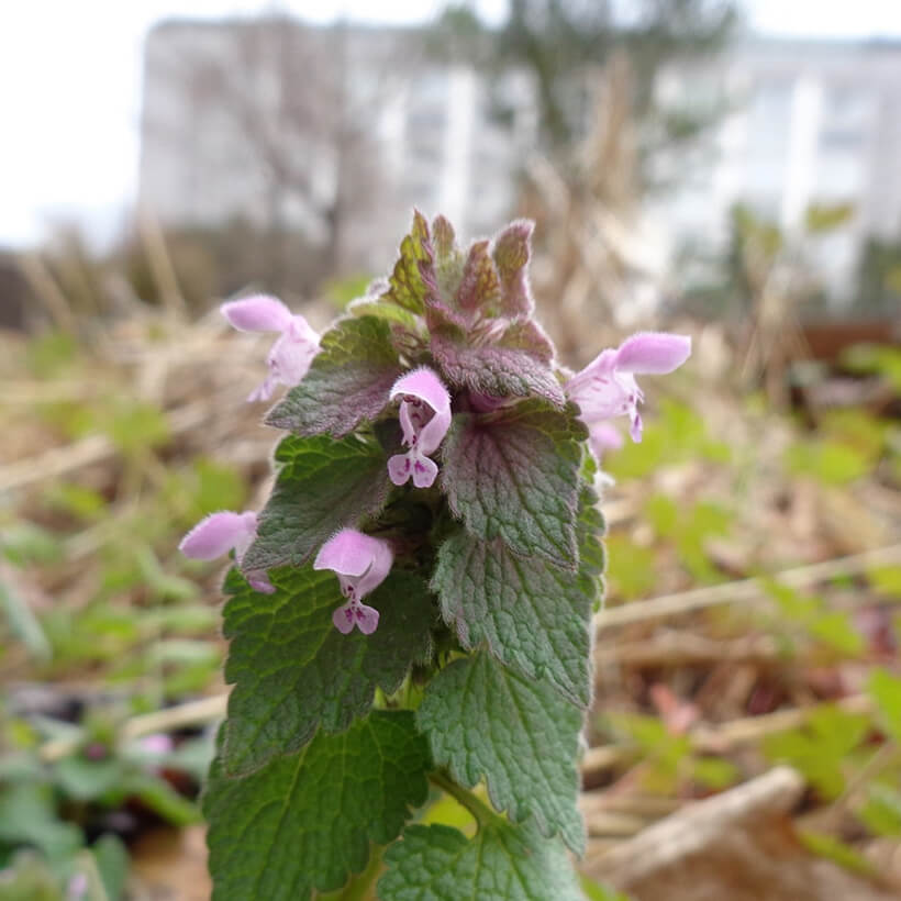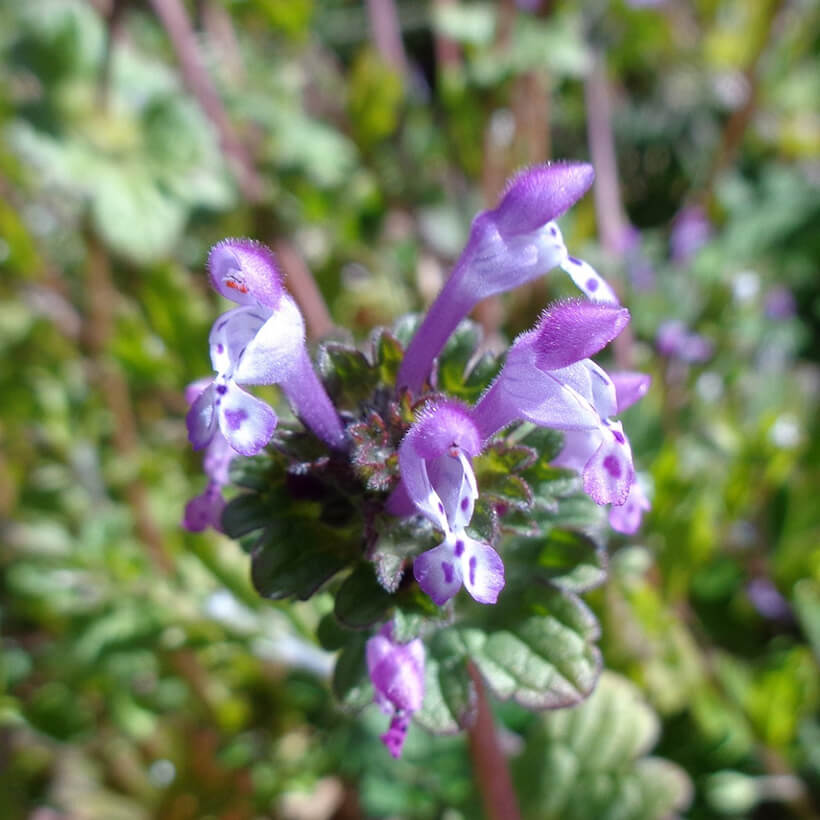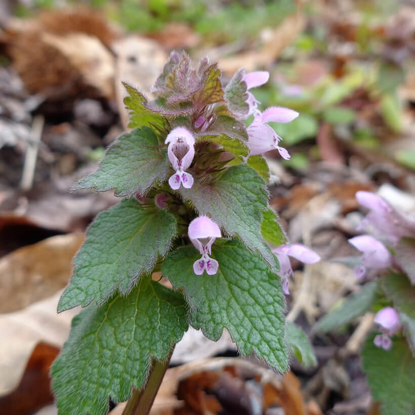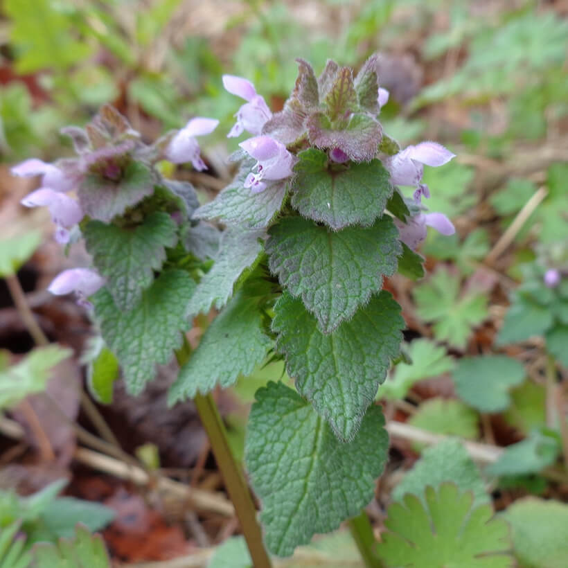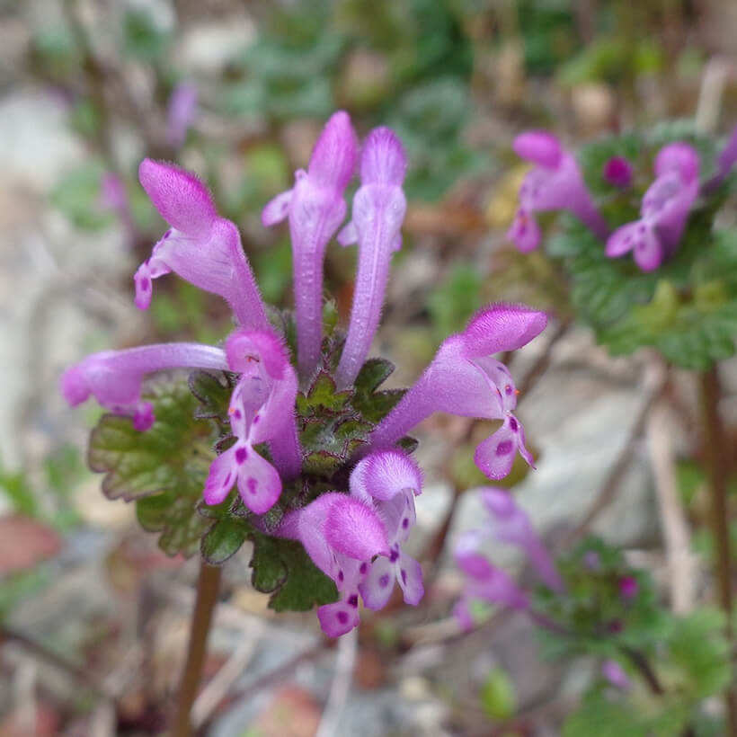 ③姫踊子草(ヒメオドリコソウ)が咲いています。花の形が仏の座に似ていますが違いがわかりますか?