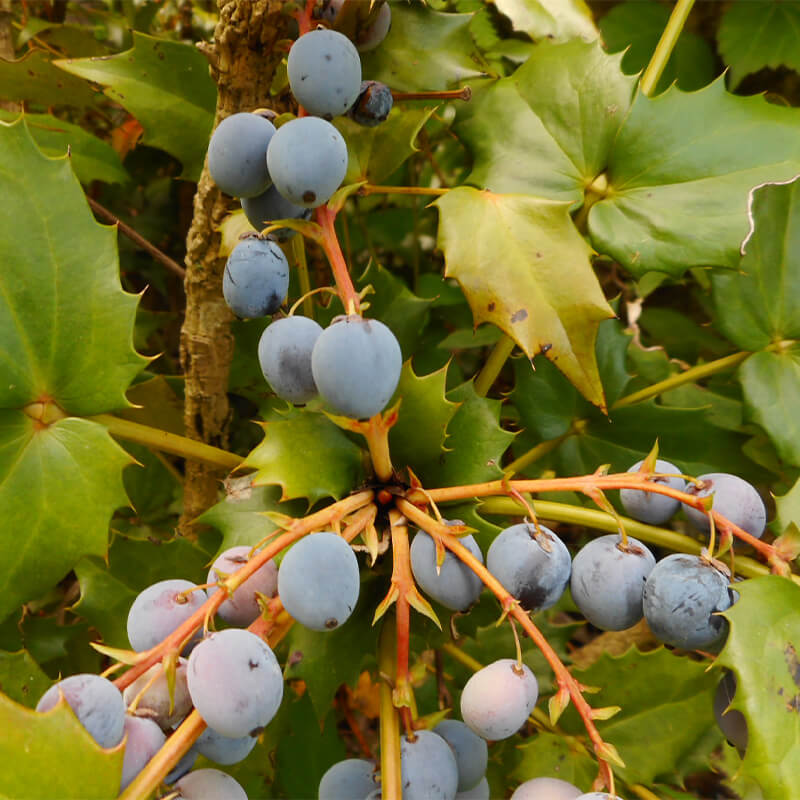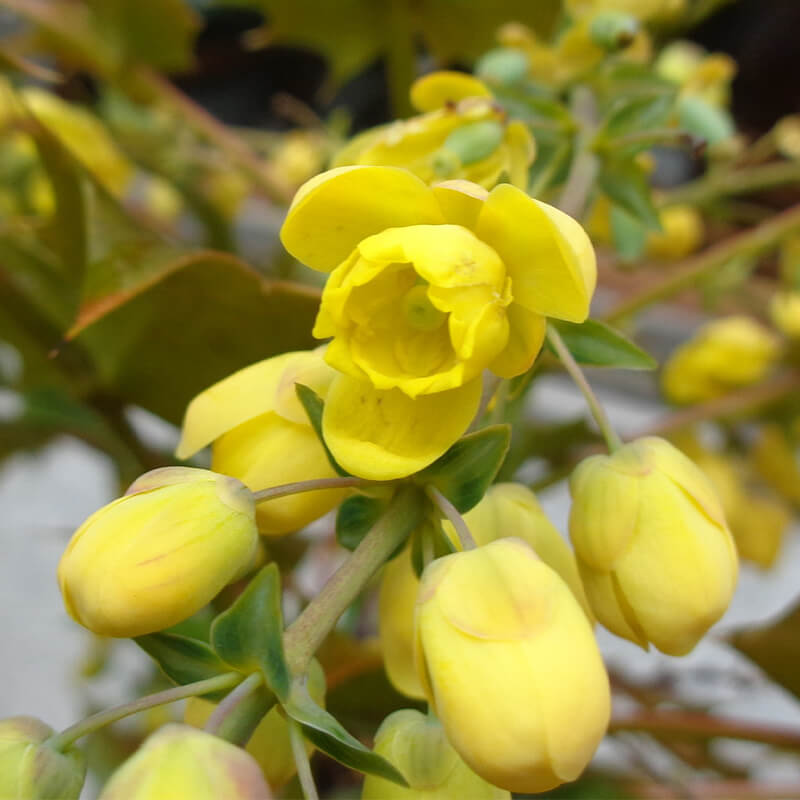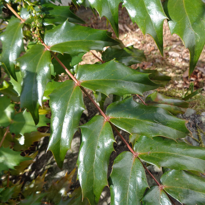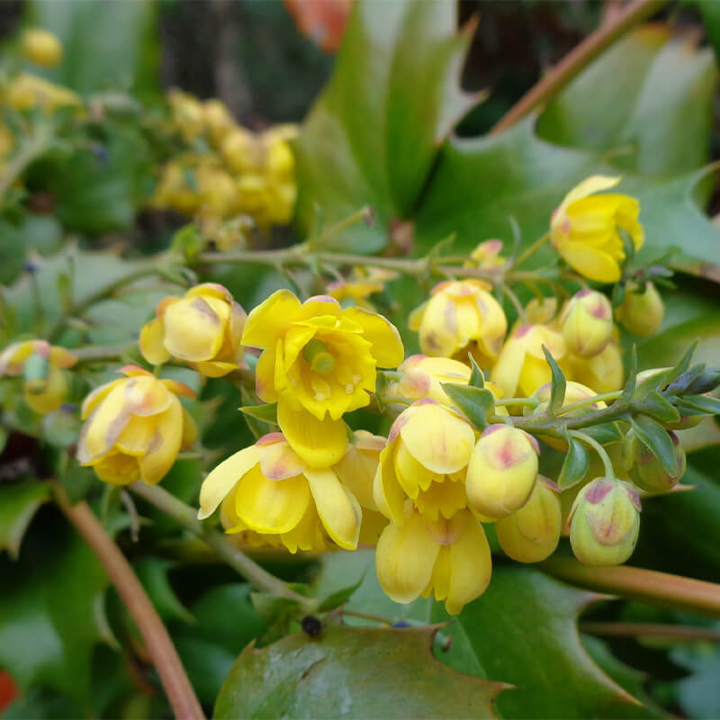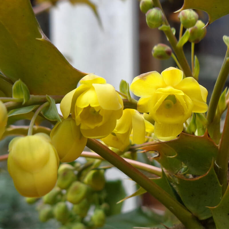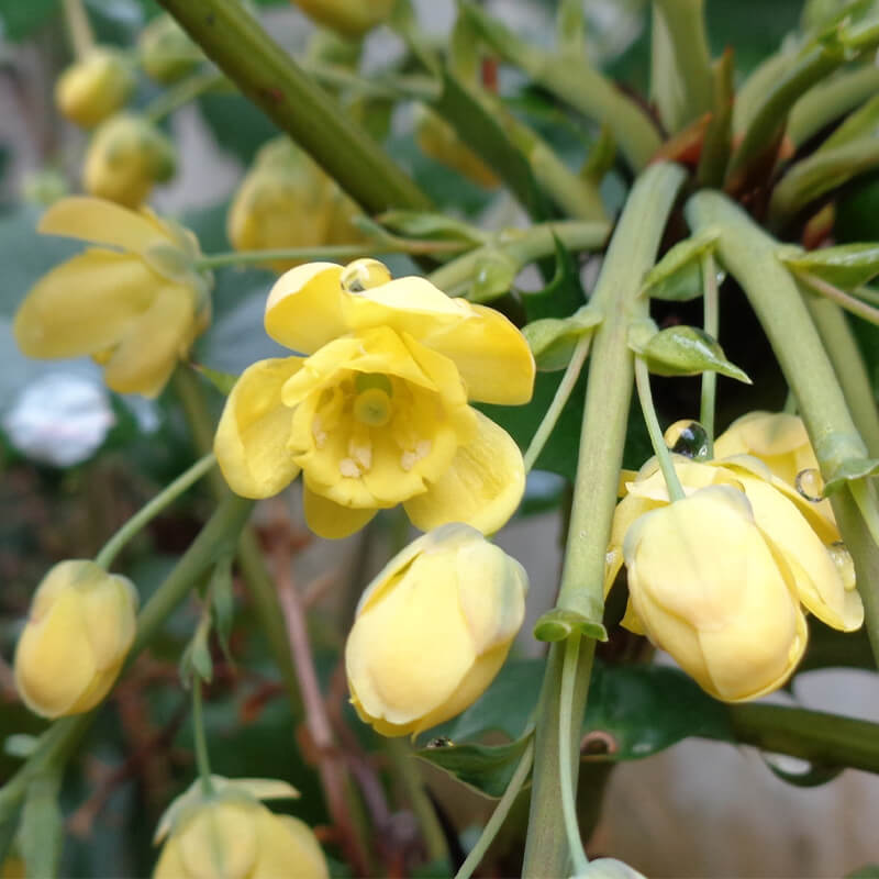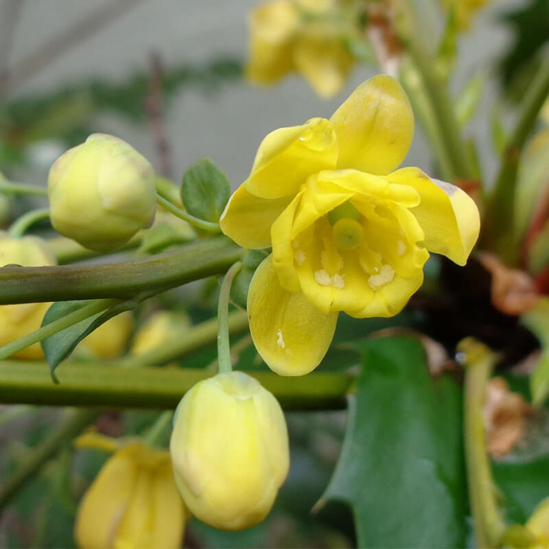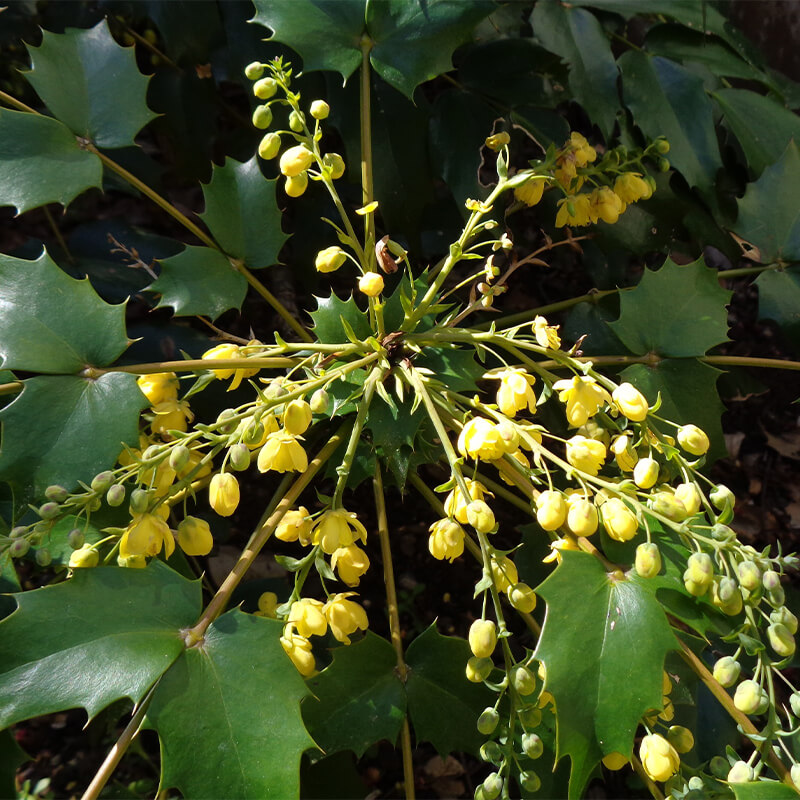 ②柊南天(ヒイラギナンテン)が咲いています。長い花穂に黄色い花をつけています。葉にトゲががり魔除けになります。