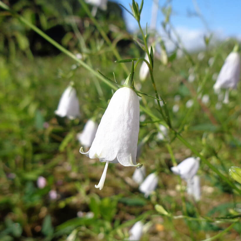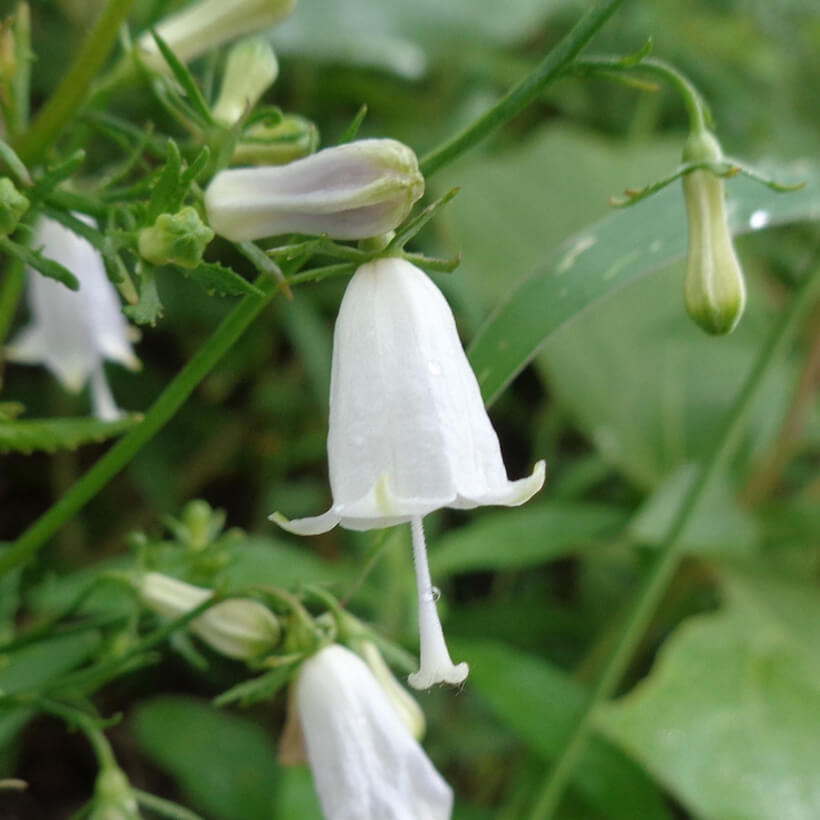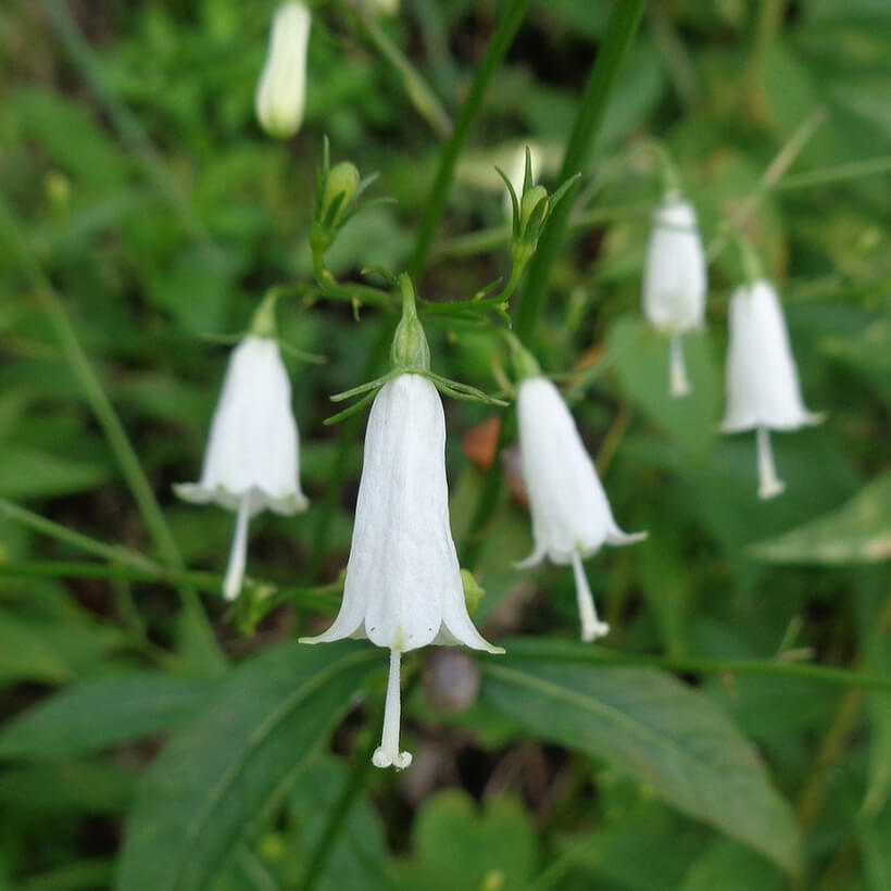 ②釣鐘人参(ツリガネニンジン)が咲いています。花の形が釣鐘形で、白く太い根が人参の形に似ていることからこの名になりました。涼しげな色で、風に揺られると今にも鳴り出しそうです。