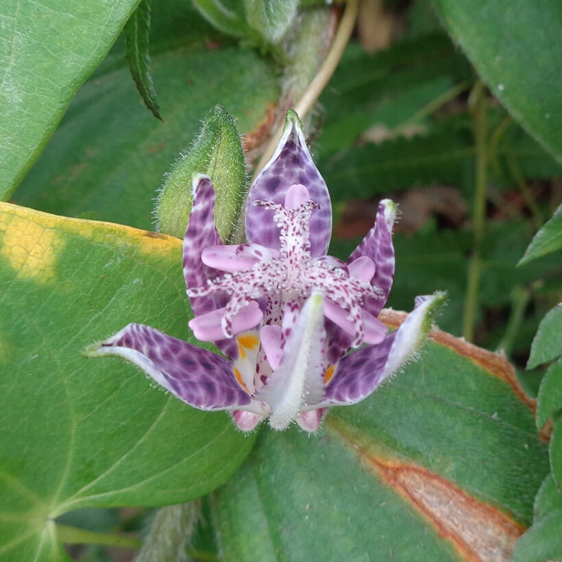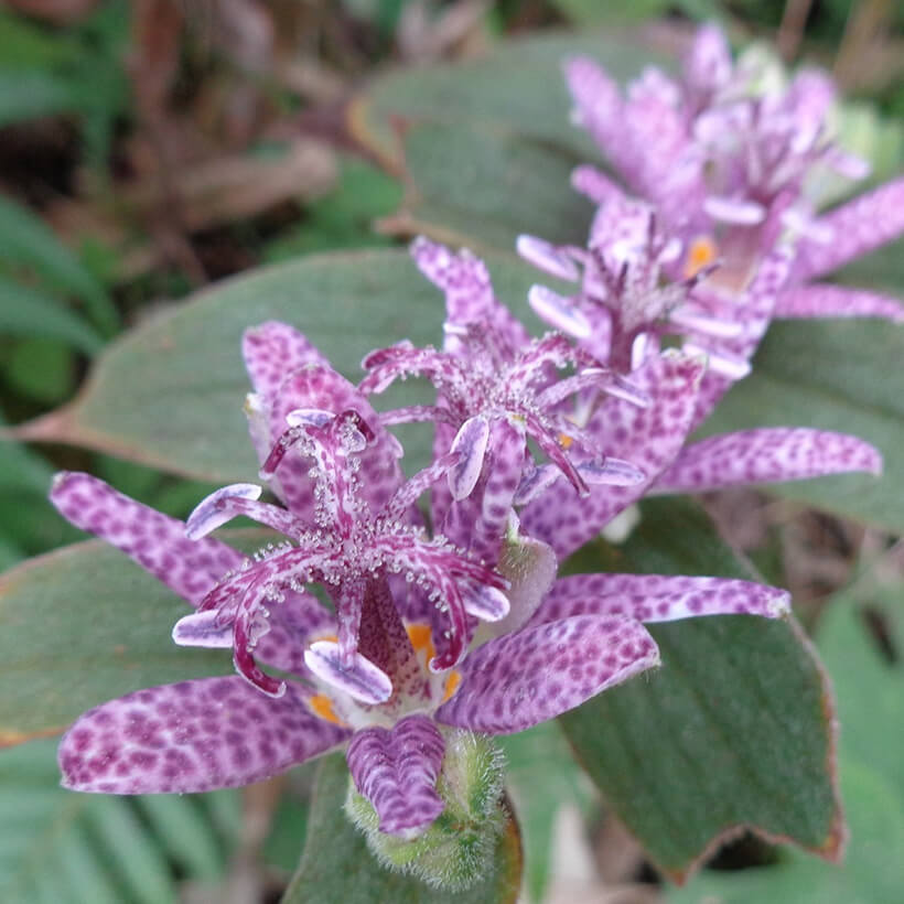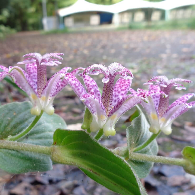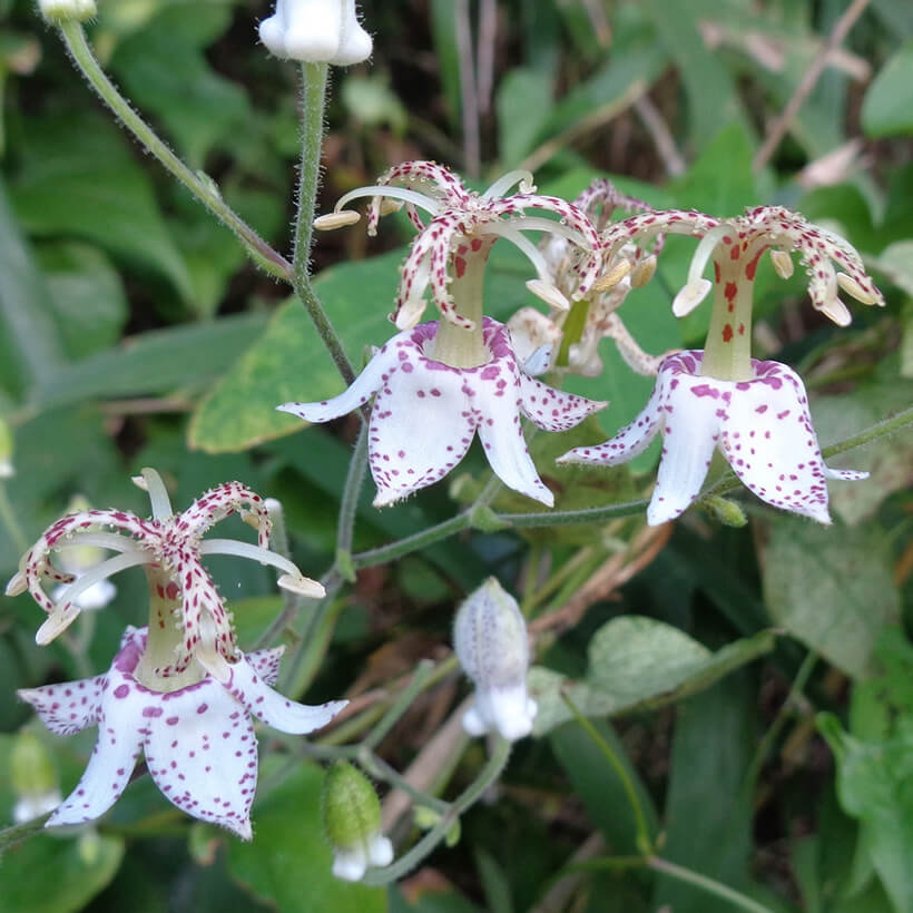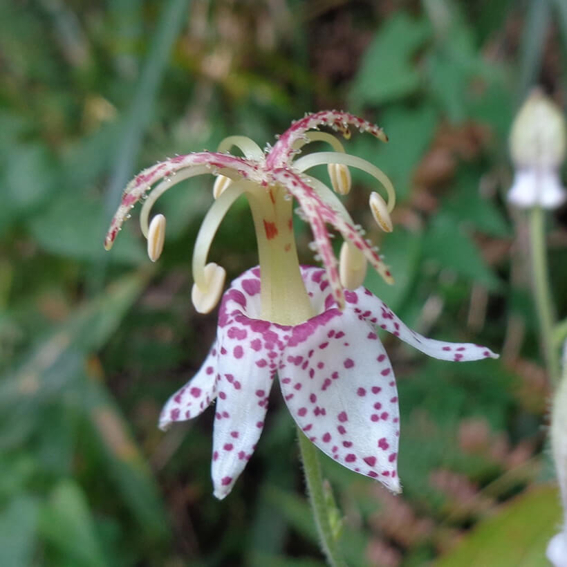 - ①山杜鵑(ヤマホトトギス)が咲いています。花びらとオシベに紫色の斑点が入り、その斑点が鳥のホトトギスの胸の模様に似ていることからこの名になりました。杜鵑よりもやや小型の花で、花弁が下に反り返るのが特徴です。
