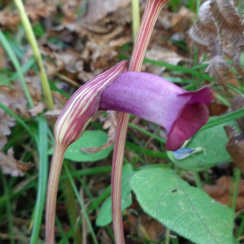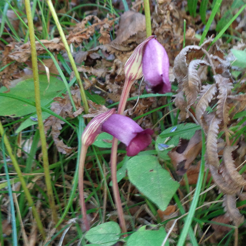 ②夏の猛暑の影響か開花がグッと遅れた南蛮煙管(ナンバンギセル)がやっと咲き始めました。万葉植物のひとつで万葉名は「思い草」。ススキの根に寄生する1年生の寄生植物なのでススキの根元をさがしてみてください。