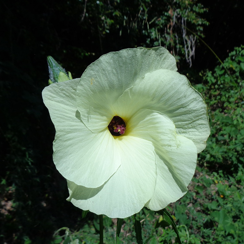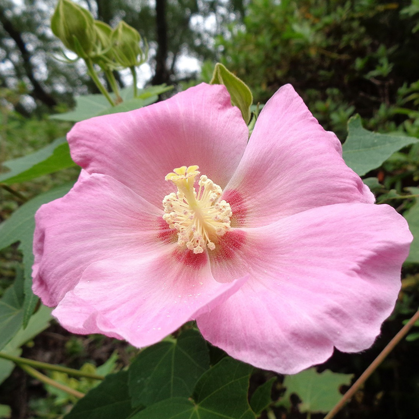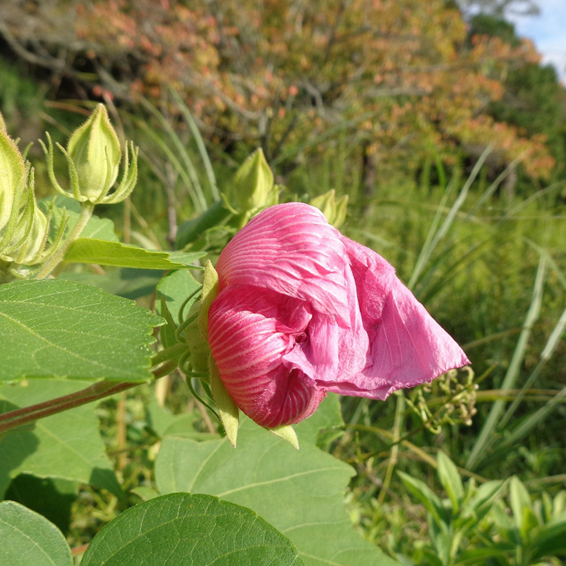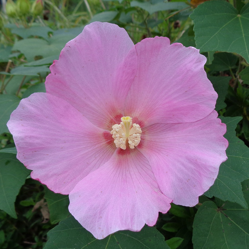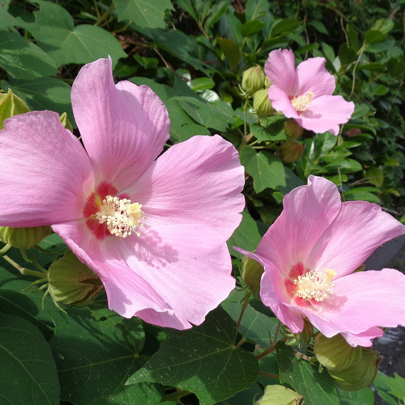 - ①黄蜀葵(トロロアオイ)が咲いています。根に粘り気のある白い液を含んでおり、これをトロロになぞらえてこの名がつきました。直径10〜20cmのクリーム色の花で、オクラの花に似ているので「ハナオクラ」とも言われます。