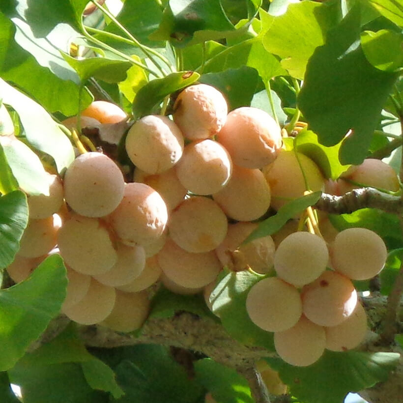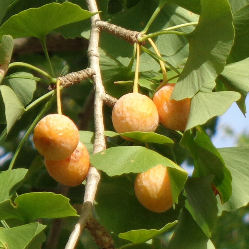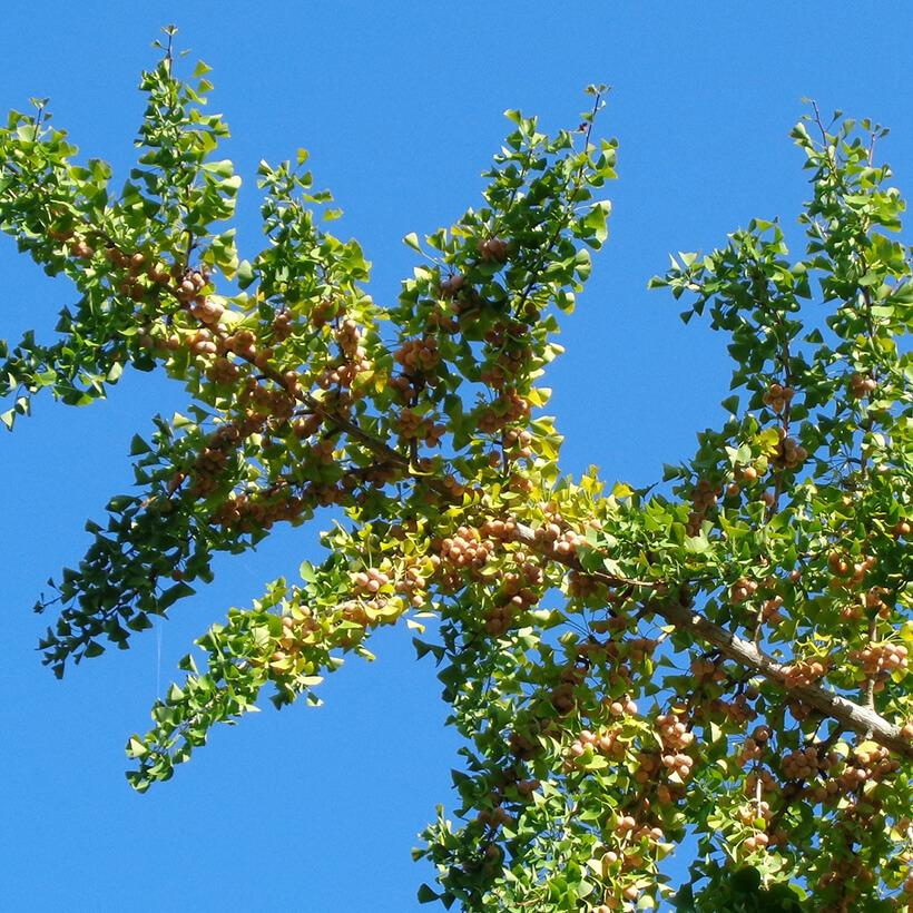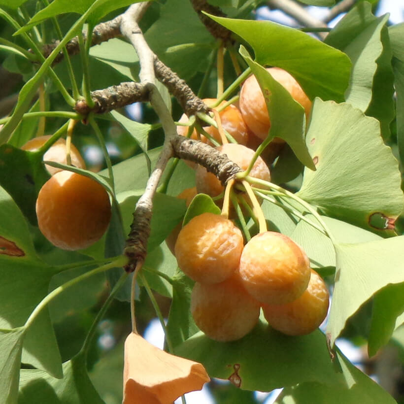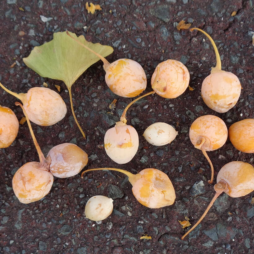 - ①公孫樹(イチョウ)の実が音をたてて地面に落ちています。公孫樹には雌と雄の木があり雌の木にしか実はつきません。「公」は祖父の尊称で、祖父がタネをまいても実を収穫できるのは孫の代になることからこの名になりました。