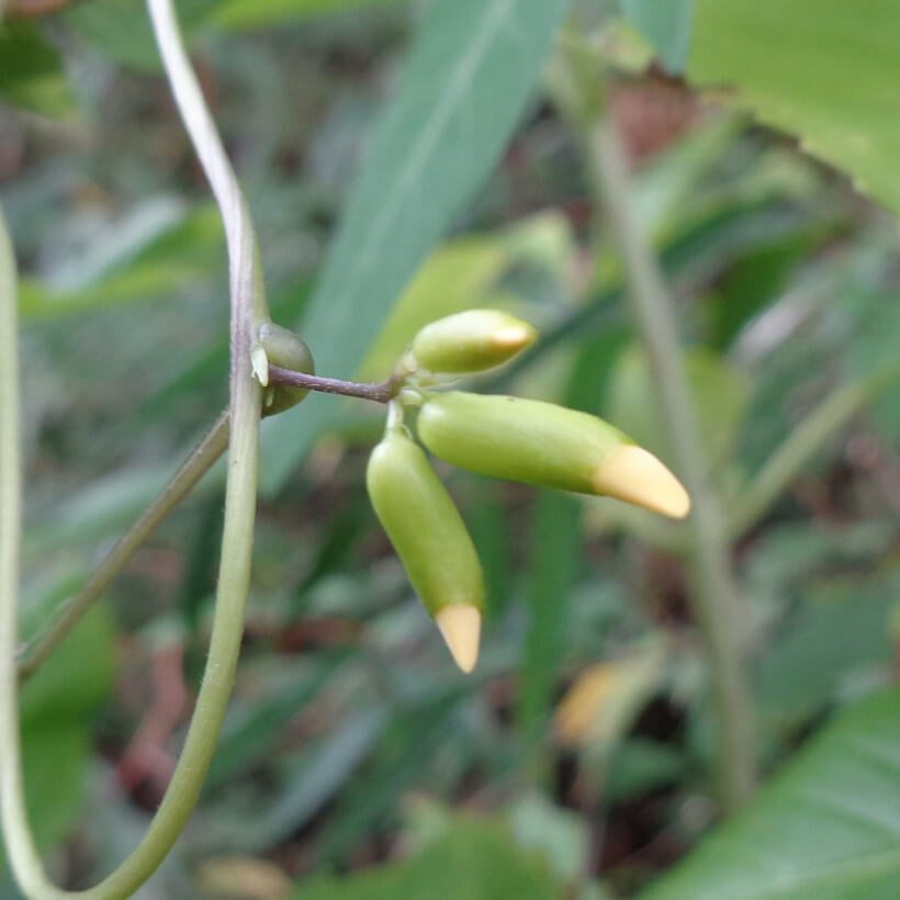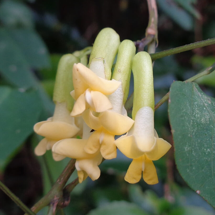②野大角豆(ノササゲ)が咲いています。黄色の蝶形の花を咲かせ、ツルでどんどん伸びて他の植物に絡み付いています。