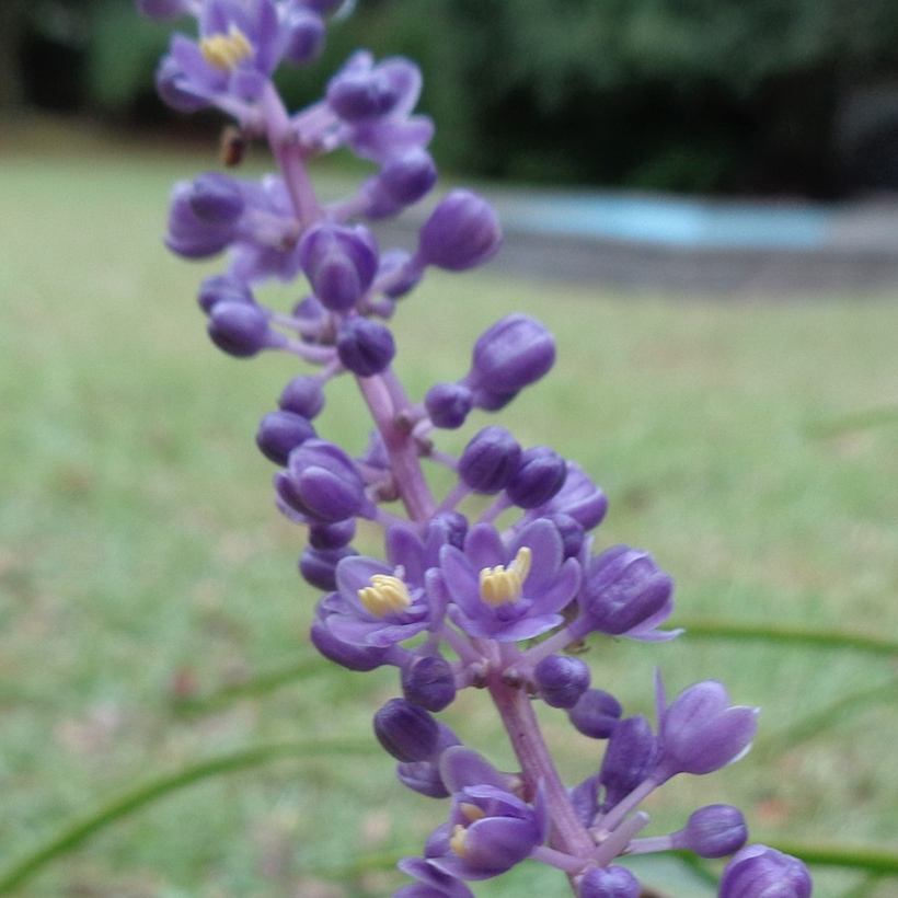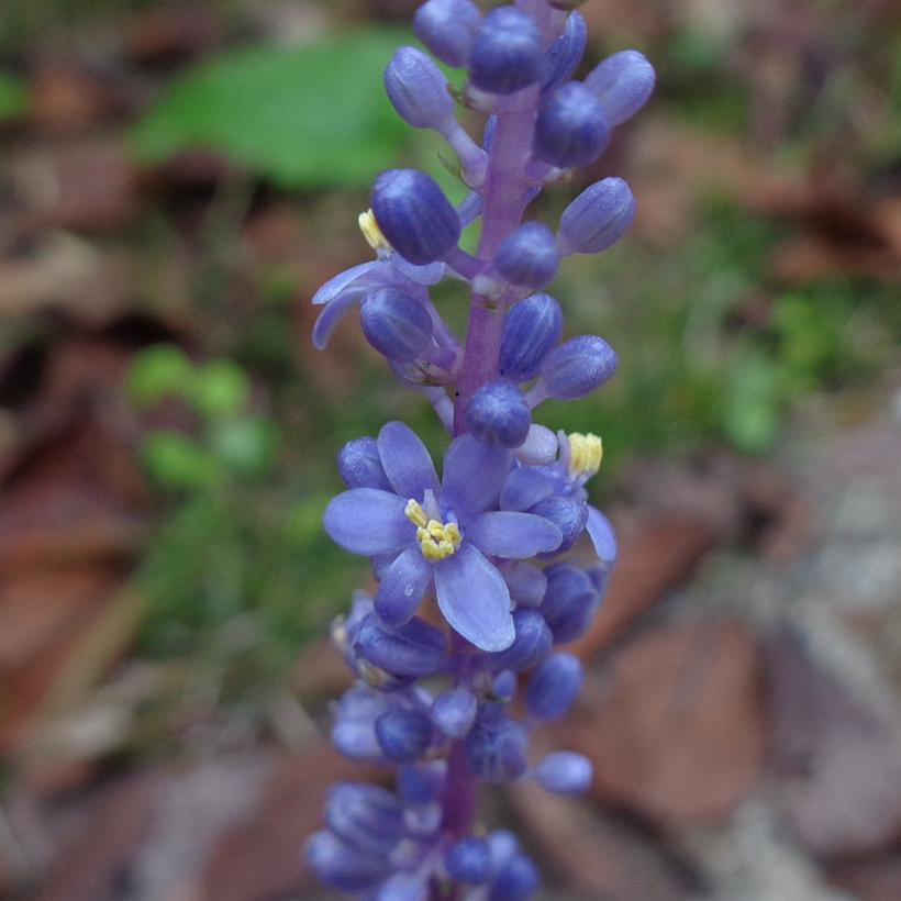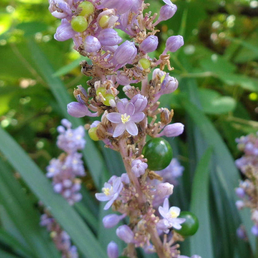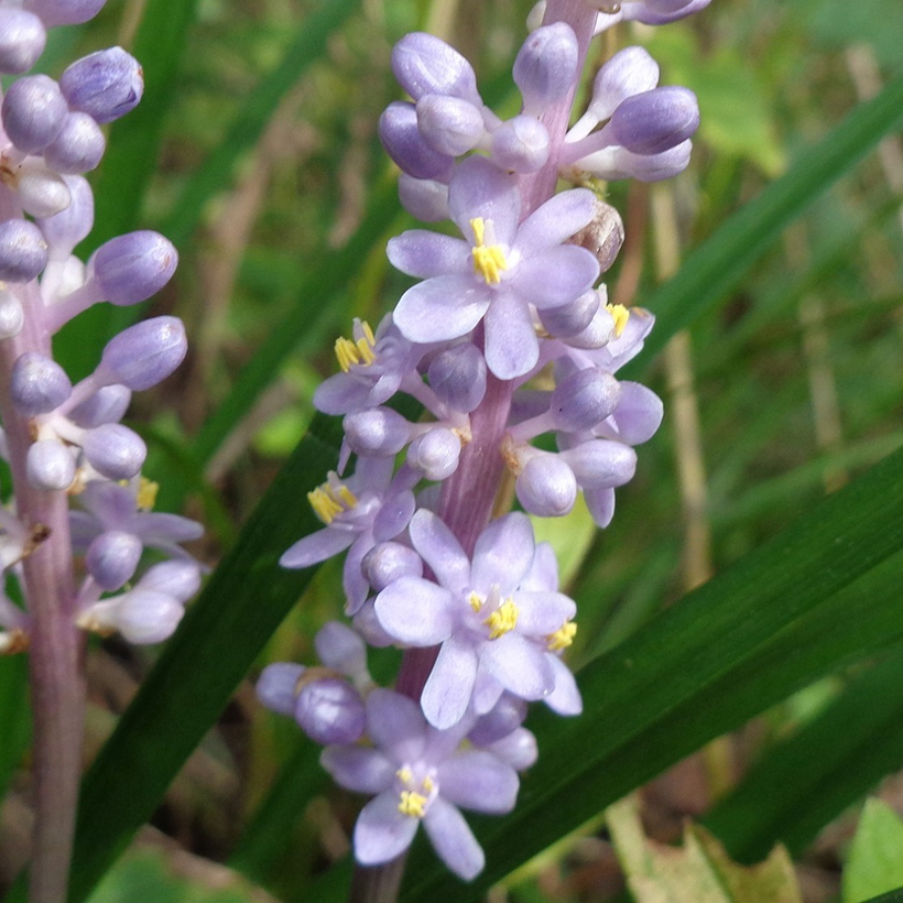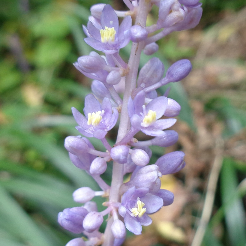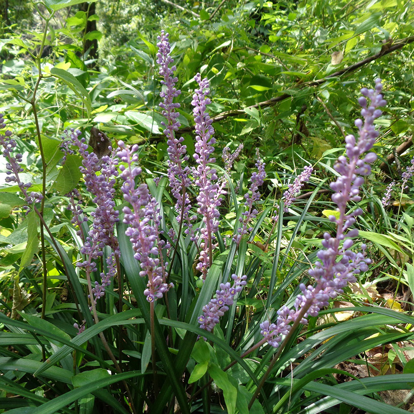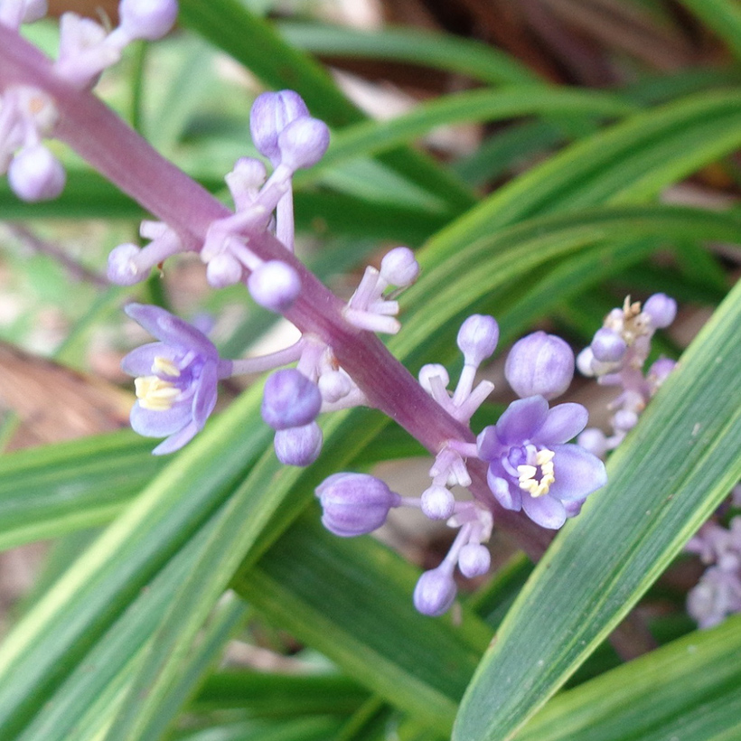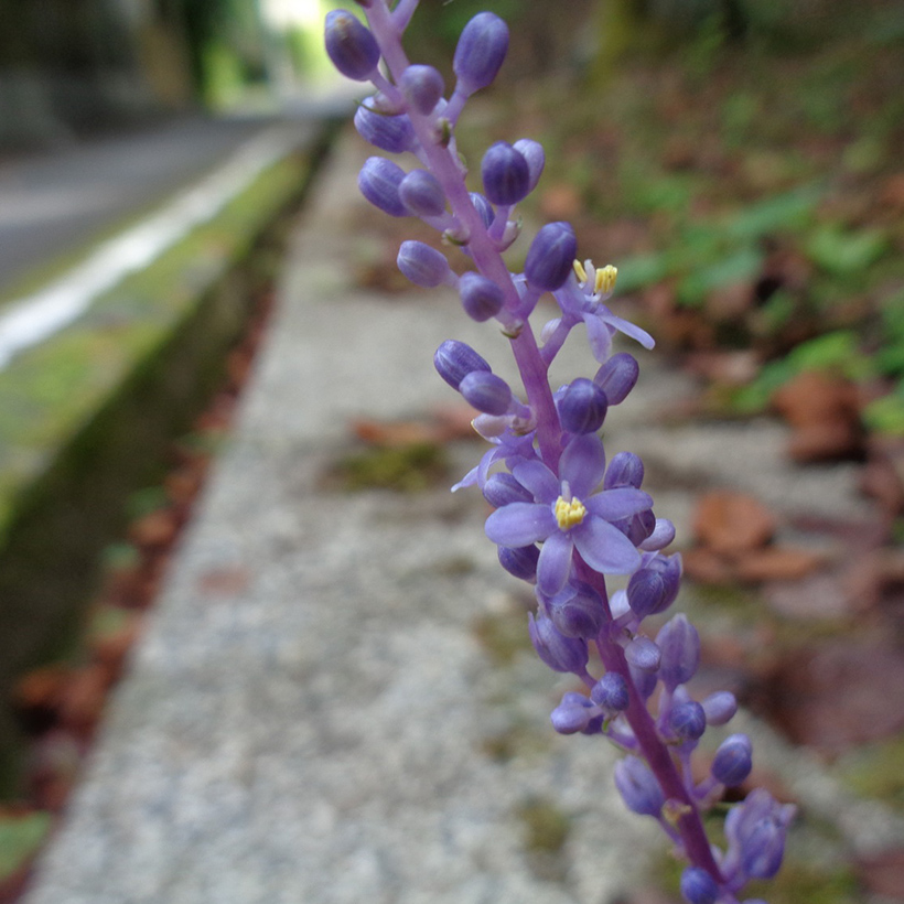 ②藪蘭(ヤブラン)が咲いています。花は夏に咲く姫藪蘭(ヒメヤブラン)に似ていて直径7mm程の淡紫色の小さな花です。花茎の高さは30〜50cmで総状にたくさんついています。