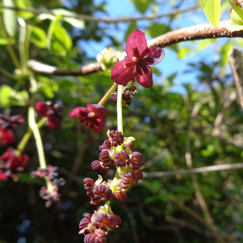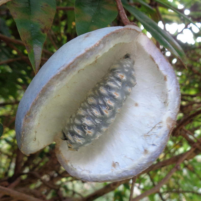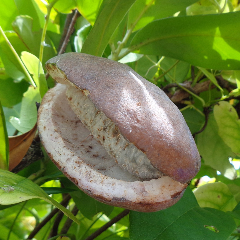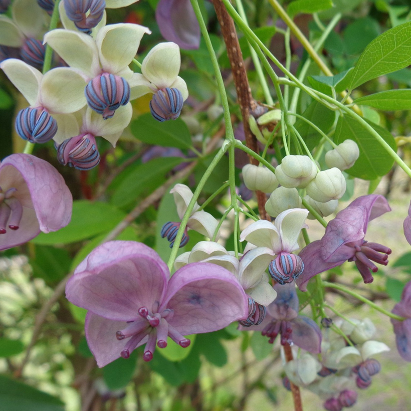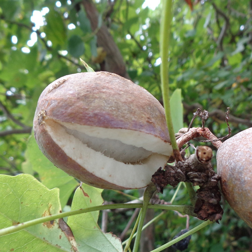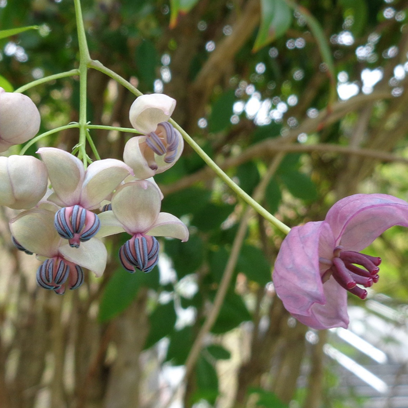 - ①木通(アケビ)と三葉木通(ミツバアケビ)の実が割れ始めました。実が熟して割れた様子が、人の「あくび」に似ていて「あけび」に変化したのが名の由来。中のバナナみたいな部分が食べられますが、種ばかりで種は吐き出します。