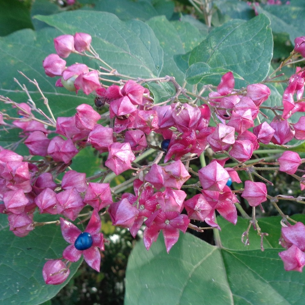 - ①烏瓜(カラスウリ)の実が熟して色々な所にぶら下がっています。種は「打ち出の小槌」や「大黒様の顔」に似ているため、お金を呼ぶ縁起物として知られており、財布の中に入れる人もいるそうです。