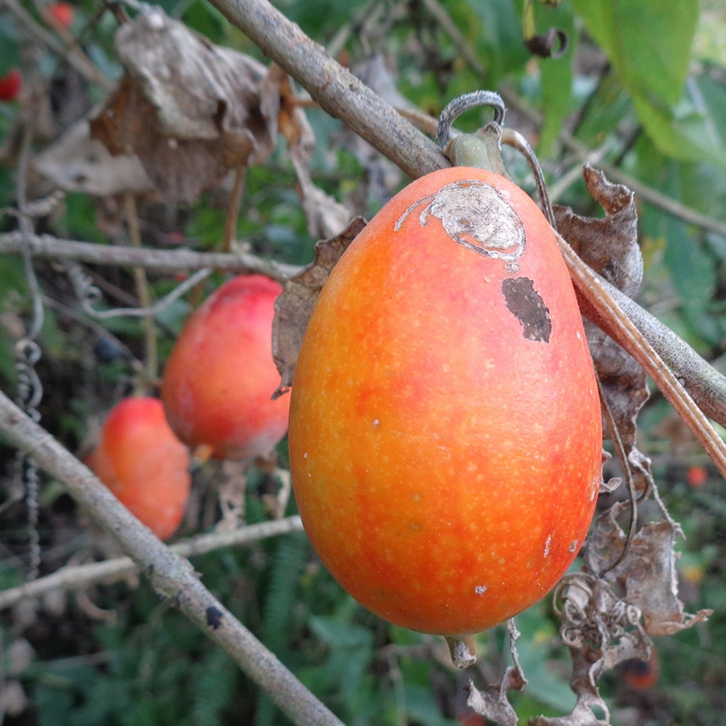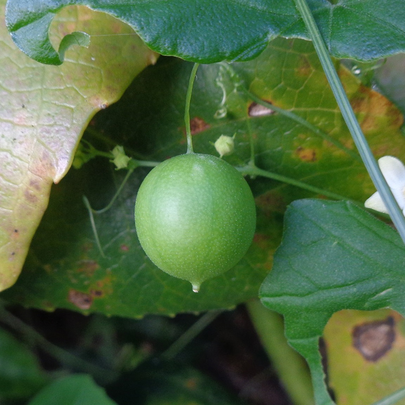 ②雀瓜(スズメウリ)の実がたくさんぶら下がっています。直径1〜2cmの球形で熟すと灰白色になります。