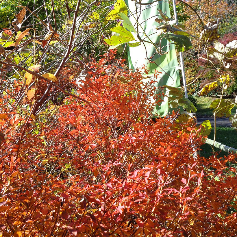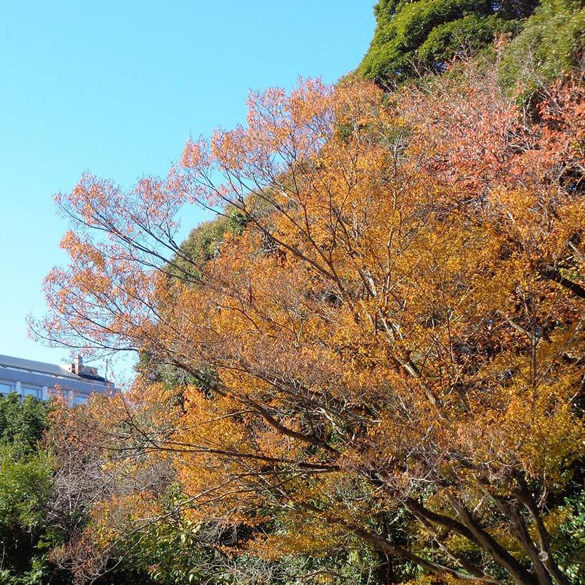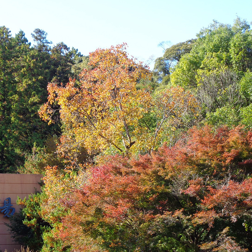 ▲温泉館前の南京黄櫨(ナンキンハゼ)とイロハ紅葉(モミジ)