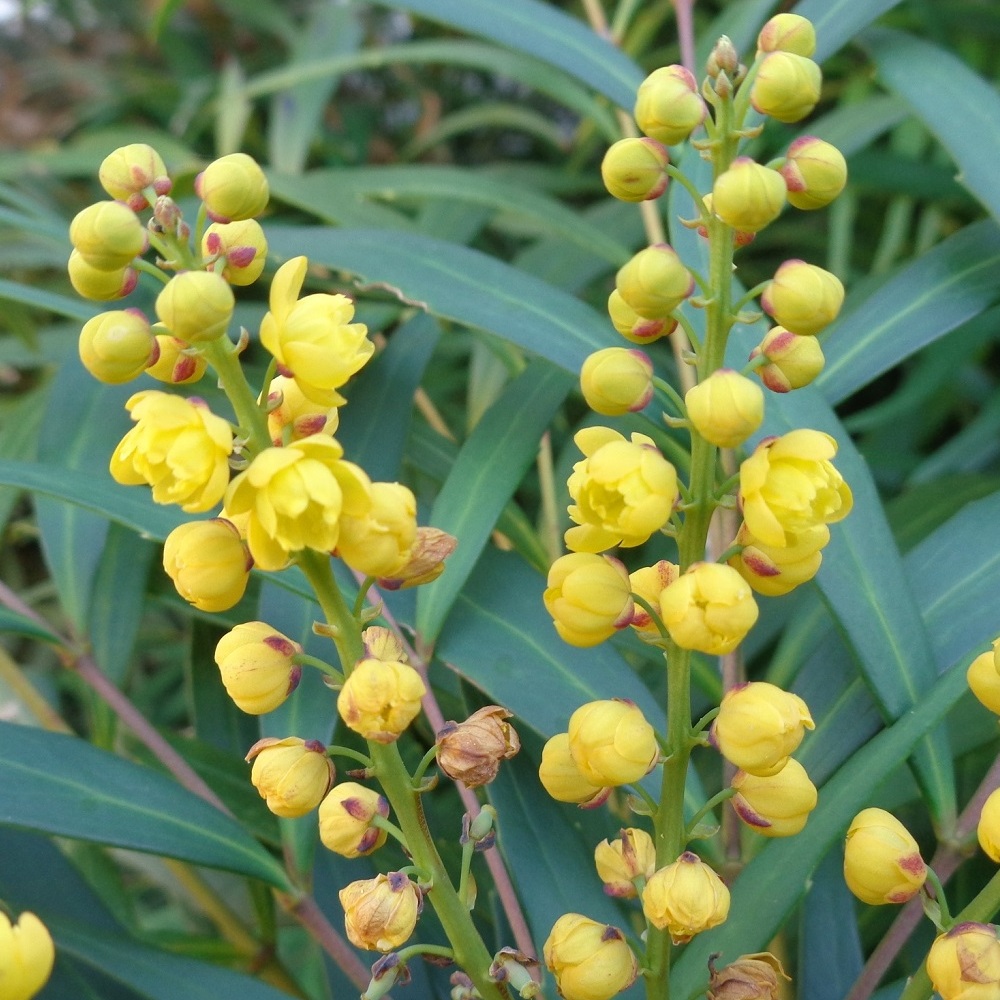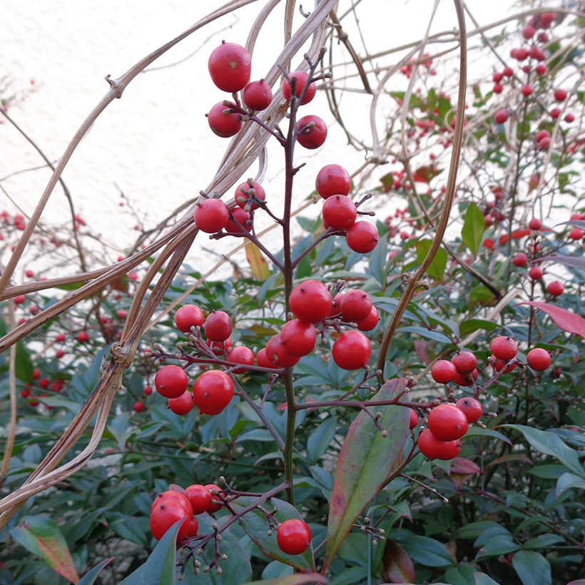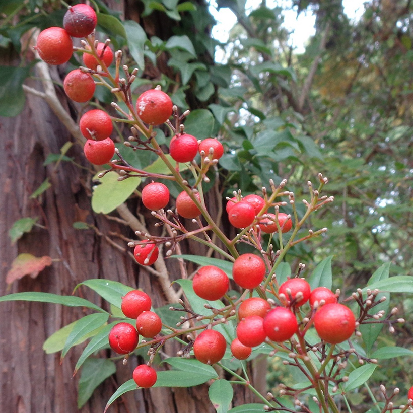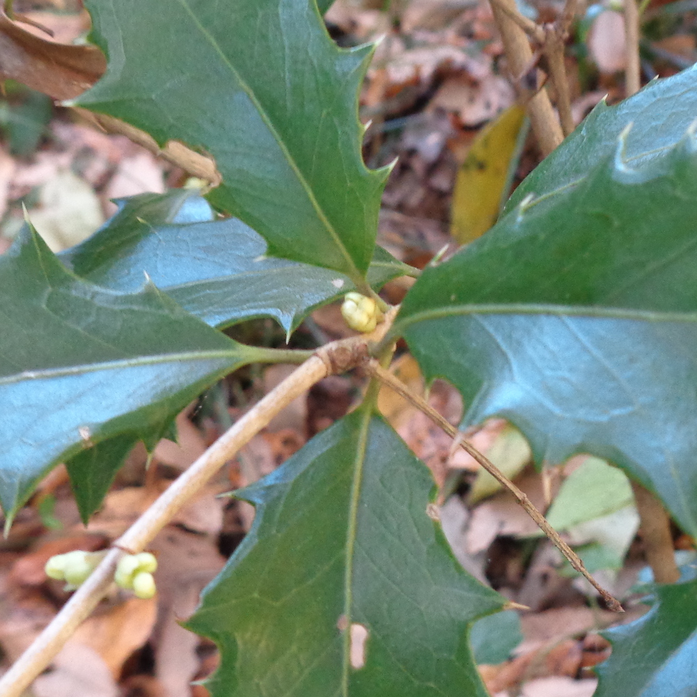 - ①南天(ナンテン)の実が赤く熟しています。「難を転じて福となす」という意味合いが込められて縁起物として長年愛されています。また、乾燥した実はセキを鎮める効果があり薬として使われます。ナンテンのど飴〜♪
