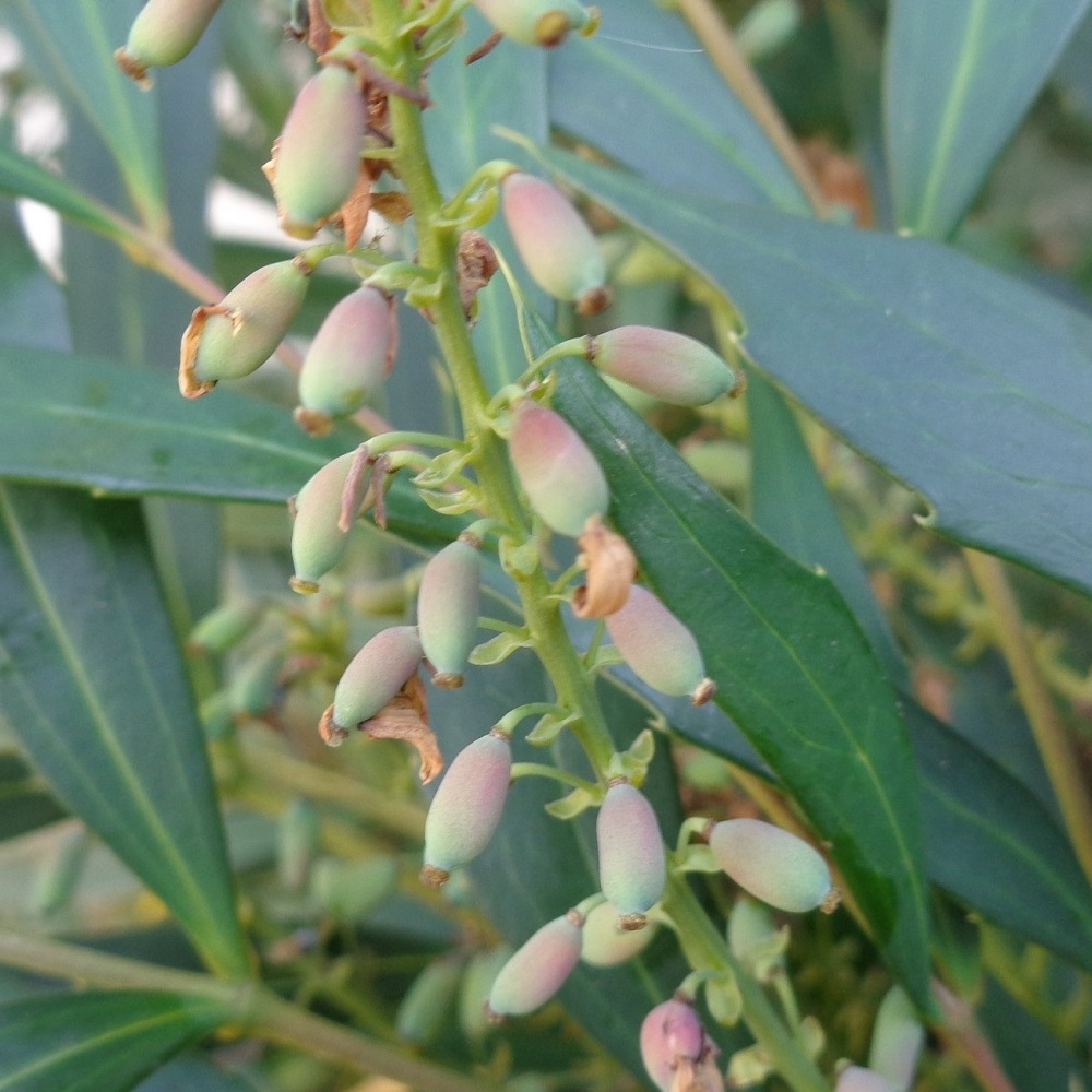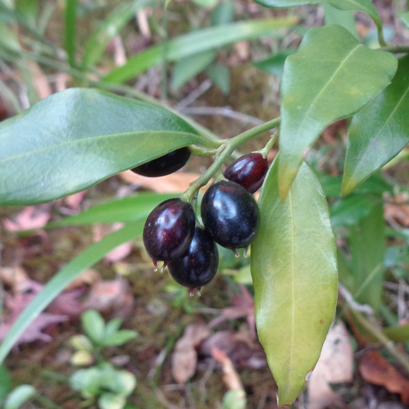 ②サルココッカの実がついています。実は一旦赤くなった後黒褐色に熟します。実にも甘い香りがあり野鳥の好物です。