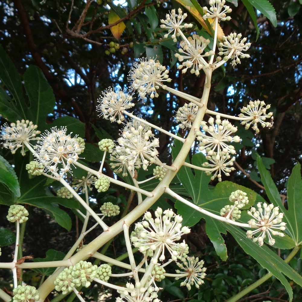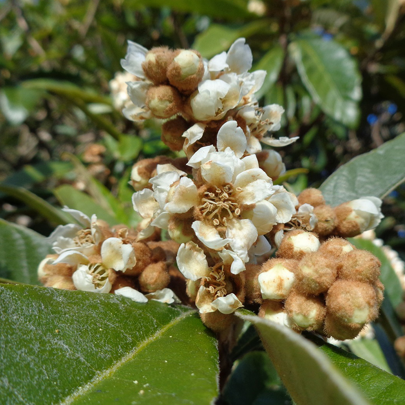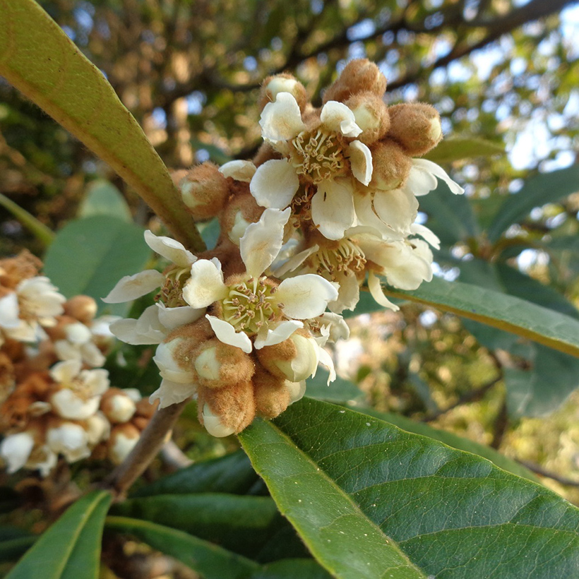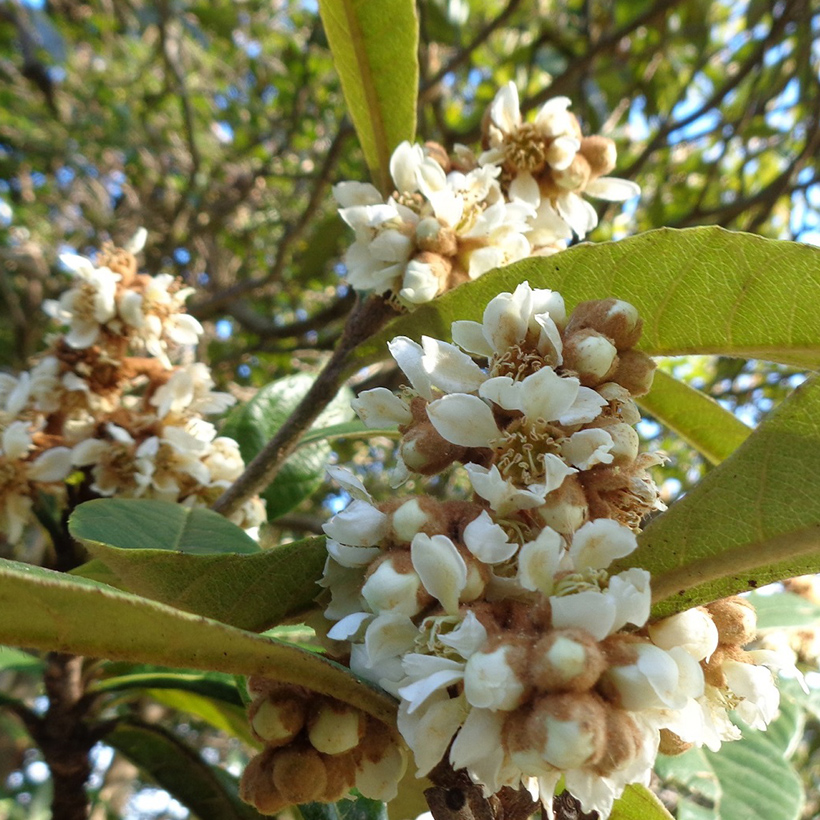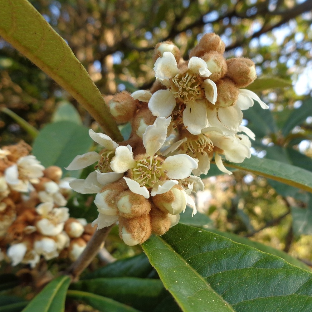 - ①枇杷(ビワ)が咲いています。大きな葉に隠れる様に白い花が咲いているので気がつかない方も多いと思います。花はバニラのような甘い香りがし、6月には美味しい実が生ります。