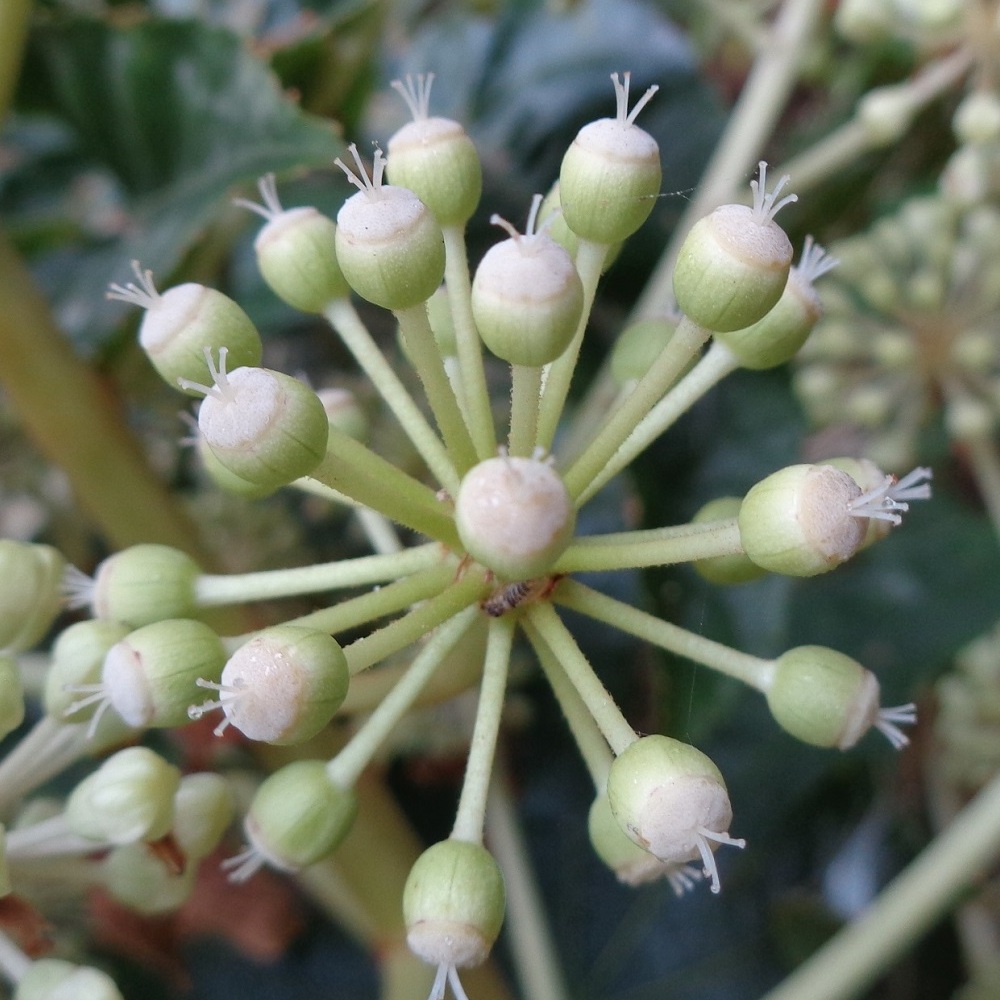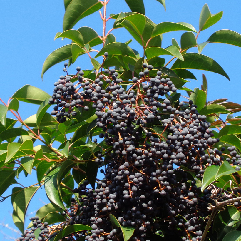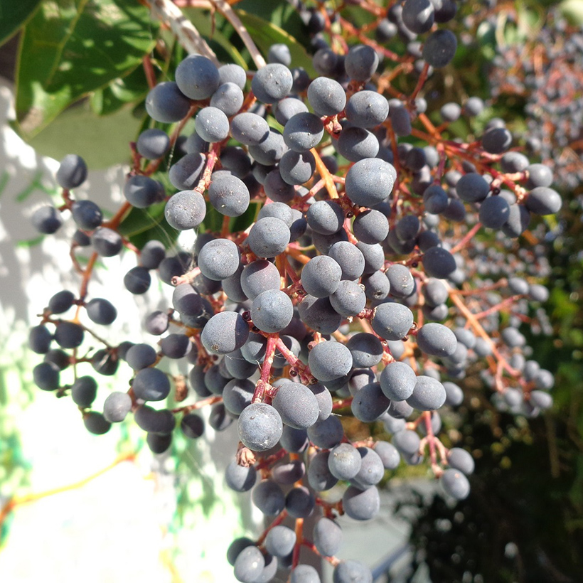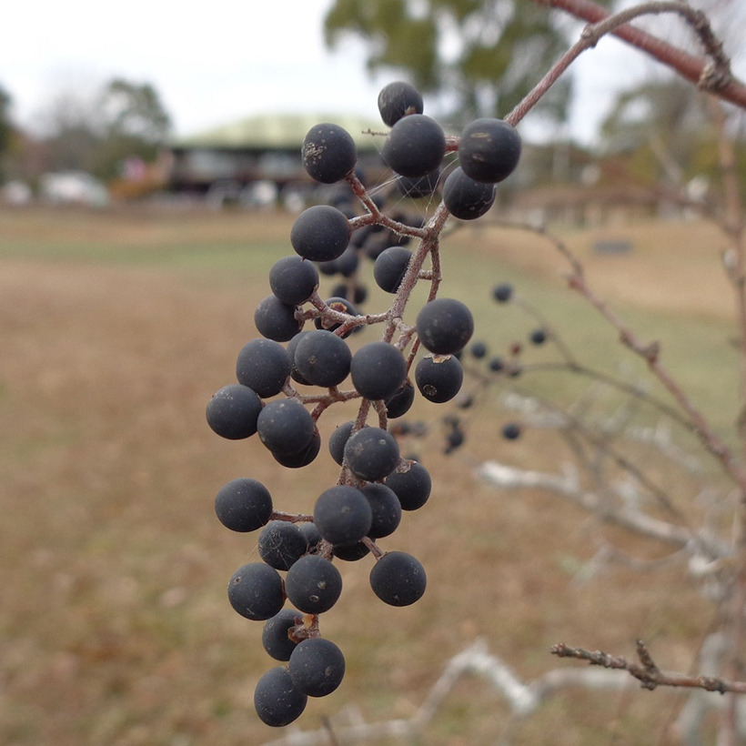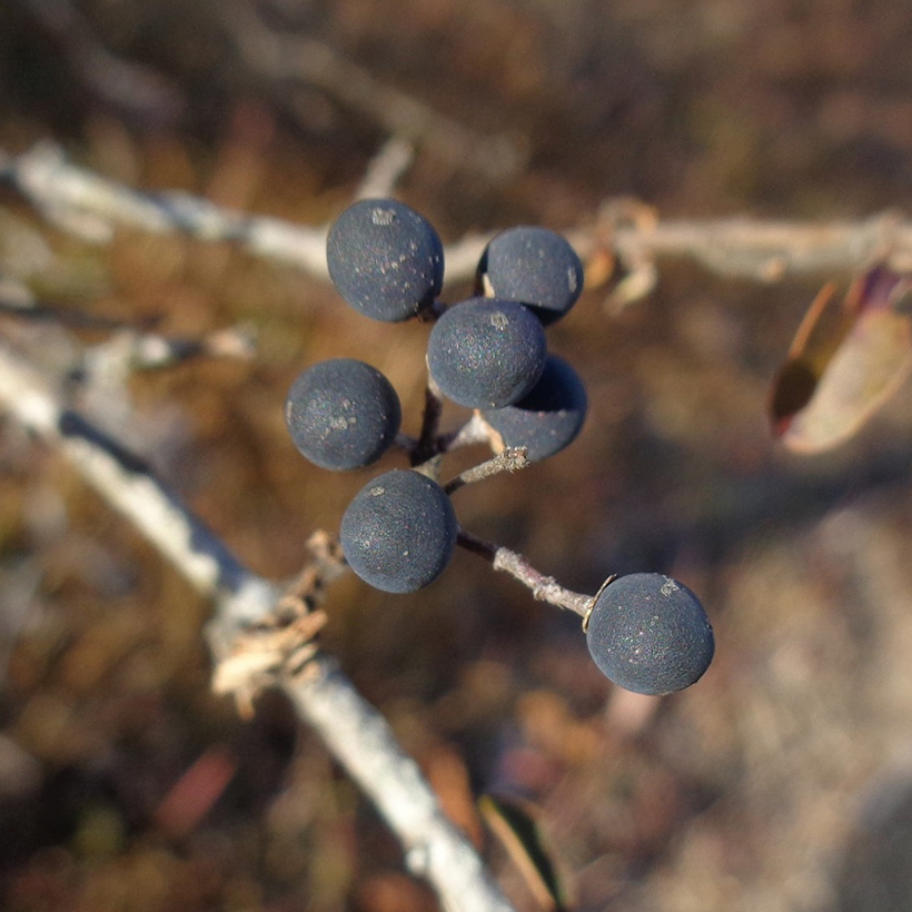 ④プリペットの実が生っています。枝の先に黒く小さな実を房状にたくさんつけていて小さな葡萄の房のようです。