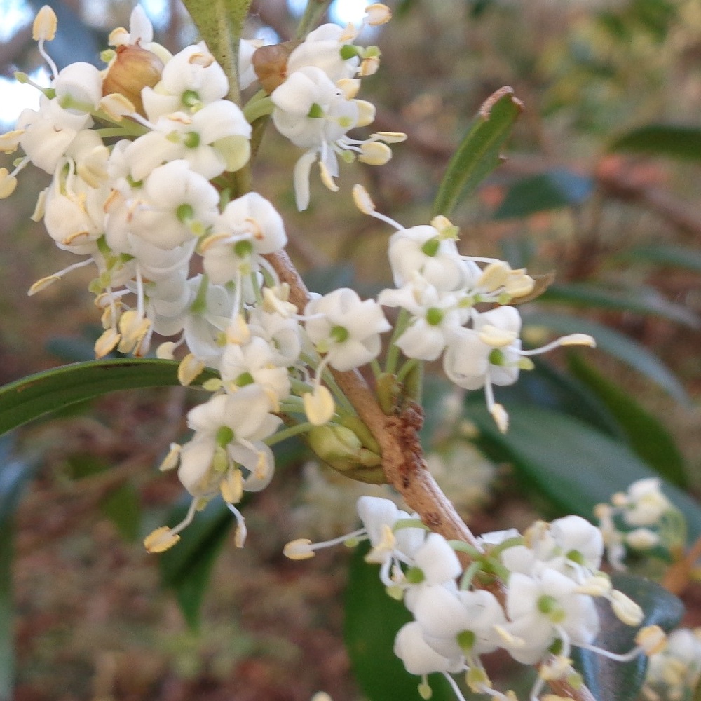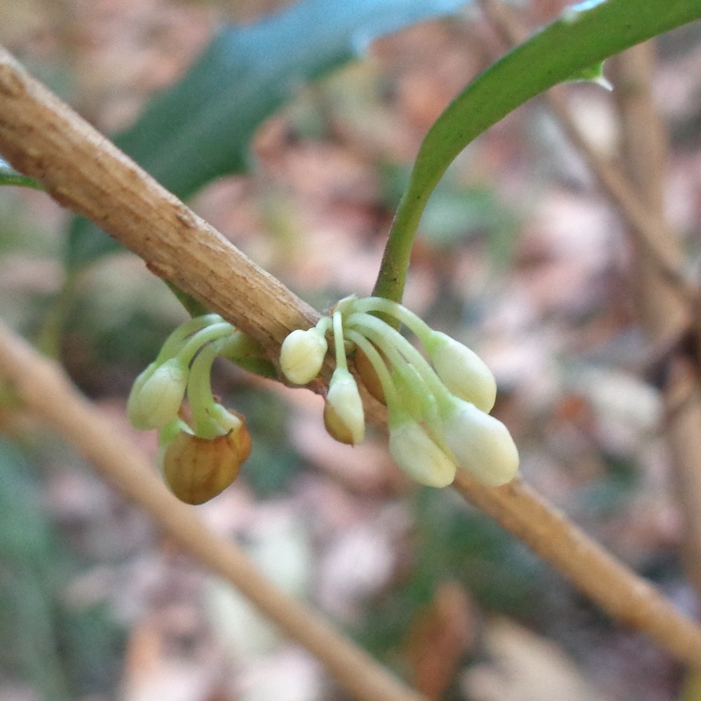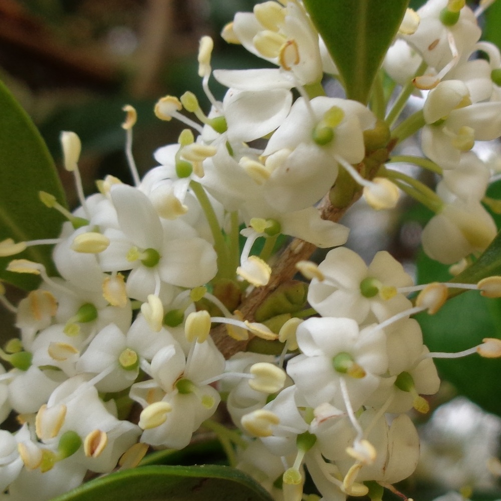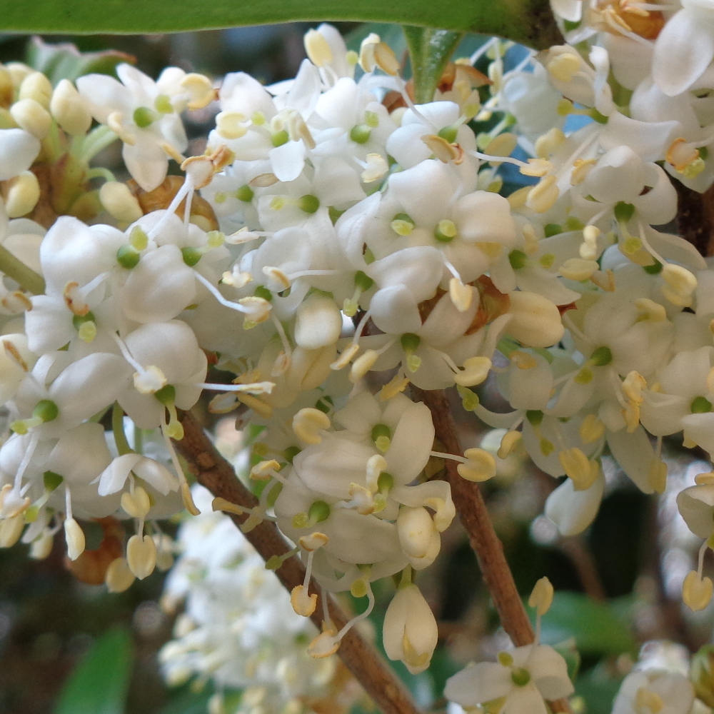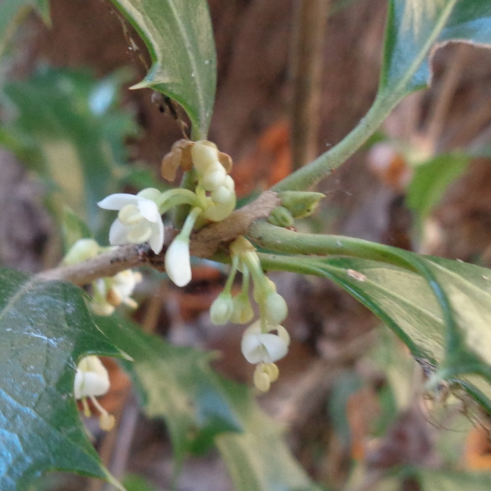 - ①柊木犀(ヒイラギモクセイ)が咲いています。クリームのようないい香りがする白い小さな花で、銀木犀(ギンモクセイ)と柊(ヒイラギ)の交雑種といわれています。