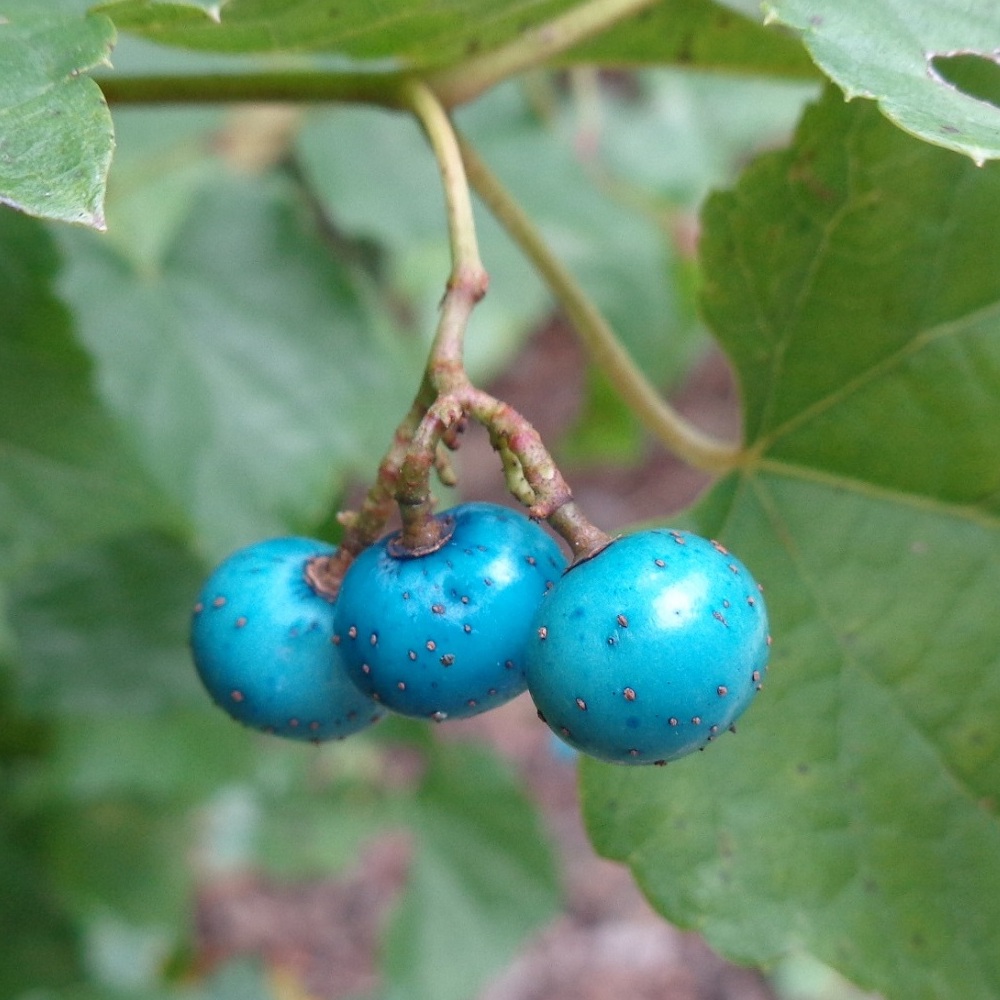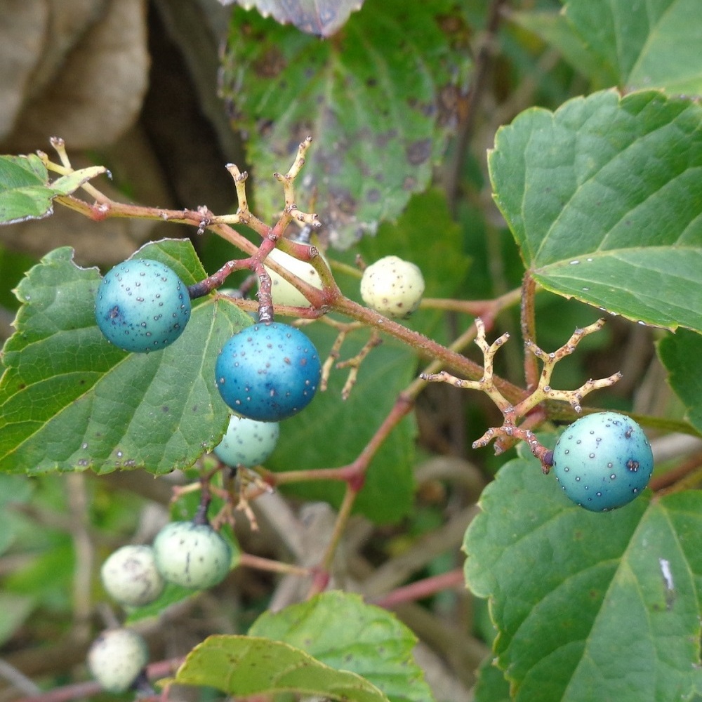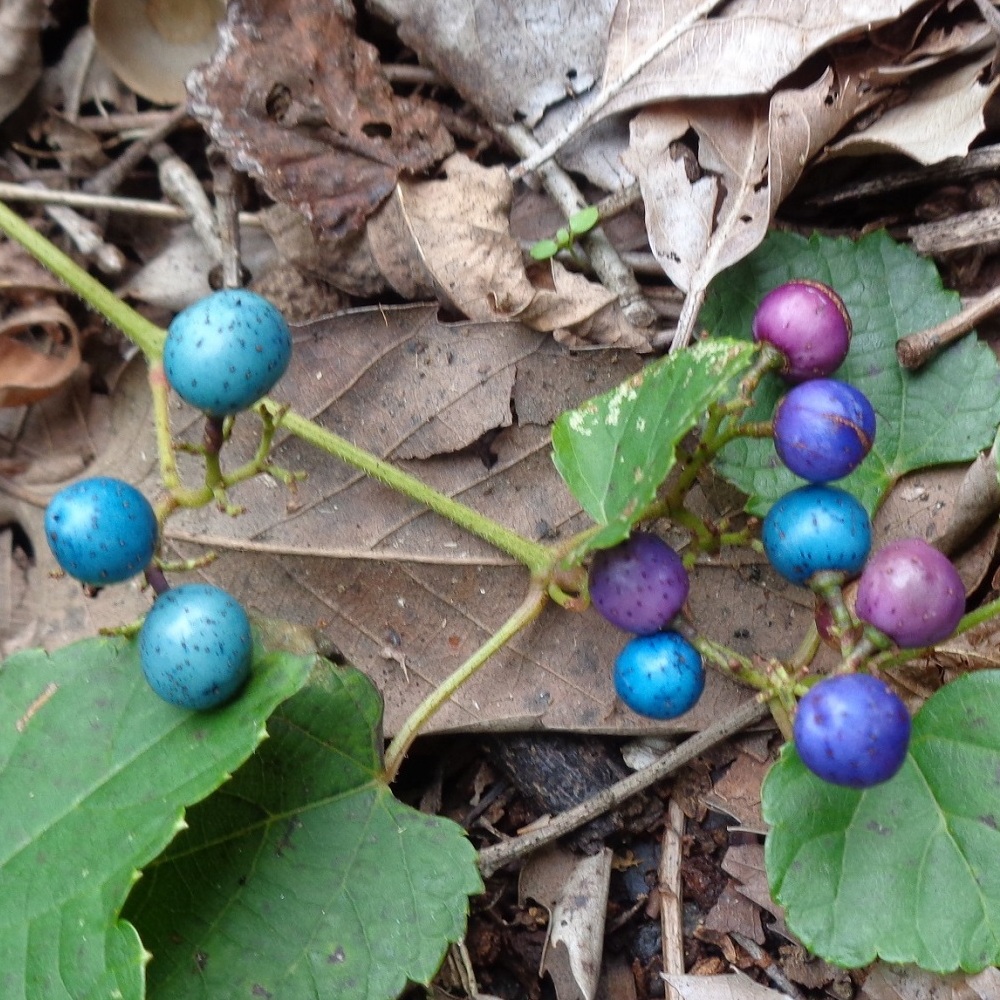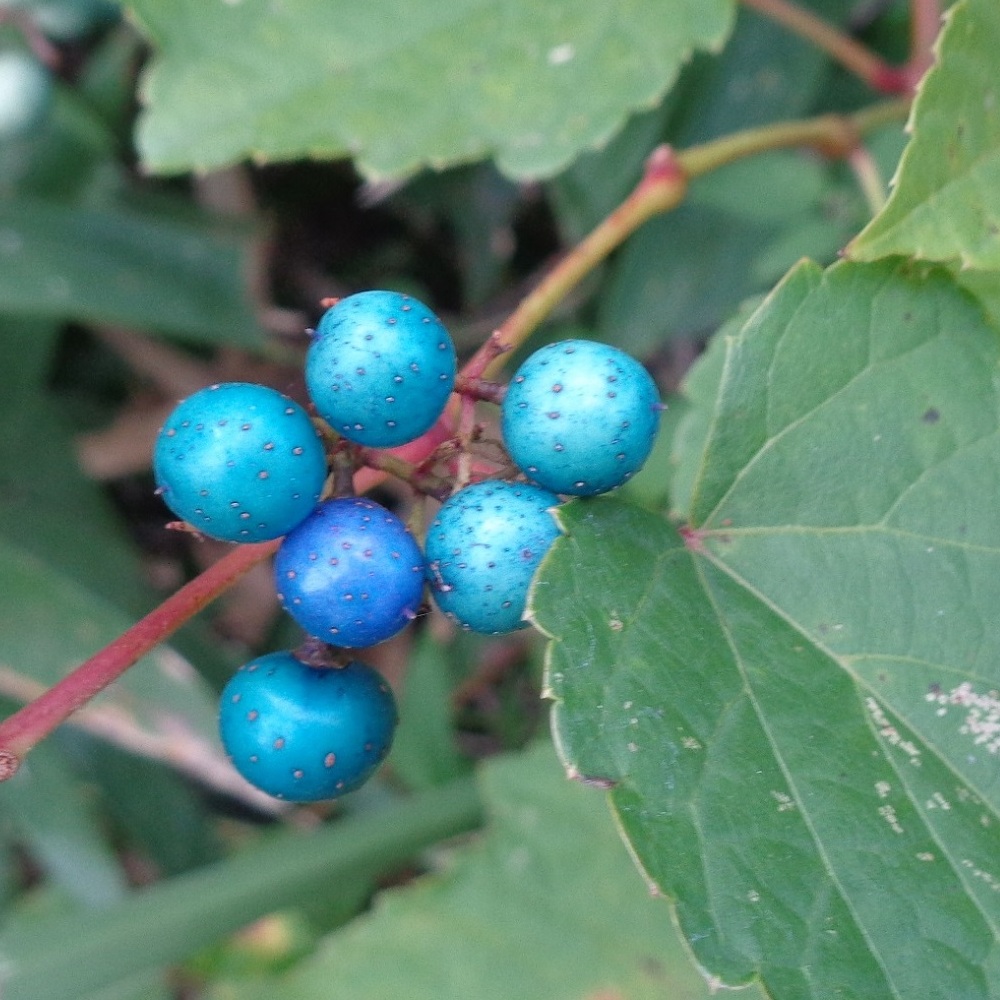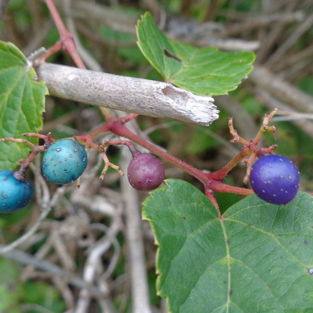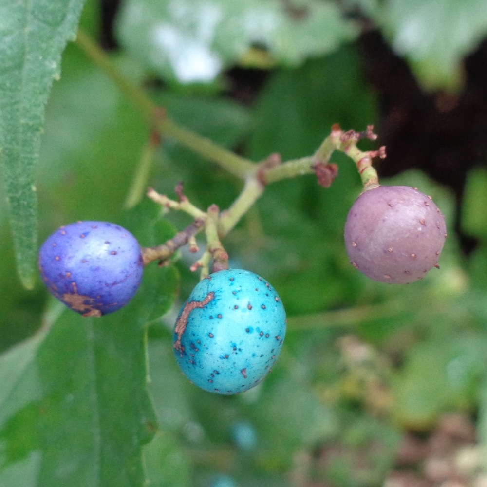 ②野葡萄(ノブドウ)の実が生っています。野に生える葡萄でこの名になりました。実の色の移り行く様が美しく別名「錦葡萄(ニシキブドウ)」と呼ばれています。