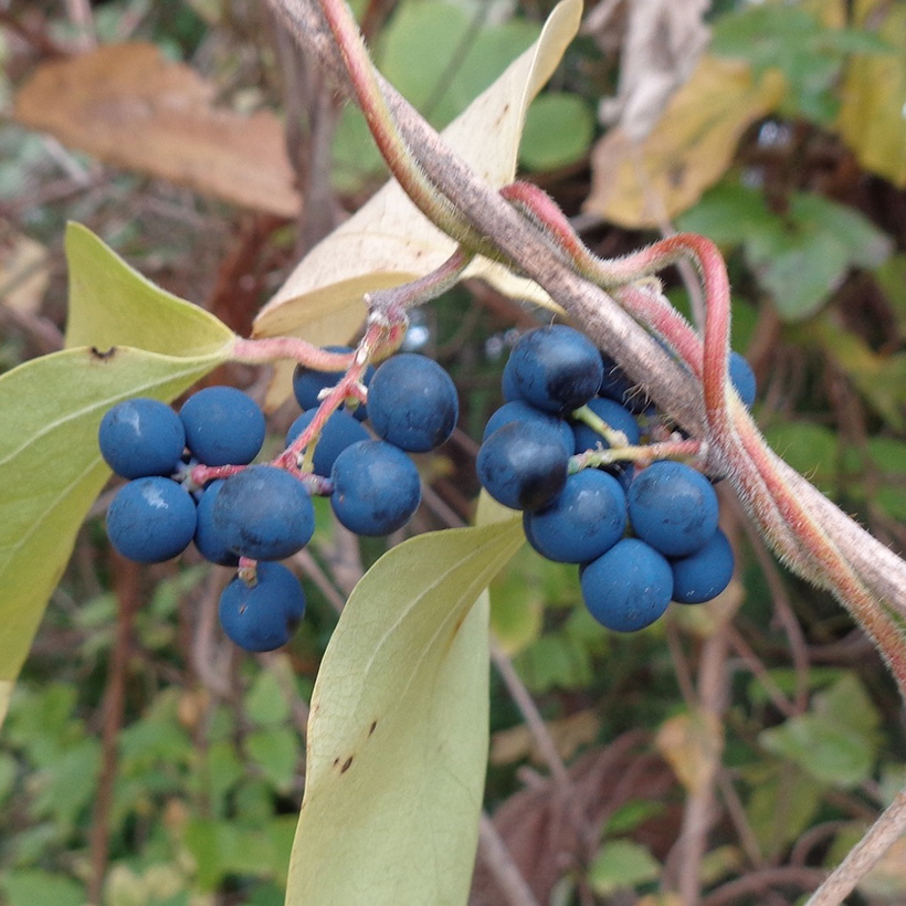 - ①青葛藤(アオツヅラフジ)の実が熟しています。直径6〜7mmの球形で藍黒色に熟し、白い粉を被っています。