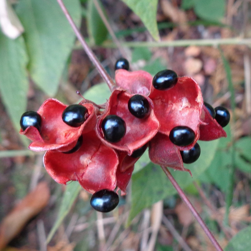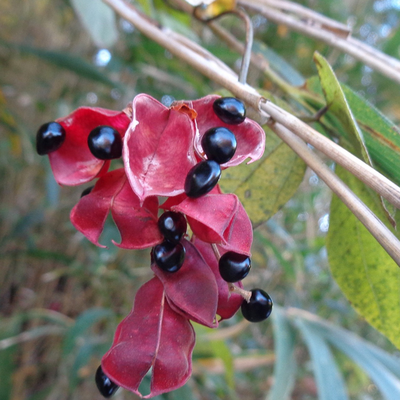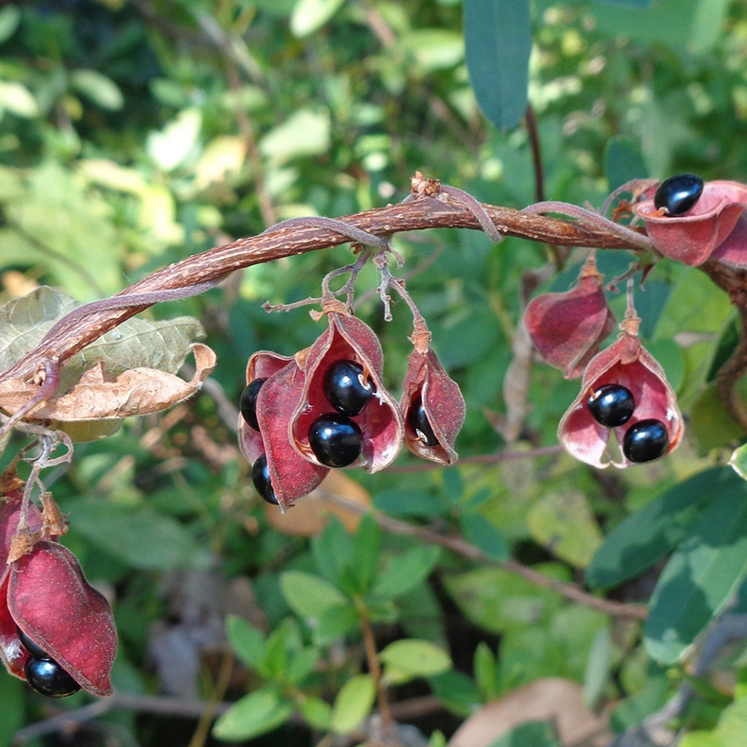 ②吐切豆(トキリマメ)の赤いサヤが割れ、中の黒いタネが目玉のように飛び出しています。