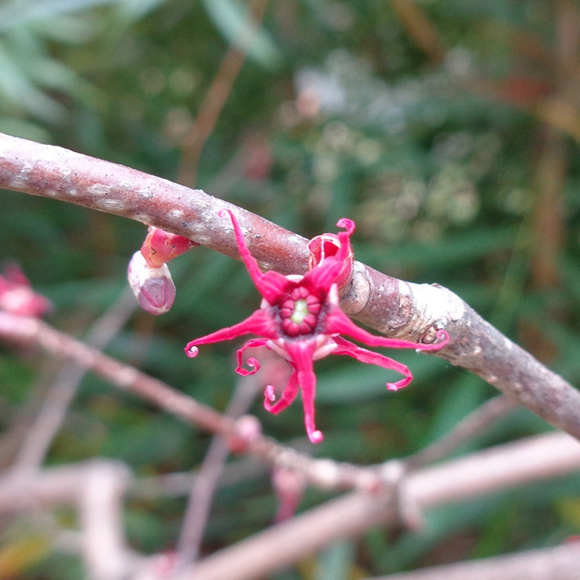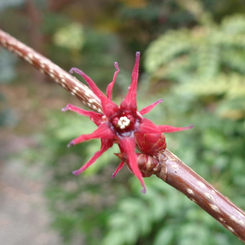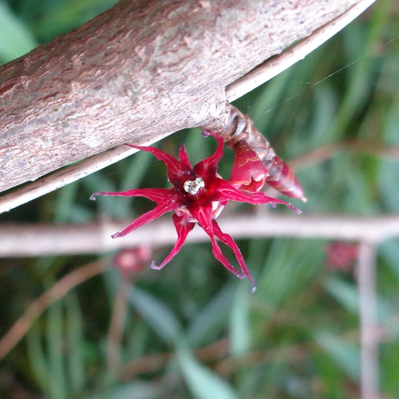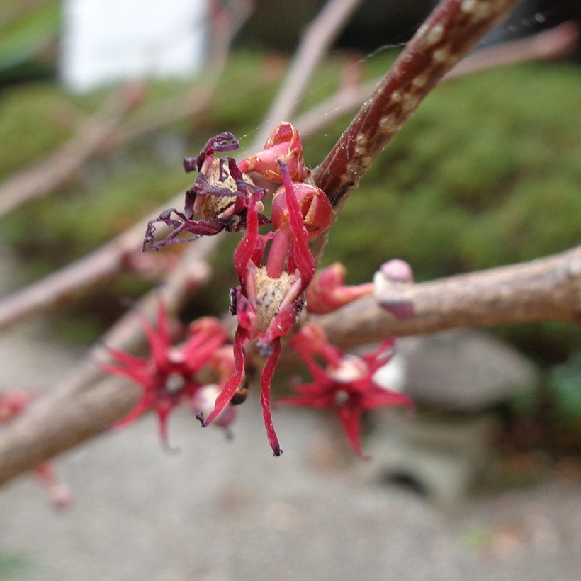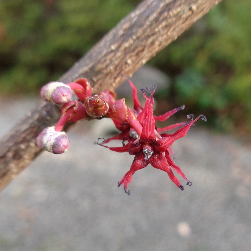 - ①丸葉の木(マルバノキ)が咲いています。直径15mm程のヒトデに似た暗い赤紫色の花です。長さ7mm程の縮れた花びらが5枚あり2つの花が背中合わせに咲くのが特徴です。葉が丸いのでこの名になりました。