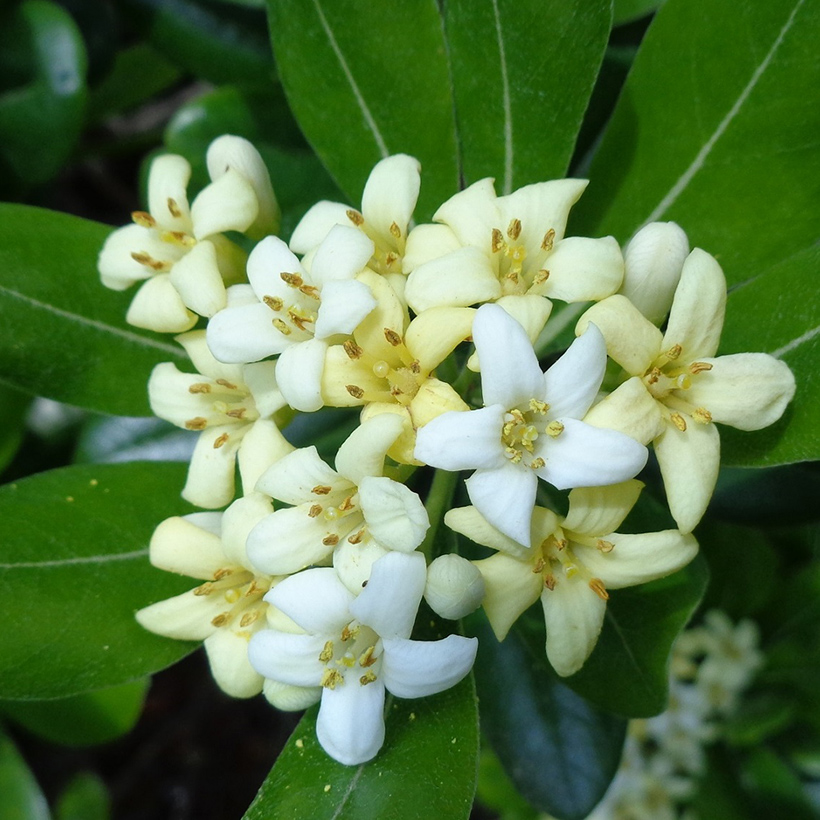 ③扉(トベラ)の実が熟して3つに割れ中からオレンジ色の種が顔を出しています。種は鳥の好物らしいですよ。