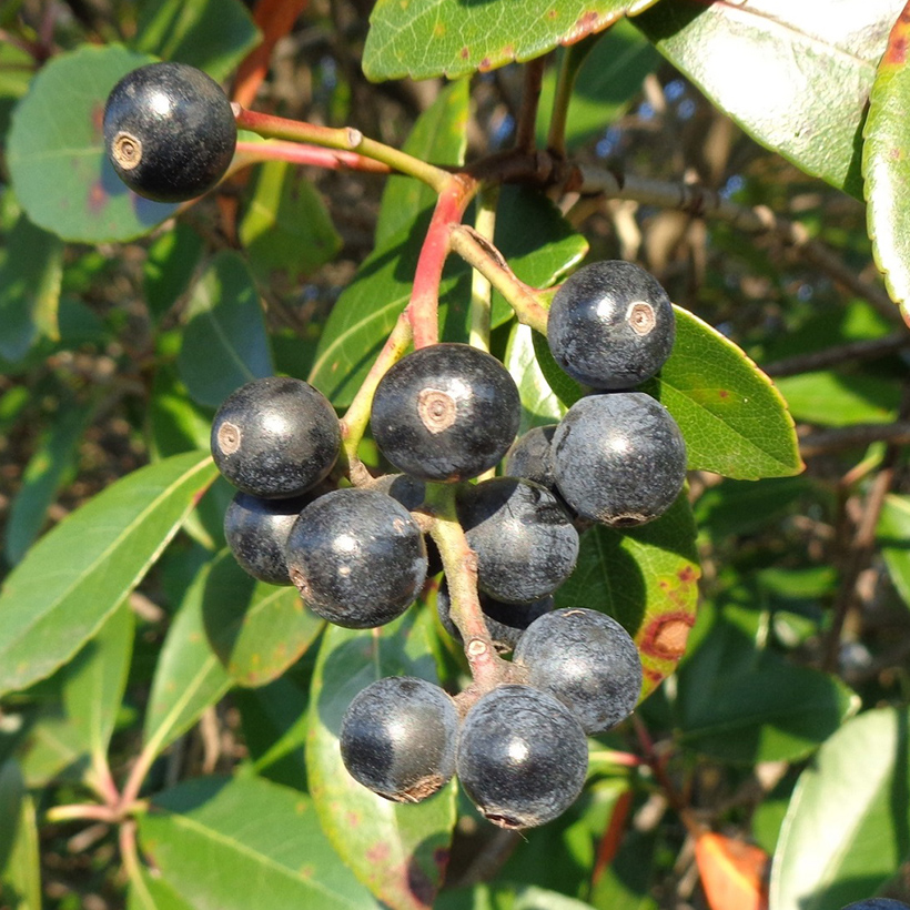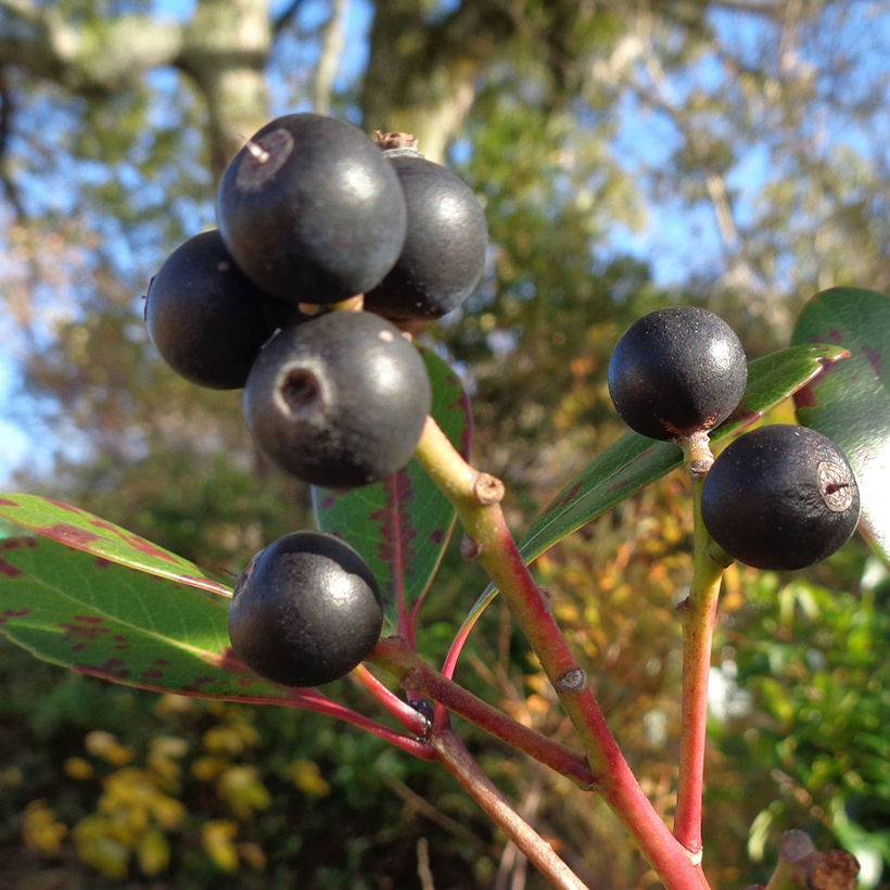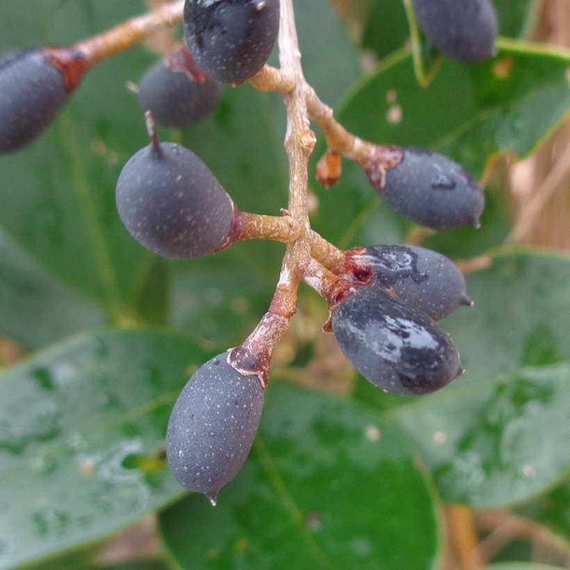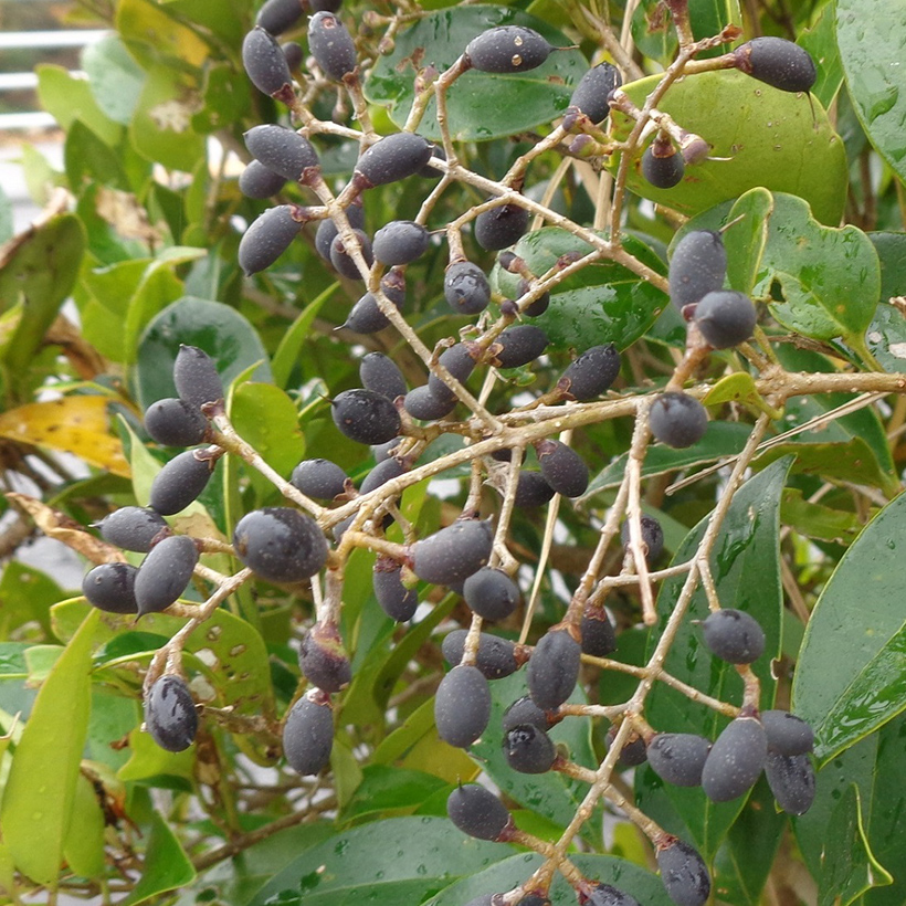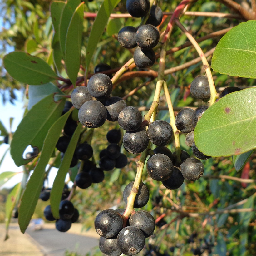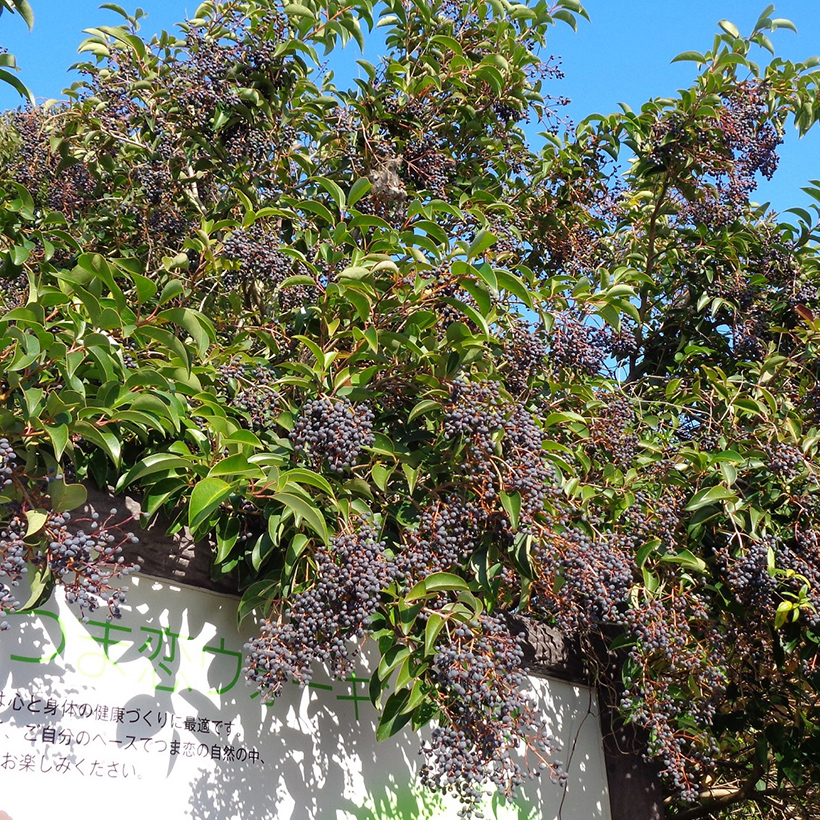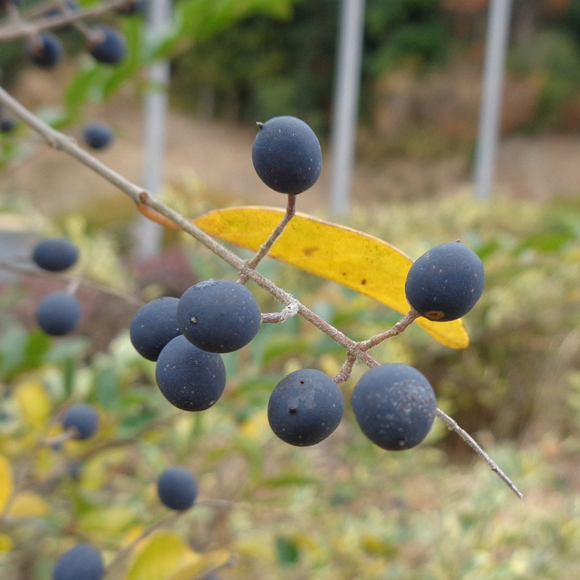 ②唐鼠糯(トウネズミモチ)の実が黒紫色に熟しています。実は球形に近い形で枝がしなる程たくさんなっています。