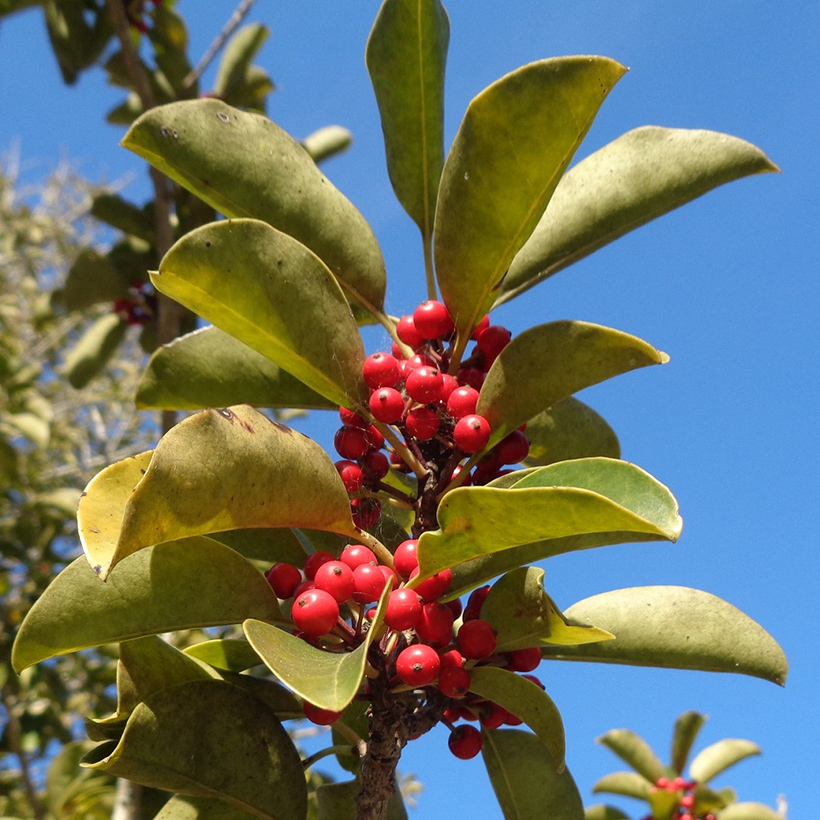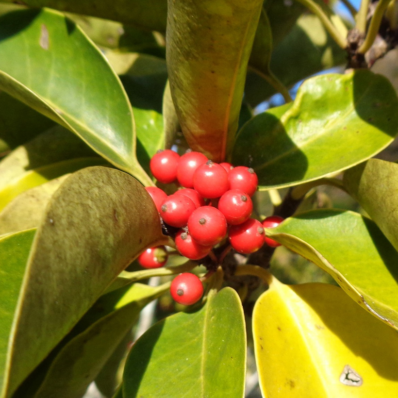 ②黒鉄黐(クロガネモチ)の実が赤く熟しています。「苦労せず金持ちになる」と縁起のいい庭木として愛されています。