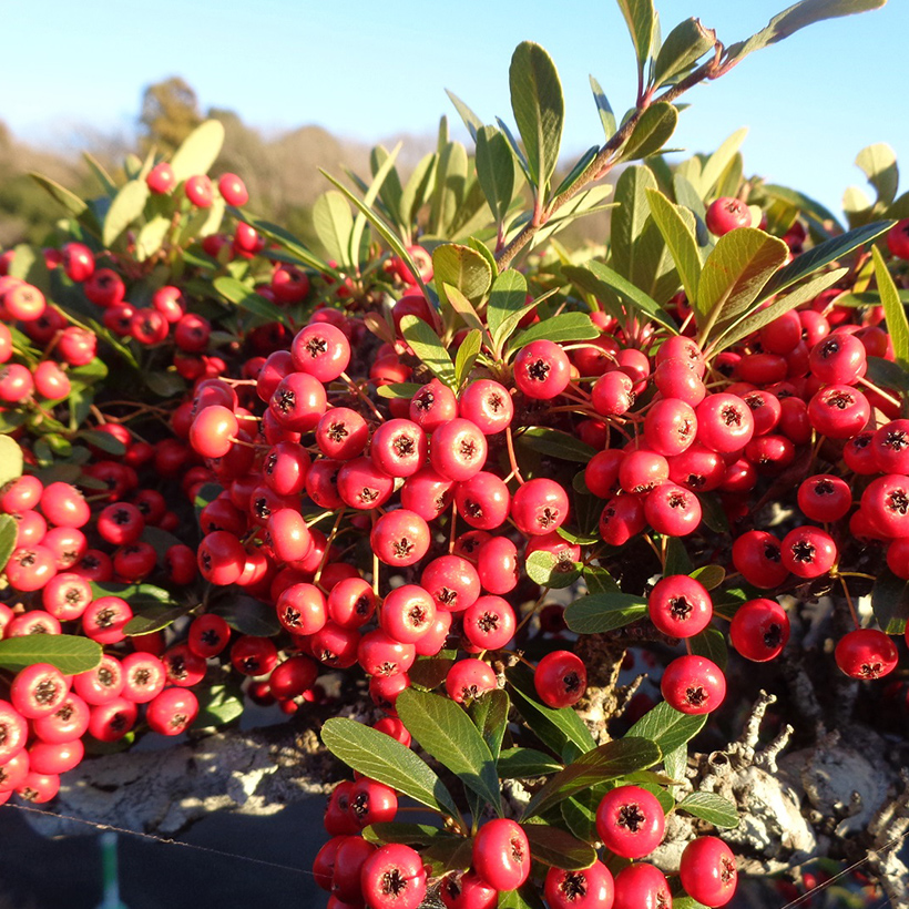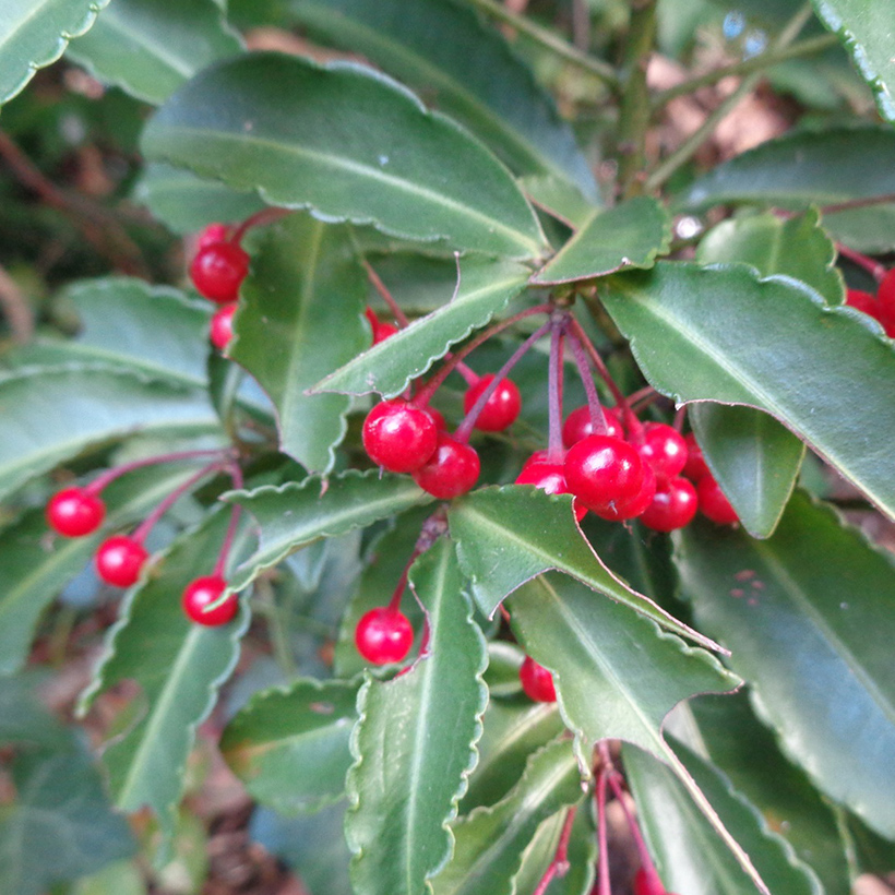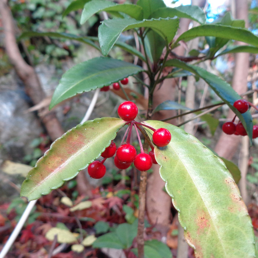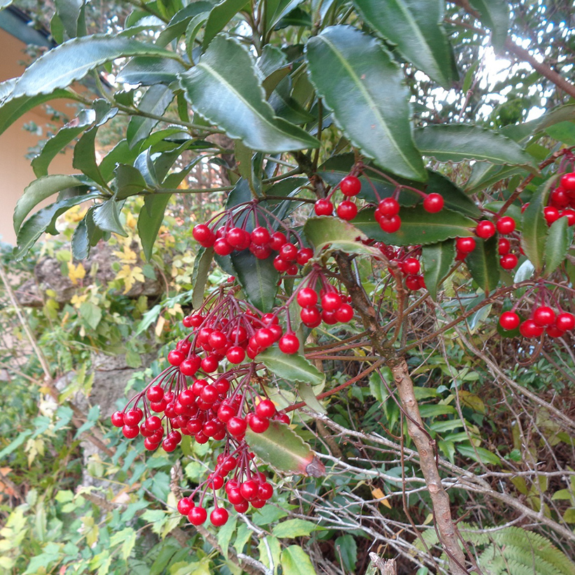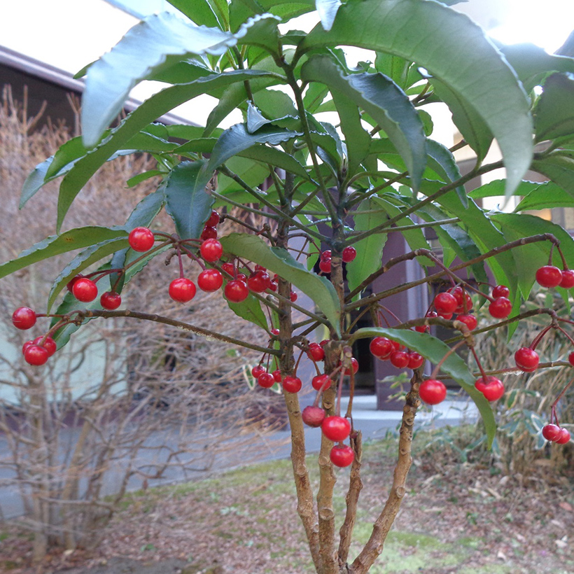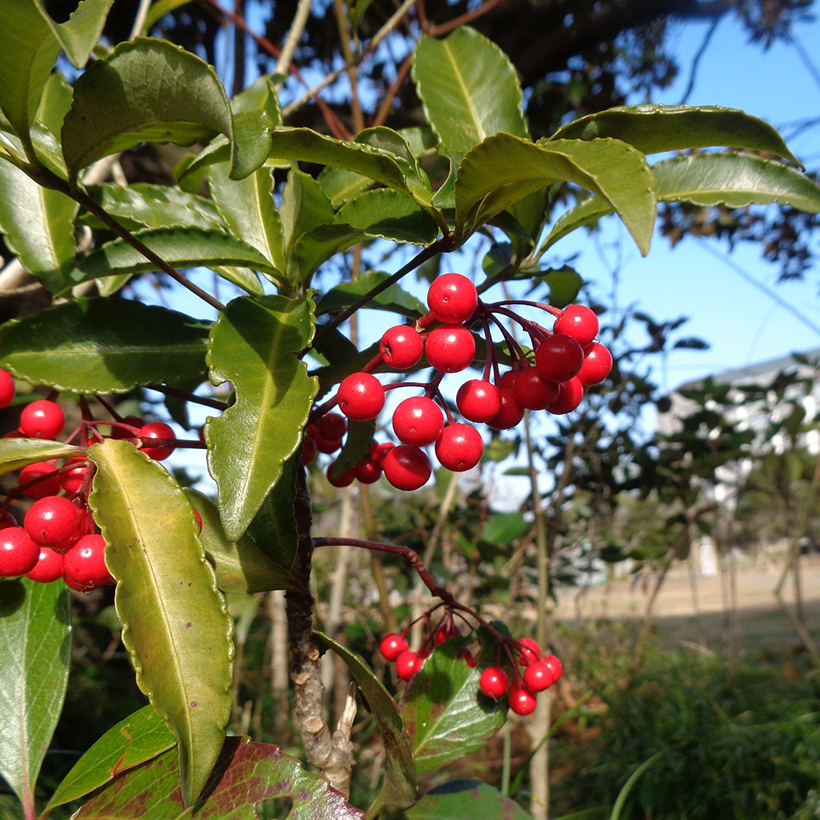 ②柃(ヒサカキ)の実が枝いっぱいについています。柃は榊(サカキ)の代用として神事に使われる縁起のいい木です。