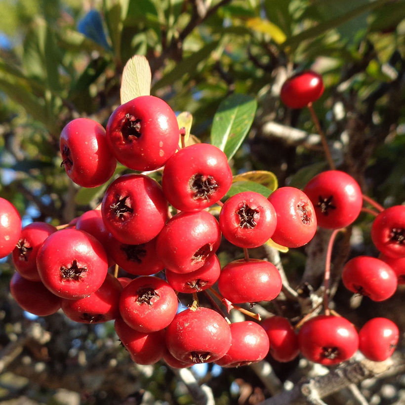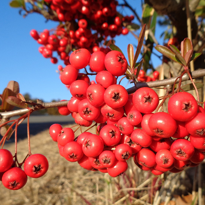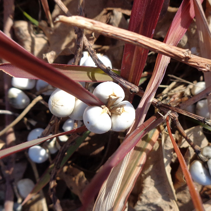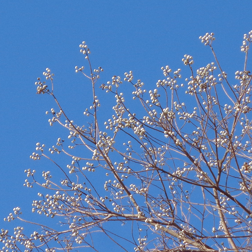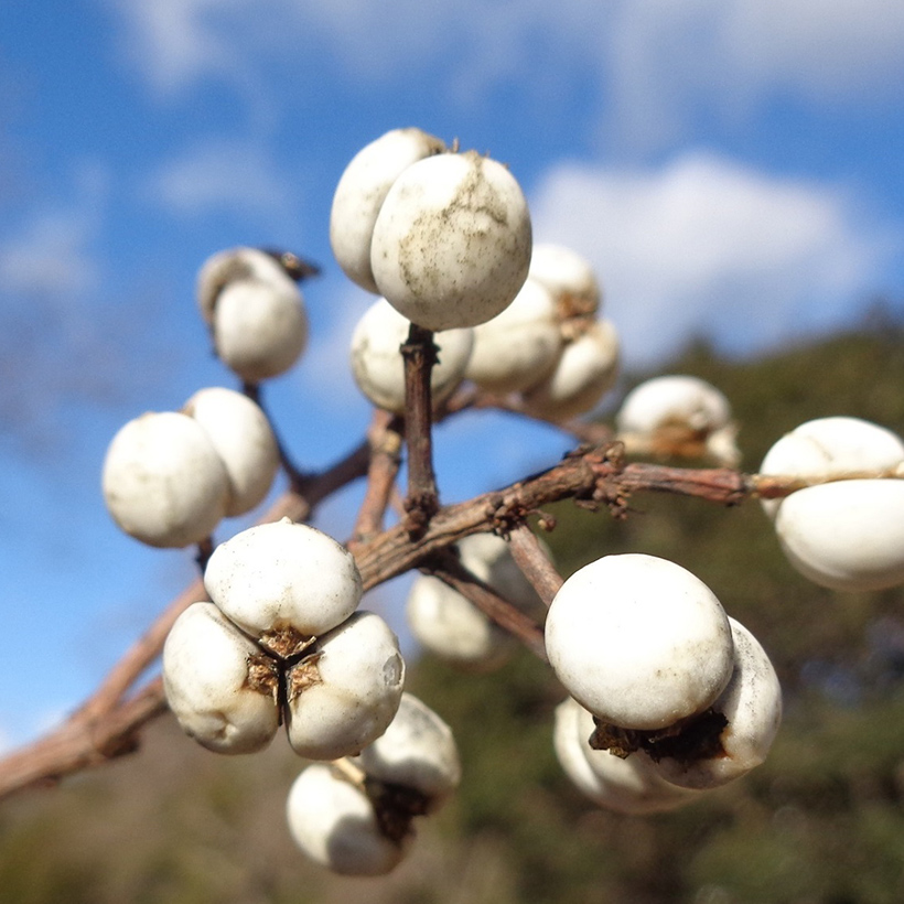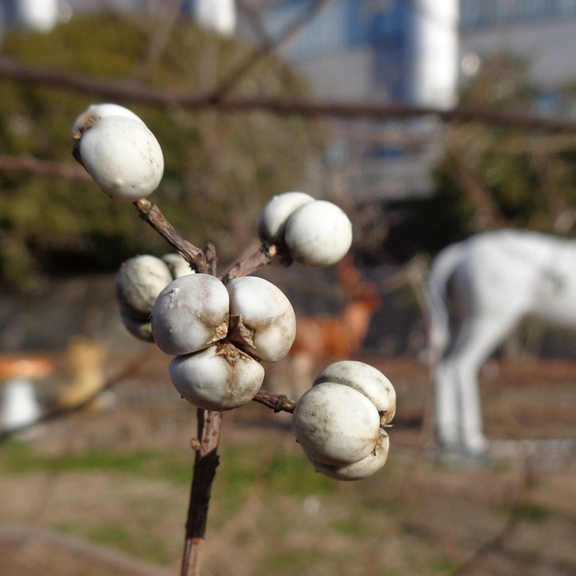 - ①南京櫨(ナンキンハゼ)の種子がきれいです。食料の少ないこの時期は、種を食べに野鳥たちが集まりとても賑やかです。種子の周りの白い部分からは蝋の成分が採れて蝋燭の材料になります。