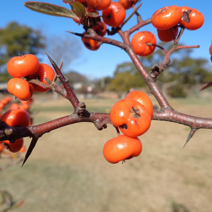 - ①正面北ゲート生垣の柾(マサキ)の実が割れて、鮮やかなオレンジ色の種子が顔を出しとてもきれいです。