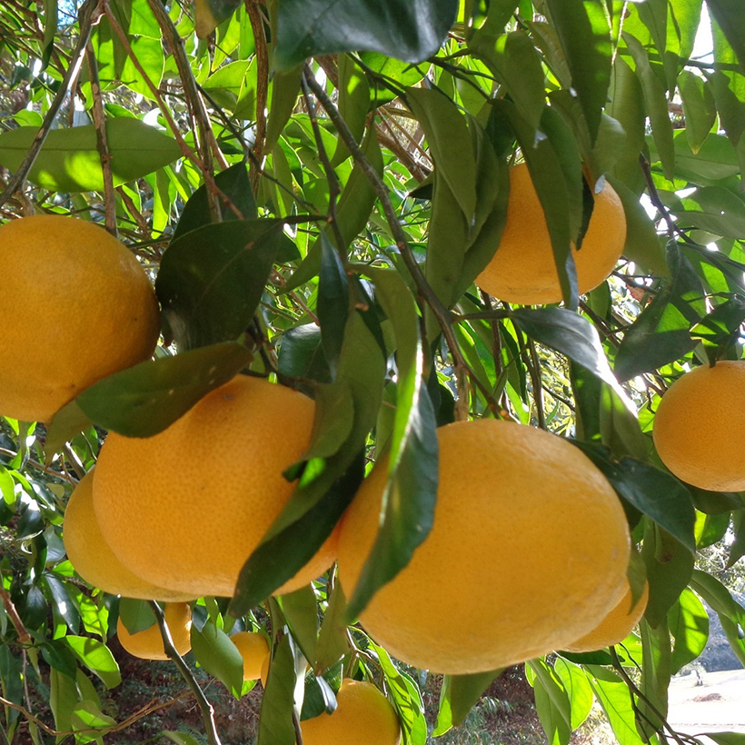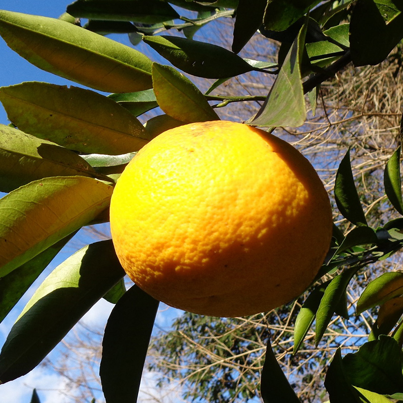 - ①夏蜜柑(ナツミカン)の実が生っています。本当の呼び名は「夏橙(ナツダイダイ)」ですが、商品名として今一だったので明治末頃から「夏みかん」と呼ばれるようになりました。また夏が食べ頃なのが名の由来とも言われます。
