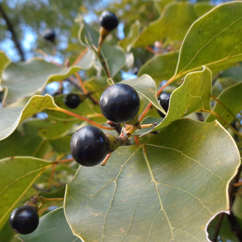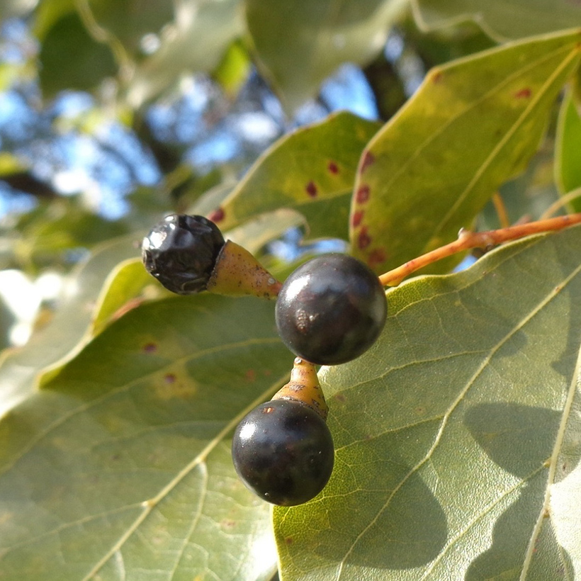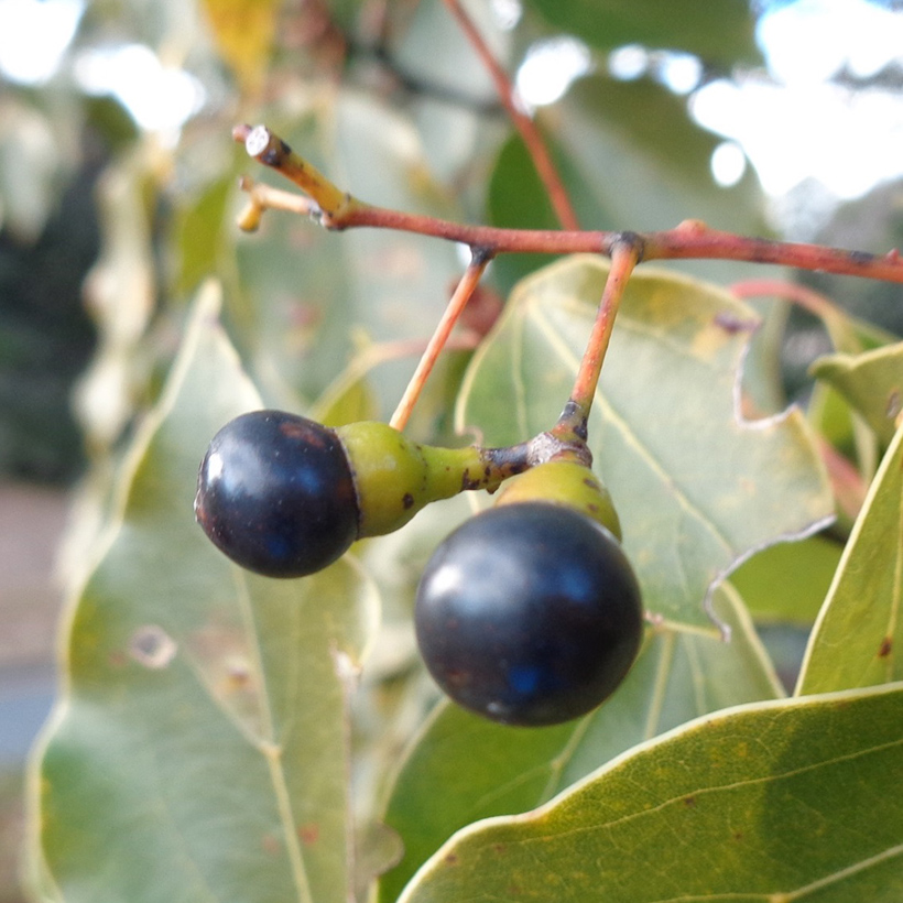 ①楠(クスノキ)の実が熟しています。艶のある黒い実は樟脳の香りがして美味しくないのでまだたくさん残っています。