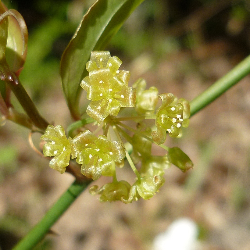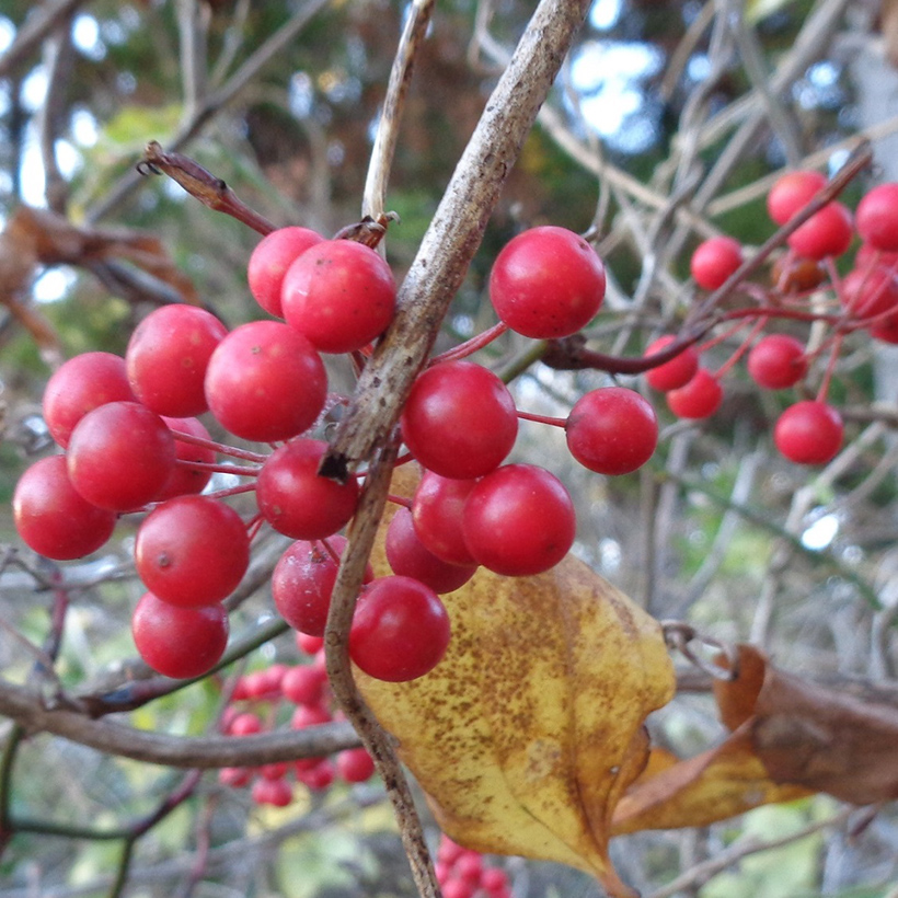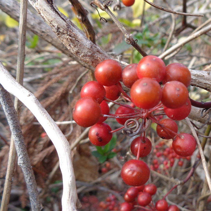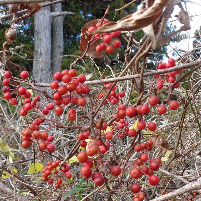 ③猿捕茨(サルトリイバラ)の実が熟しています。ツルにたくさんついた赤い実はクリスマス飾りに使われます。